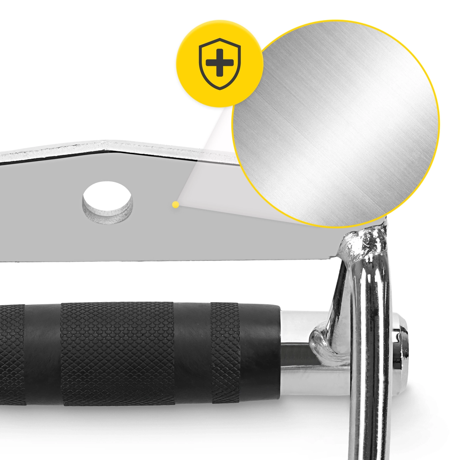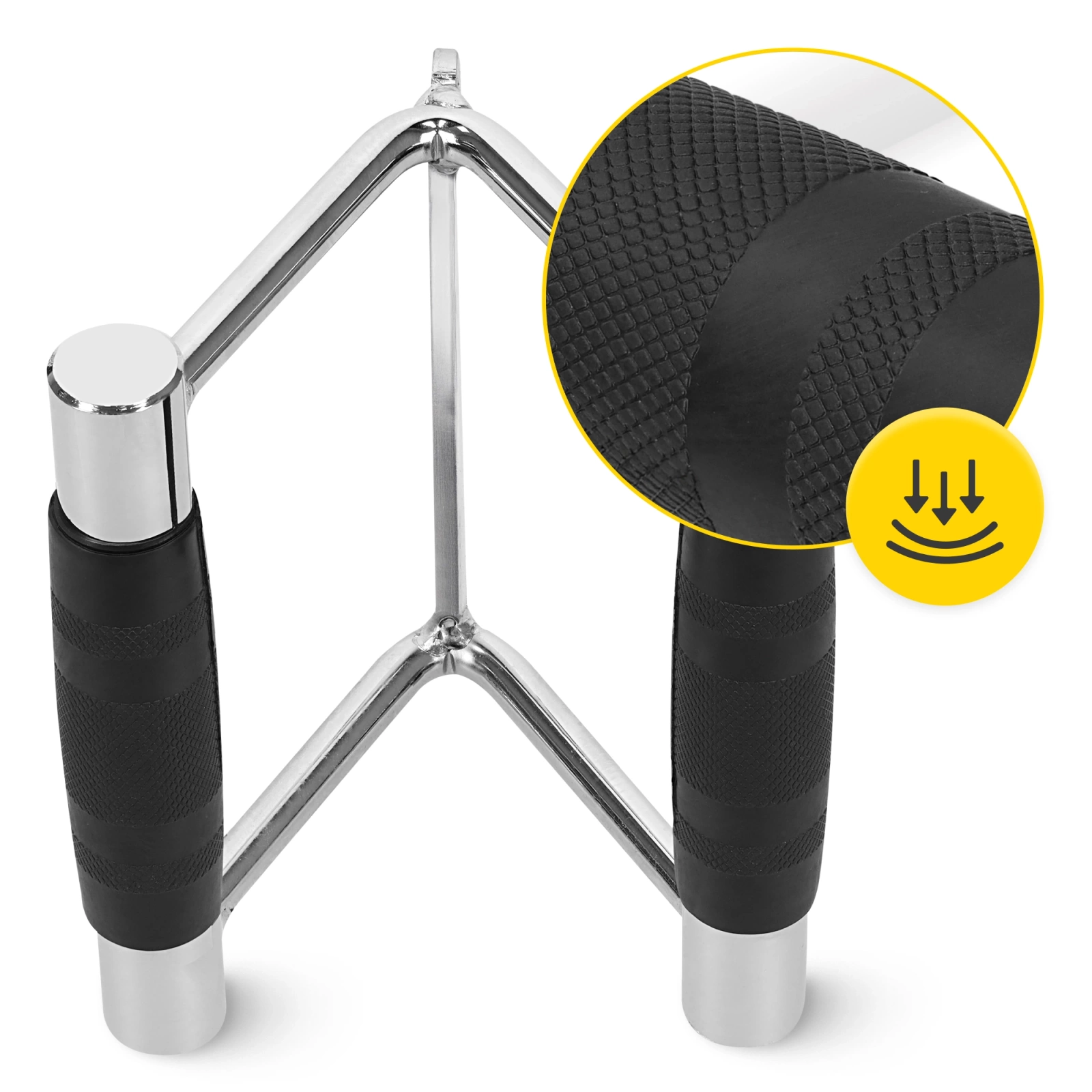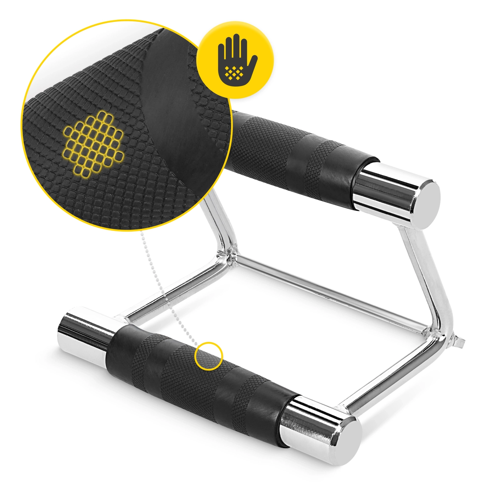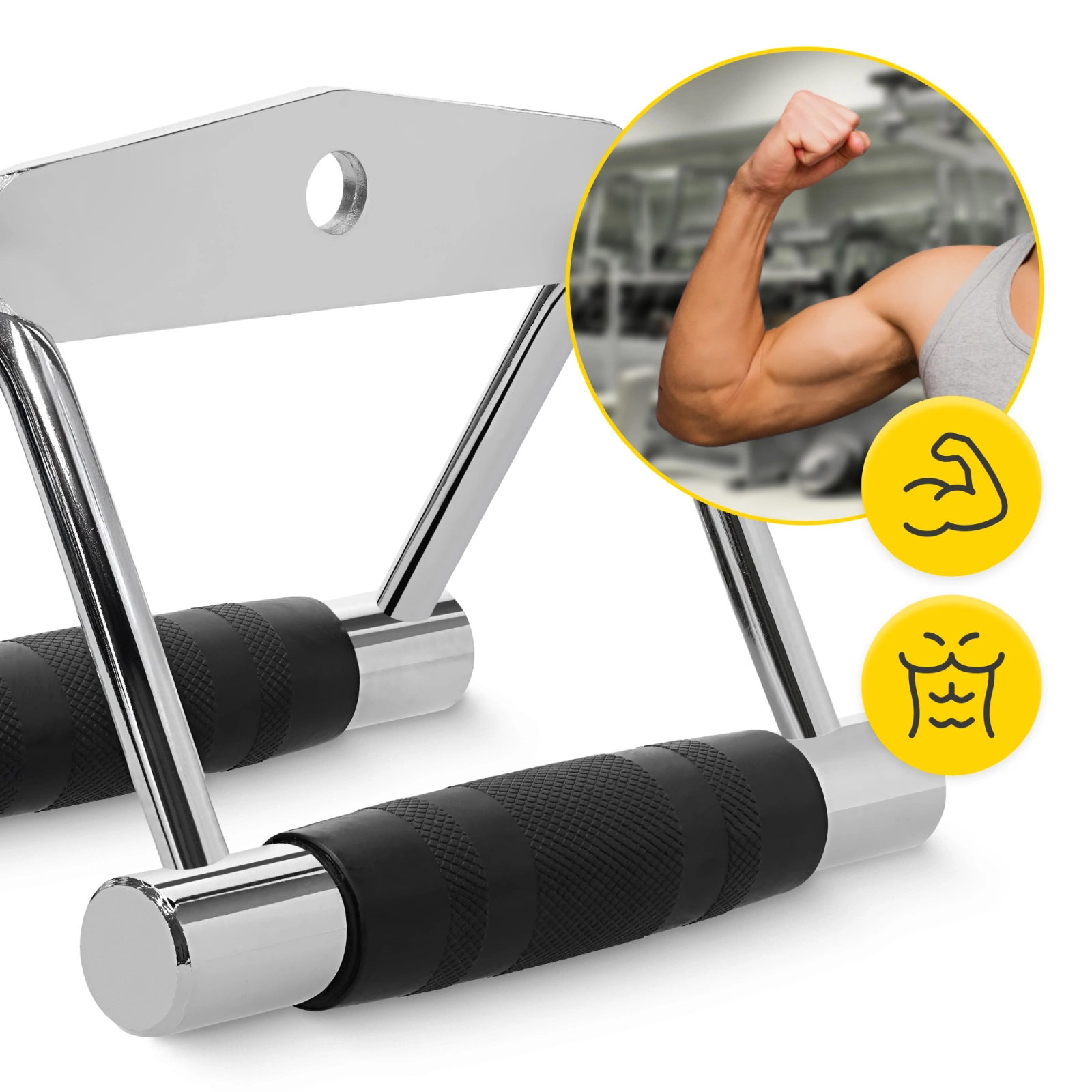 ✅ Az atlasz emelőfogantyú gumi markolattal lett ellátva, amely megakadályozza, hogy a fogantyú kicsússzon a kezedből edzés közben, ami rendkívül hasznos, ha nehéz terhekkel edzel.