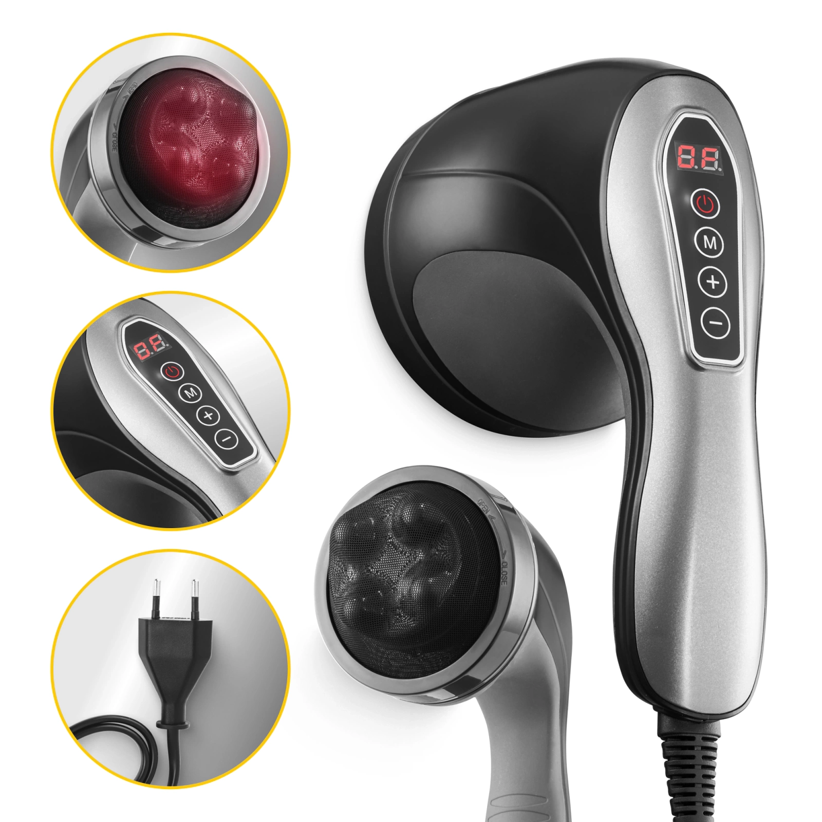A Body Shaping 4FIZJO kézi karcsúsító testmasszírozó egy modern termék stílusos kialakítással. Funkcionális, praktikus és intuitív a használata. A kényelmes fogantyú megengedi, hogy önállóan masszírozza a fájdalmas testrészeket. Az elektromos anticellulit masszázsgép egy kijelzővel és 4 gombbal ellátott vezérlőpanellel van felszerelve. Ráadásul előnyei közé tartozik a forgatható masszázsfejek és a melegítő funkció. Ez utóbbi különösen hasznos termoterápia, vagy melegkezelés esetén.
