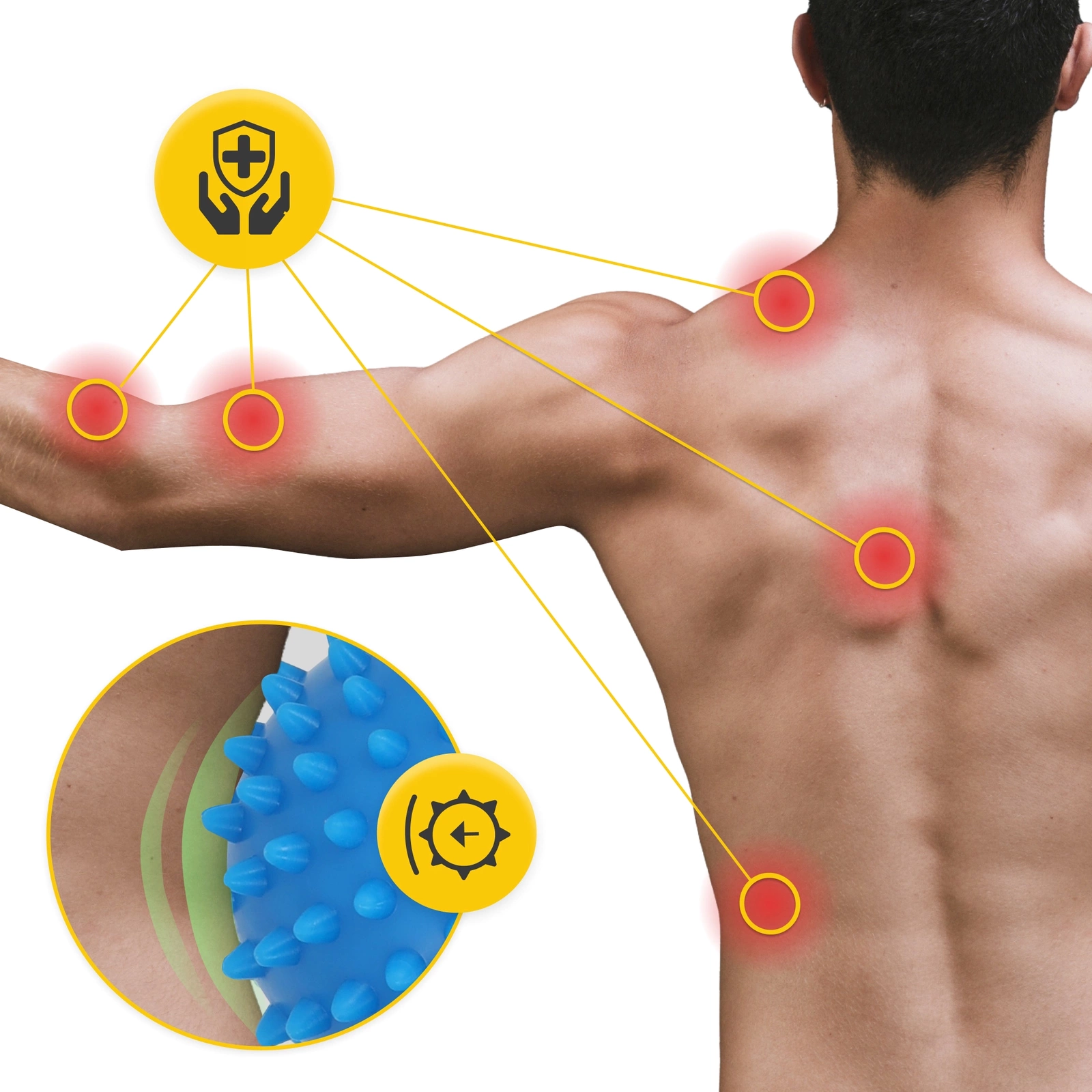 ALKALMAZÁS: A masszázslabdák a helyi fájdalmak csökkentésének, a túlzottan feszült izmok ellazításának eszközei. Ez lehetővé teszi a masszázs önálló otthoni elvégzését. Edzők, fizioterapeuták és sportolók számára készült.