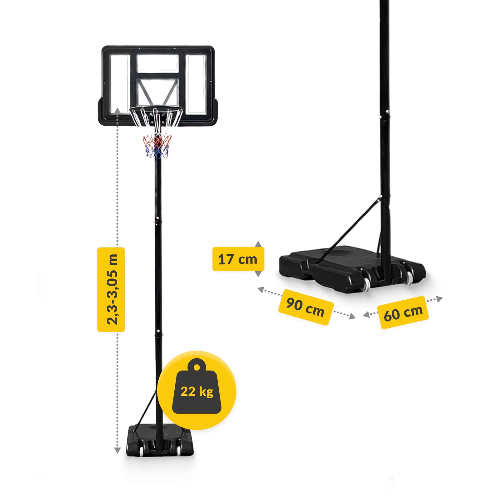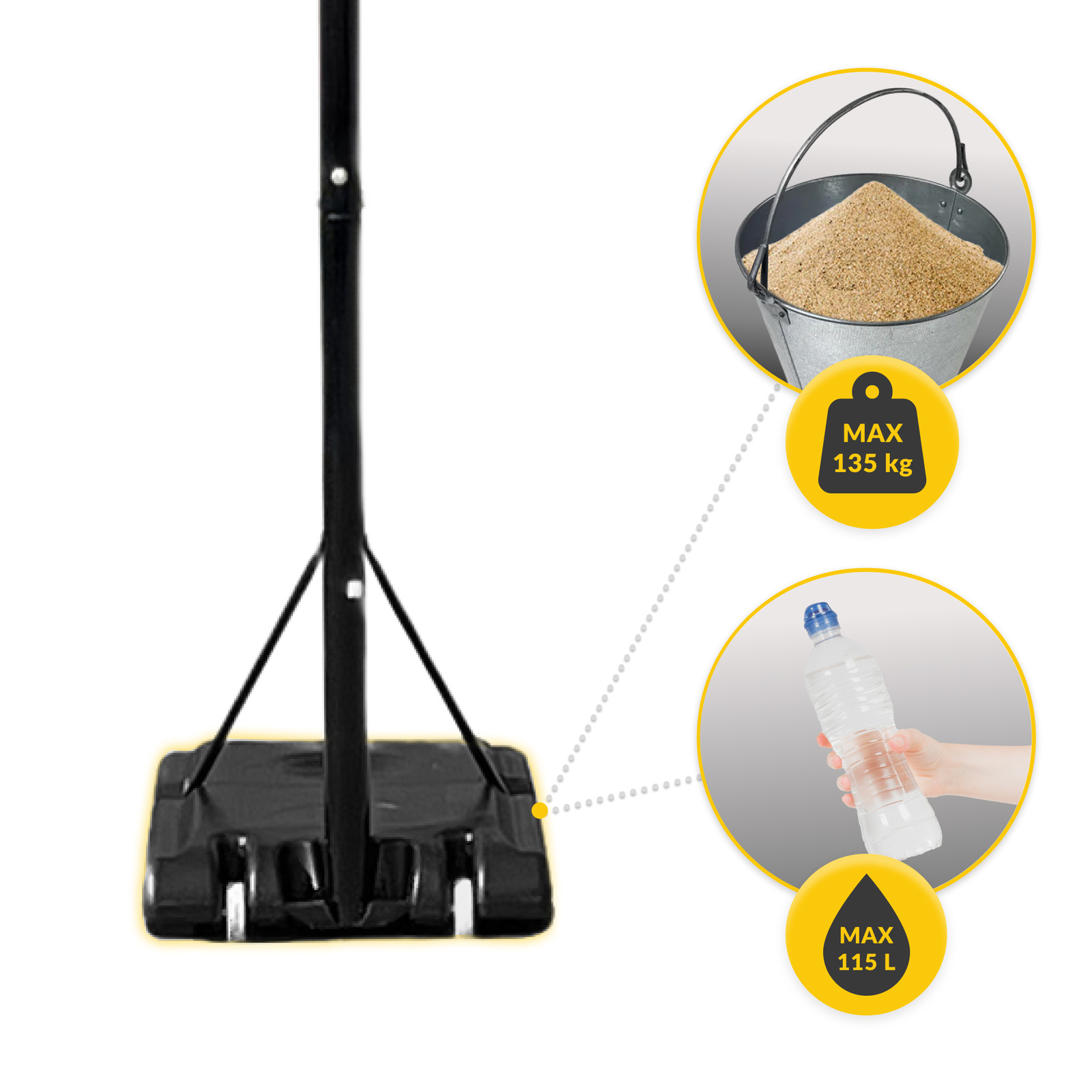 A legjobbak legjobbja - ez a FALCONjátékkosár, amellyel a lehetetlent is elérheted. A stabil teleszkópos szerkezet, amely mindenféle dobást kibír, tartós acélból készült. Másrészt a stabilitást gyakorlás és kosárlabdázás közben a tágas talp biztosítja. Az egyensúlyt szeretné elérni, és biztos akar lenni abban, hogy az egész állvány a peremmel együtt szilárdan rögzül a talajhoz?Töltse meg az alapot 135 kg homokkal vagy 115 liter vízzel. A kényelmes szállítást bármely kívánt helyre lehetővé teszik a kiegészítő görgők.