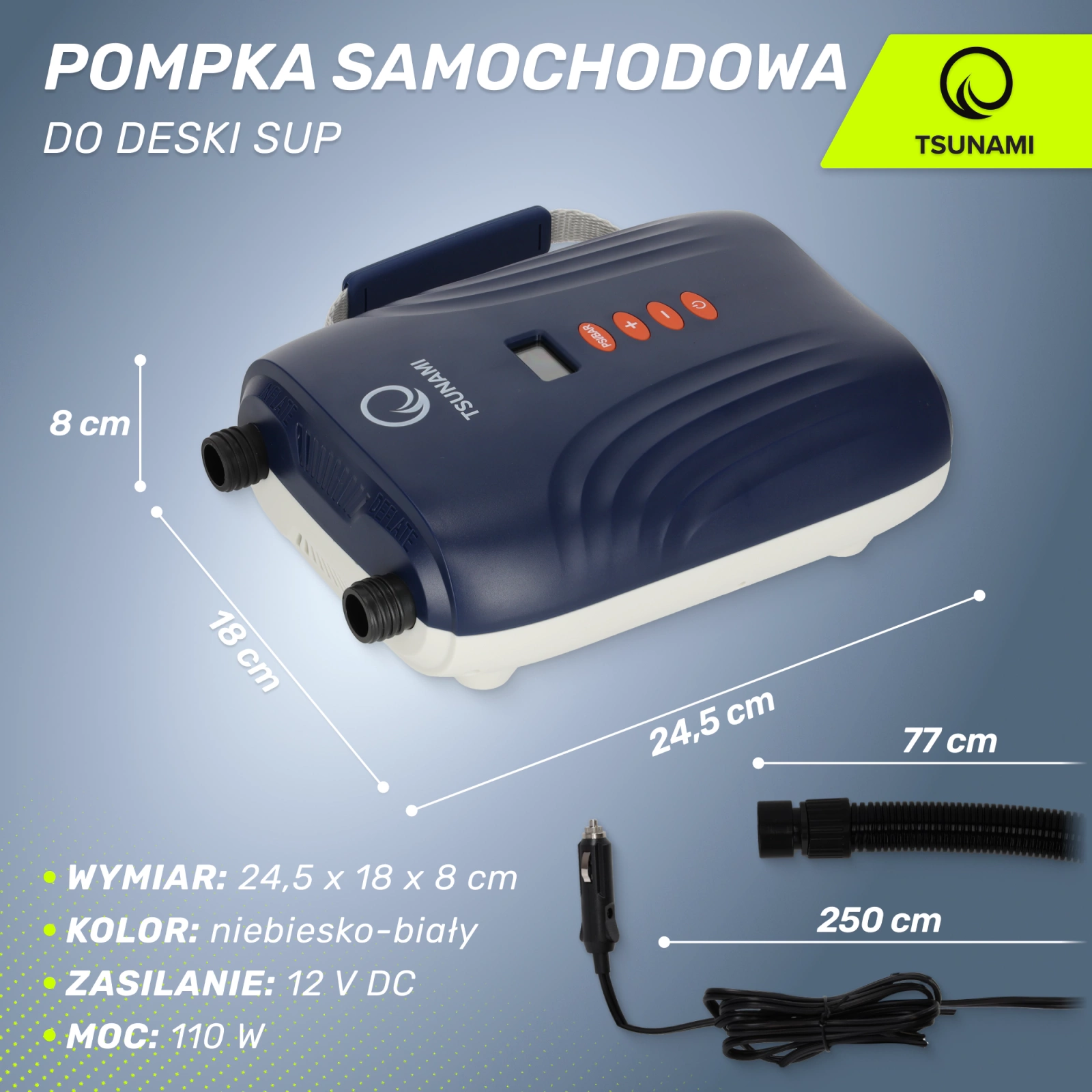 A TSUNAMI nagy teljesítményű SUP deszkapumpa kompakt méretekkel rendelkezik. <A klasszikus autós aljzatról működik. Egy szivargyújtó csatlakozóval rendelkezik 12 voltos feszültséghez. Ezért kiváló választás azoknak, akik autóval, lakóautóval vagy furgonnal utaznak. A hosszú kábelnek köszönhetően könnyedén feltöltheti SUP deszkáját, míg a ergonomikus fogantyú segítségével a pumpa könnyen hordozható és szállítható.