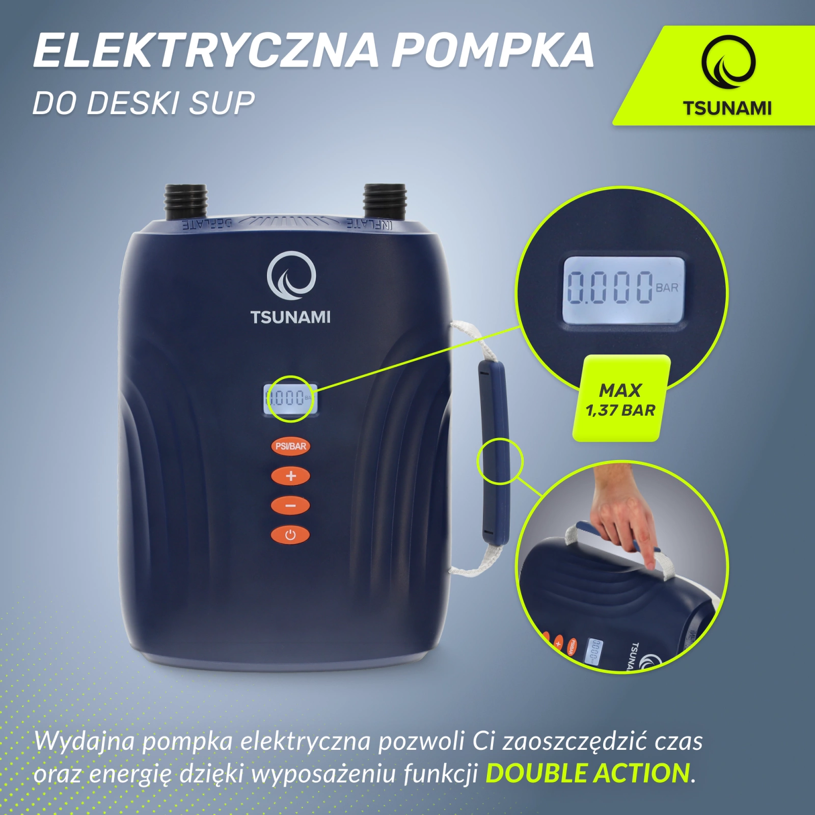 Szeretné könnyedén, percek alatt felfújni SUP deszkáját? A TSUNAMI elektromos autószivattyúval időt és energiát takaríthat meg.Ez a Double Actionfunkciónak köszönhetően lehetséges - kétfokozatú pumpálás. Az első fokozat a levegő alacsony nyomáson történő beszivattyúzásáért felelős. A második lehetővé teszi a levegő magas nyomáson történő beszivattyúzását.