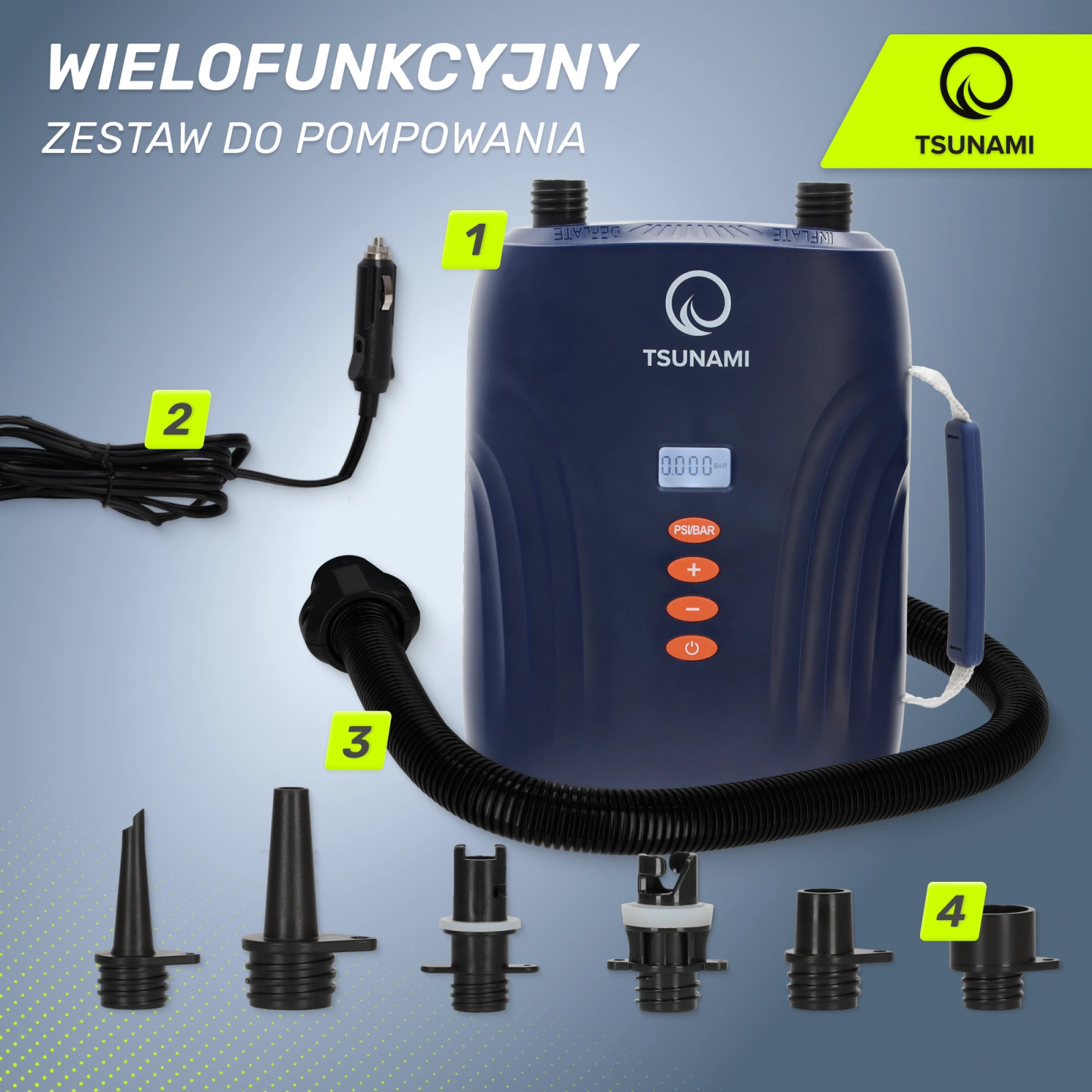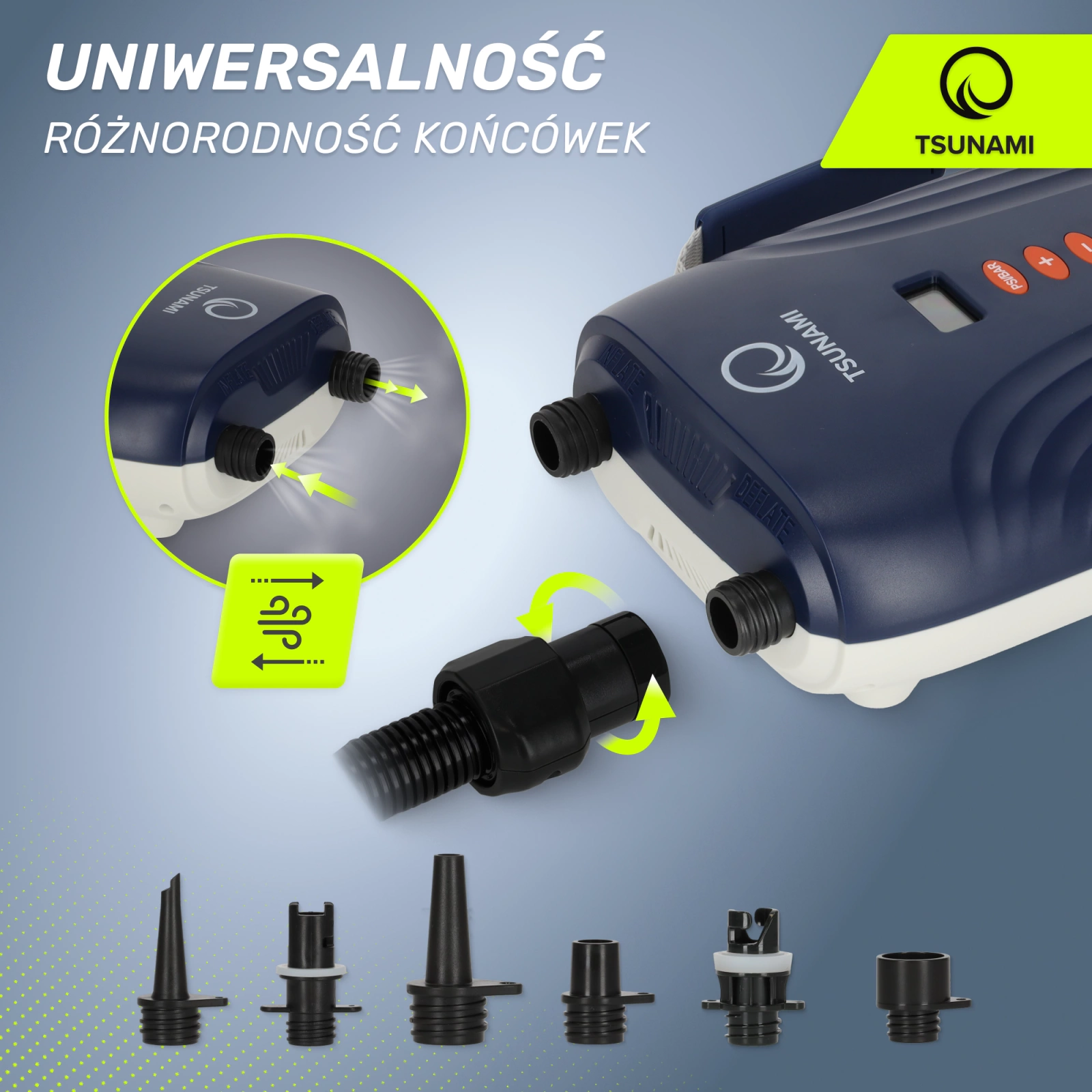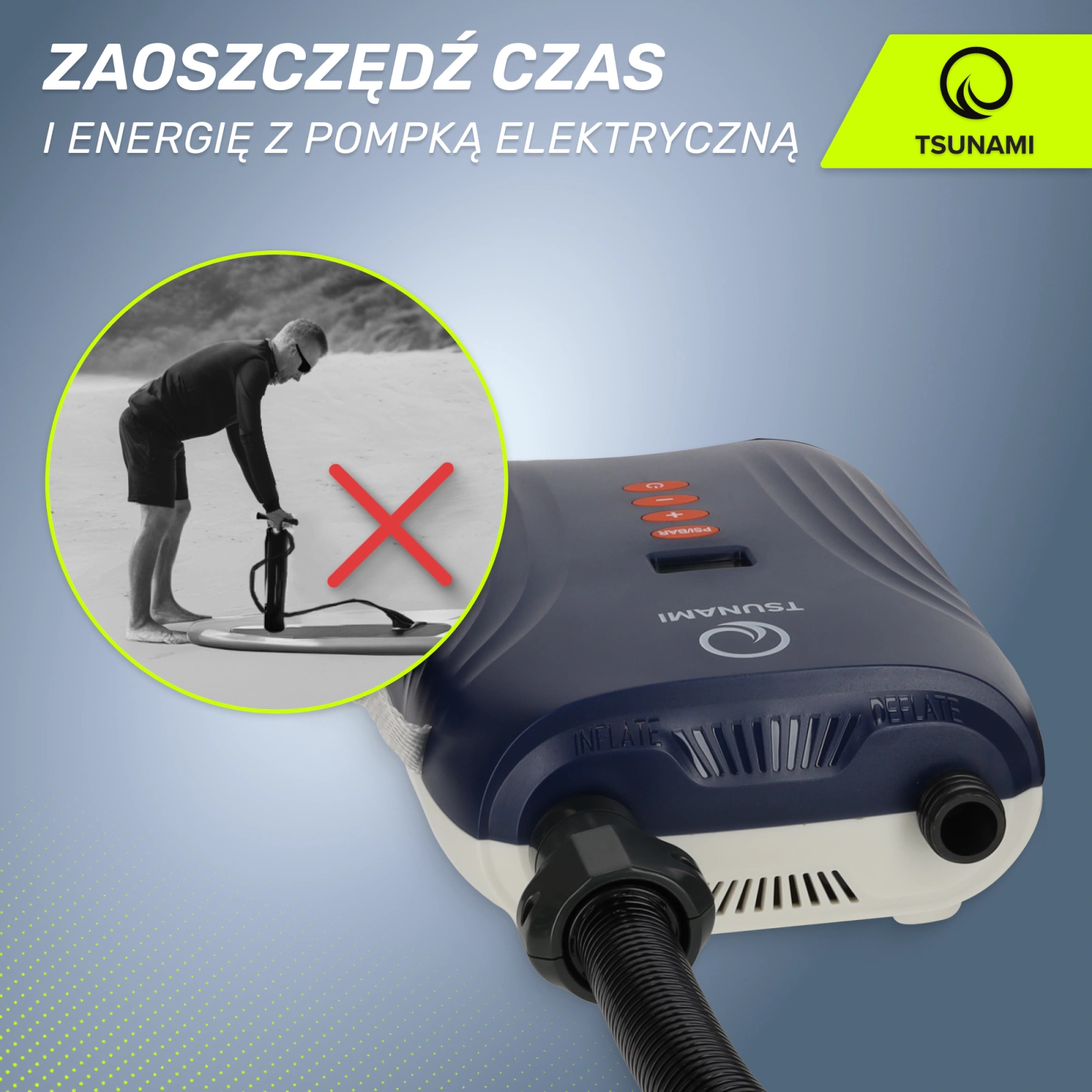 A TSUNAMI elektromos SUP pumpa egy intelligens 2 az 1-ben készülék. Egyesíti a szivattyúzási és a pumpálási funkciókat. Szabja a terméket az Ön igényeihez - olvassa el paramétereit és funkcióit.