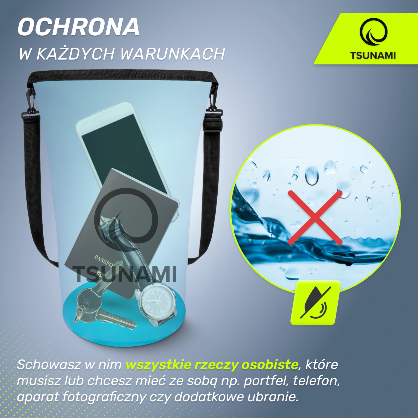 Menjen kajakozni, csónakázni, SUP deszkázni, raftingolni és vitorlázni anélkül, hogy aggódnia kellene amiatt, hogy telefonja, iratai vagy ruhái vizesek lesznek.A TSUNAMI vízálló sporttáskával nem kell félnie a hullámoktól vagy az esőtől, még a heves esőtől sem! Soha többé nem rontja el a nyaralás hangulatát, ha véletlenül elázik a holmija.