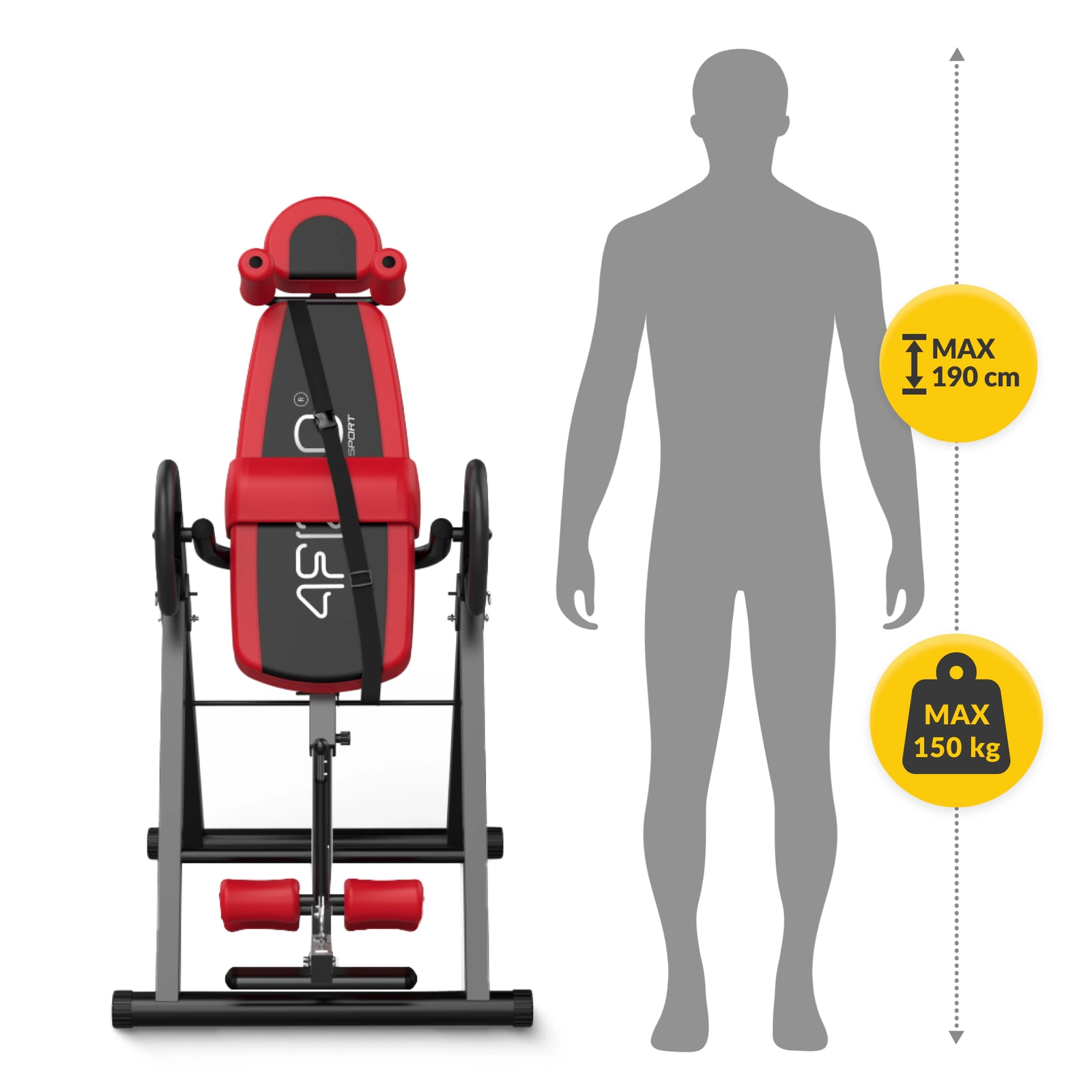 A 4FIZJO inverziós edzőpad lehetővé teszi nyújtó és rehabilitációs gyakorlatok végzését a gerinc számára. A váz gyártásához acélt használtak, ami hozzájárul a szerkezet tartósságához. A háttámla és a fejtámla magas minőségű öko bőrből készült, a kárpitozás pedig puha habbal van töltve, ami garantálja a kényelmet.