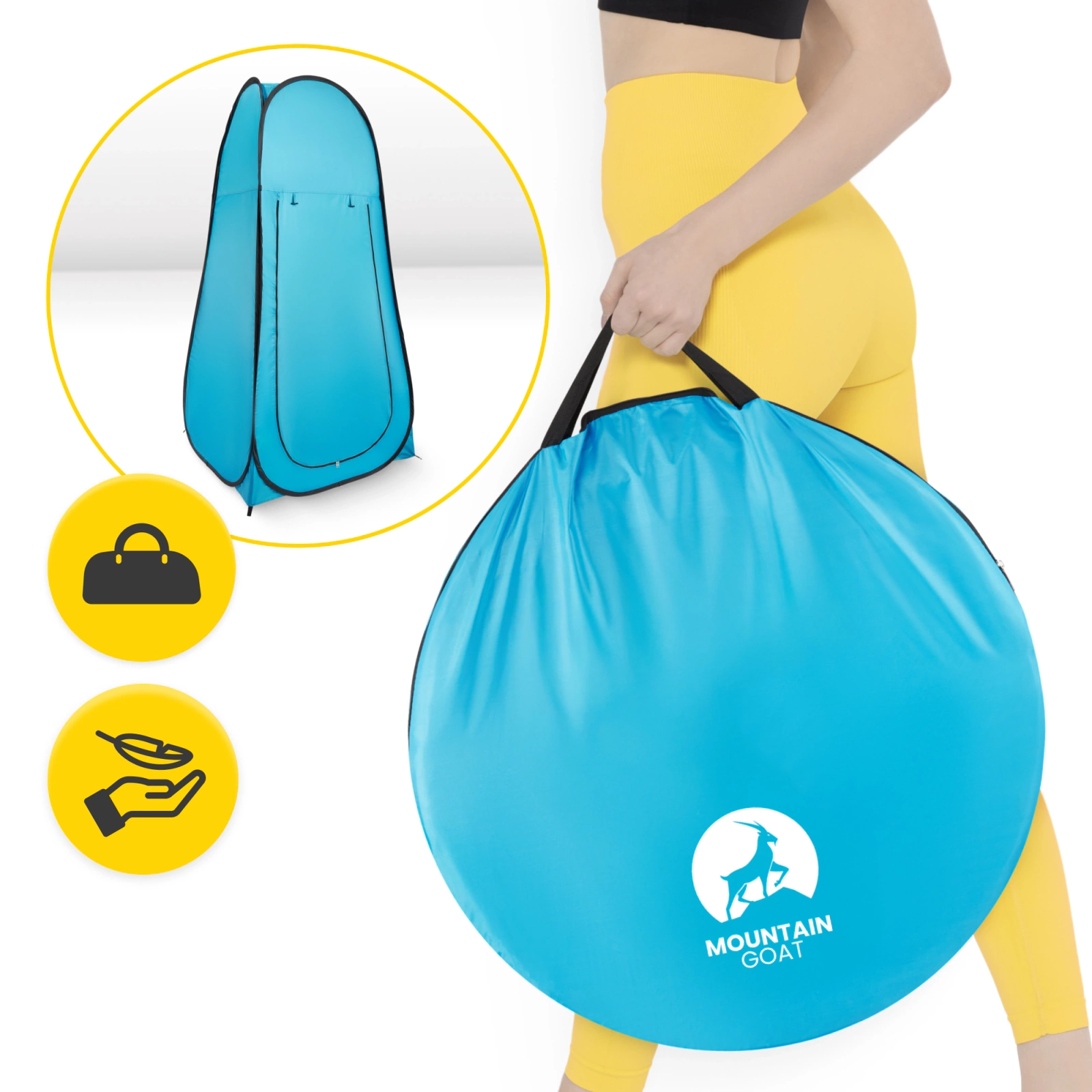 A MOUNTAIN GOAT POP-UP hordozható öltözősátra minden helyzetben a kényelemről és a diszkrécióról szól. Előnye a sokoldalúságában rejlik, így jól működik akkor is, ha nincs hozzáférése öltözőhöz vagy fürdőszobához. Emiatt érdemes pl. sátrak alá, kempingbe, kempingbe, strandra, parlagon heverészésre vagy többnapos kenutúrára vinni.
