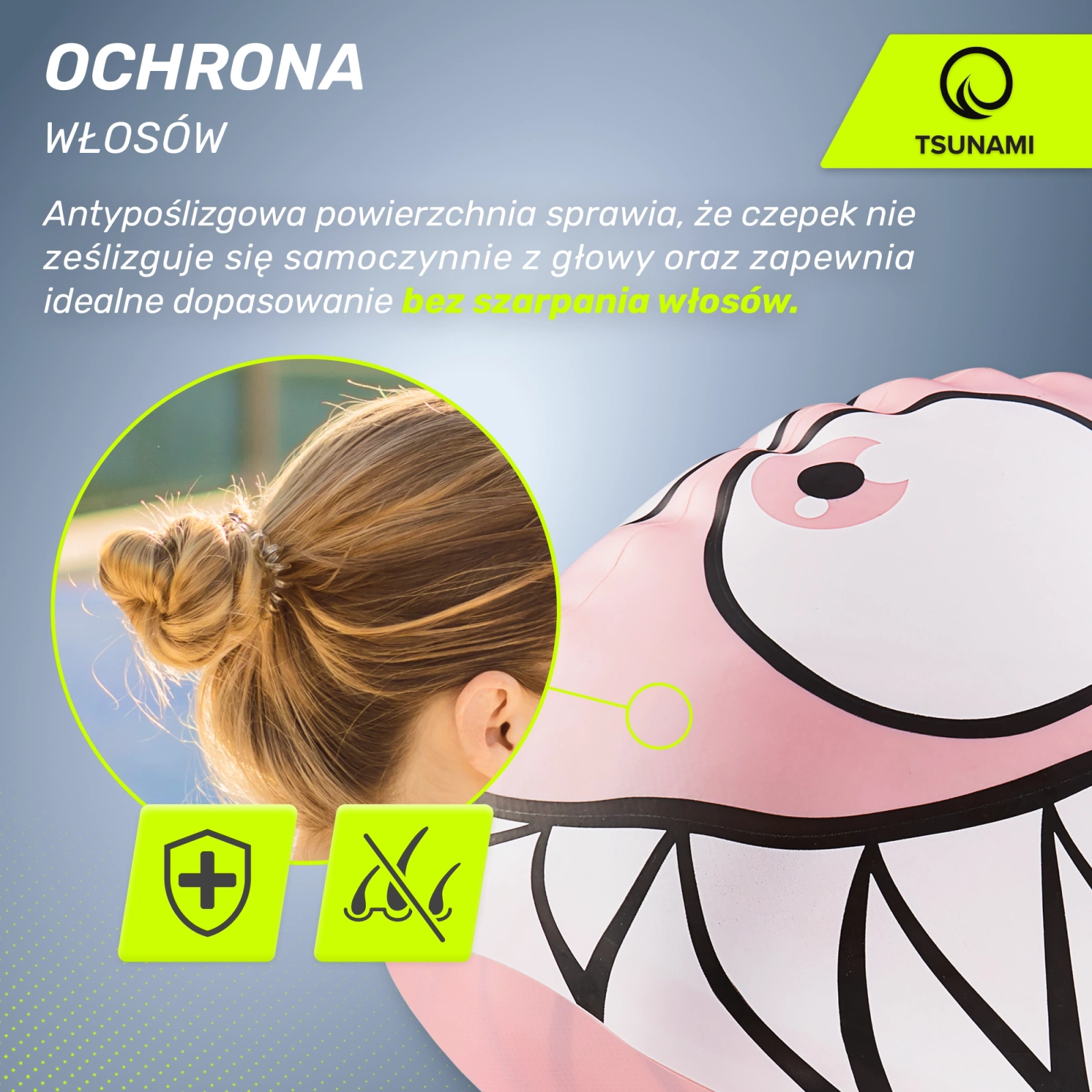 Az elasztikus anyagnak köszönhetően könnyen felvehető, és nem okoz fájdalmas lenyomatokat a fejen és az arcon. A csúszásmentes felület biztosítja, hogy a horog ne csússzon le spontán a fejről, miközben tökéletes illeszkedést biztosít a haj rángatása nélkül. Ennek eredményeként gyermeke soha többé nem fogja megkérdezni, hogy ma már úszhat-e sapka nélkül. Így ötvözzük a nagyszerű szórakozást a biztonsággal és a kényelemmel!
