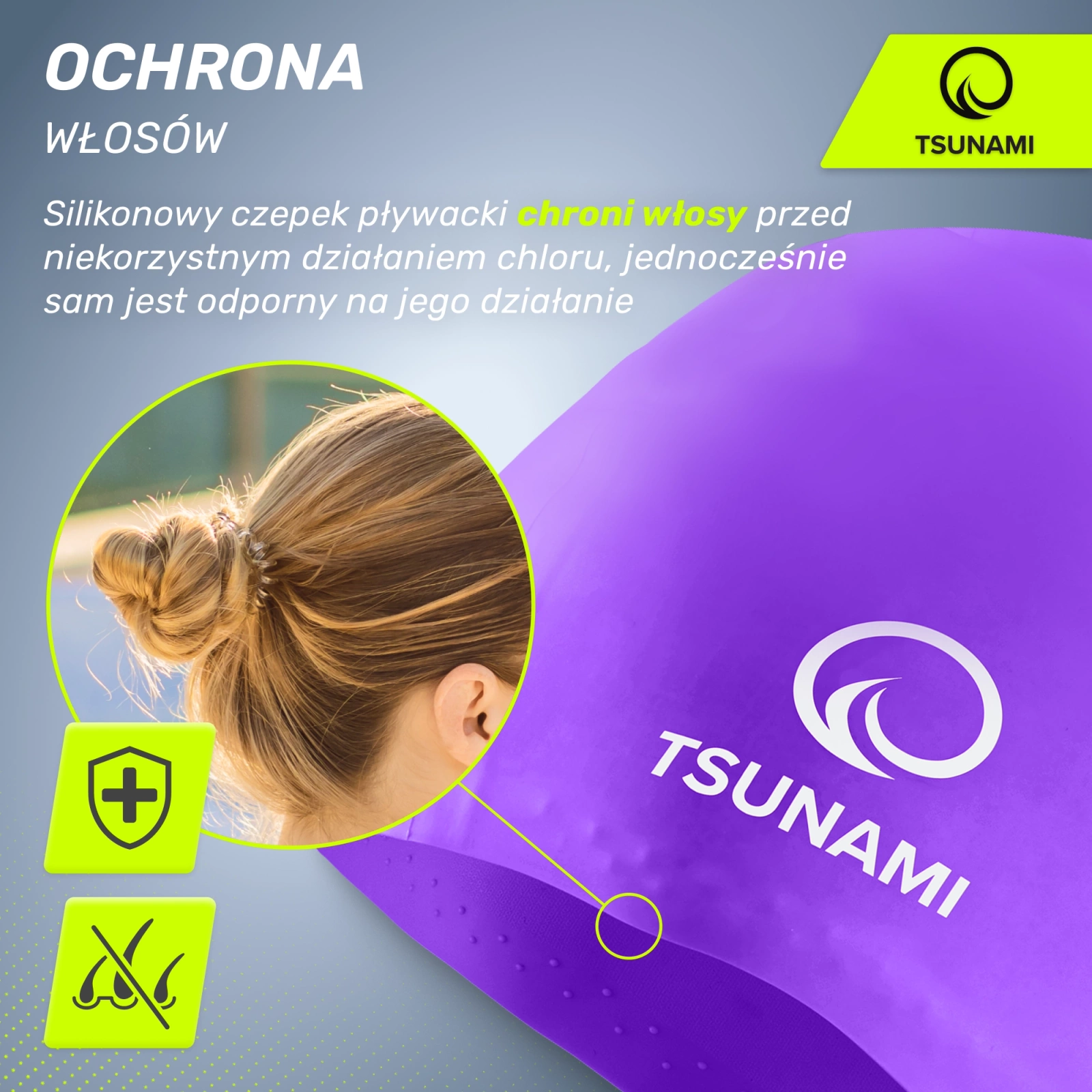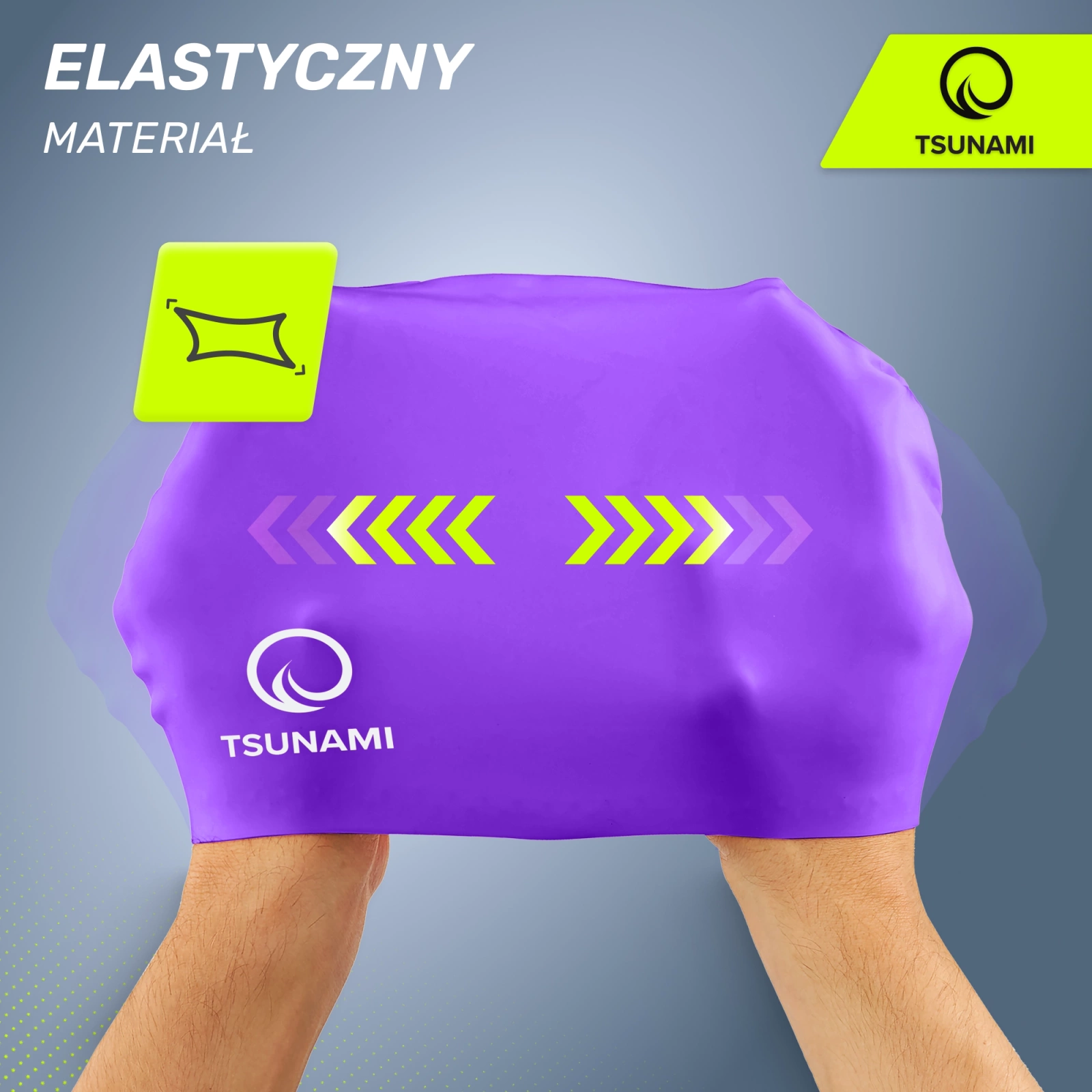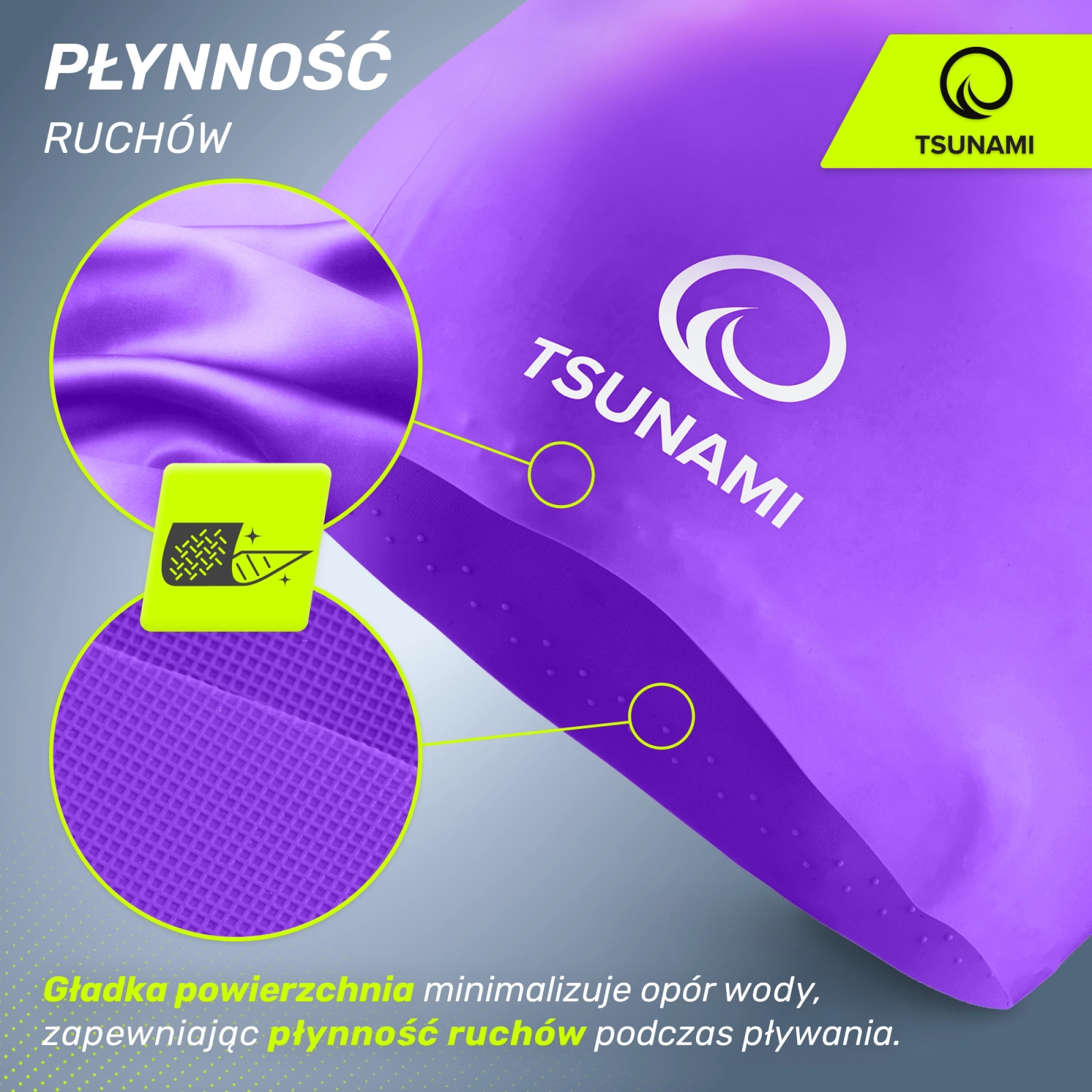 Úszósapkát keresel és nem tudod, melyiket válaszd? Nem tudja, milyen tulajdonságokkal kell rendelkeznie, hogy kényelmesen úszhasson benne? Mi tudjuk, és máris van egy tippünk. A kényelmes sapka hajlékony, tökéletes illeszkedést biztosít, nem csúszik és nem okoz tyúkszemet. Pontosan olyan, mint a TSUNAMI unisex úszósapka, extra hellyel a hajnak. Ráadásul úszósapkánk tartós és hipoallergén szilikonból készült, amely védi a hajat a klórtól, és maga is ellenáll a klórnak. Ennek eredményeképpen még gyakori használat mellett sem veszíti el rugalmasságát.