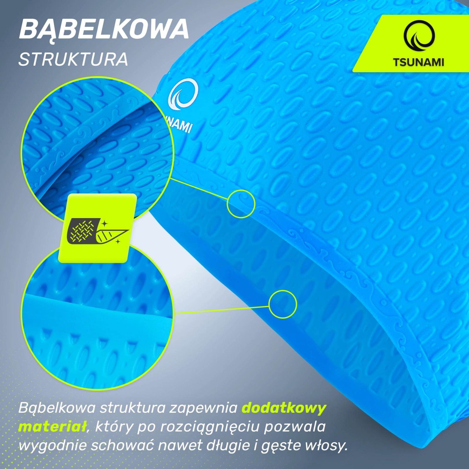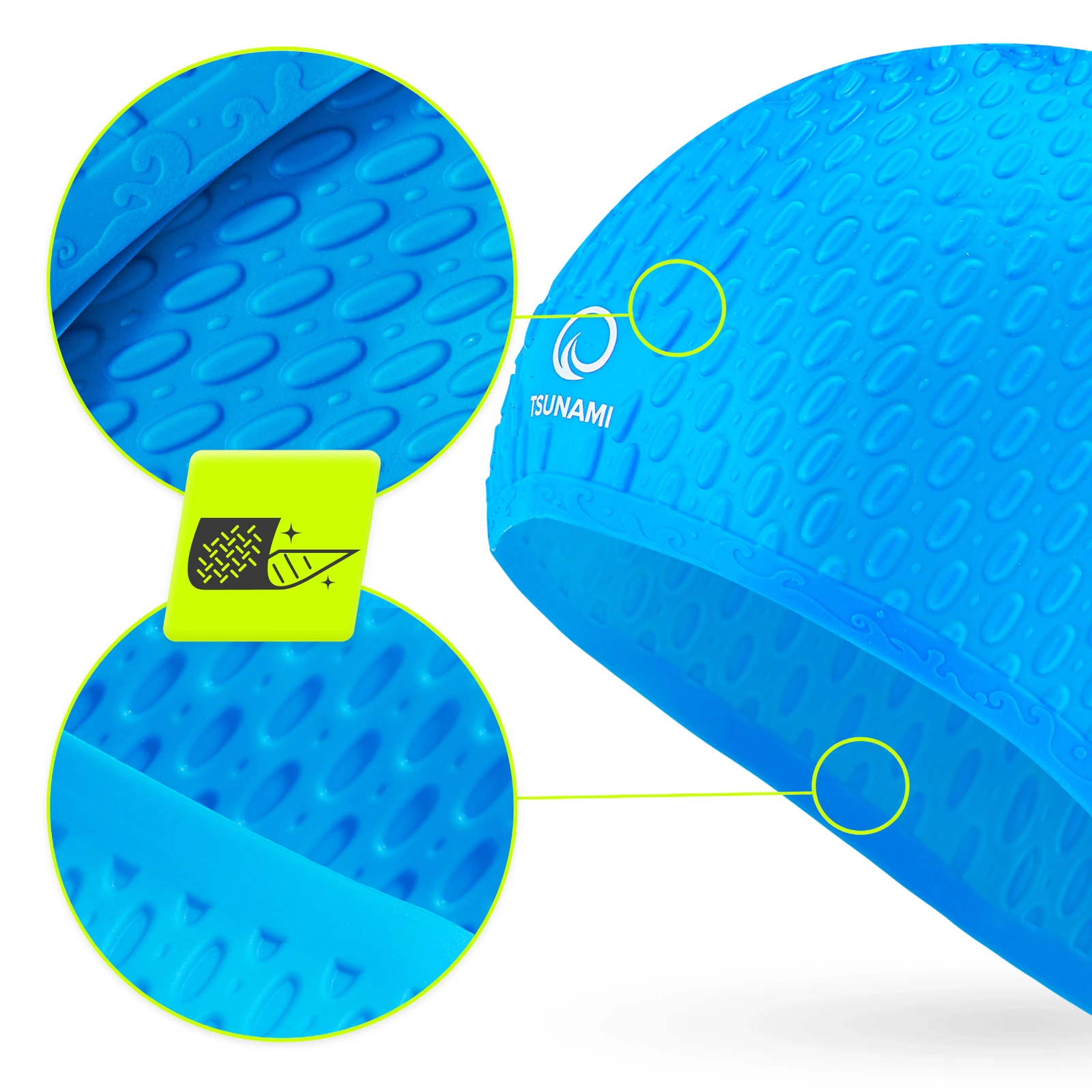Úszósapkát keresel a medencében tartott fitneszórához, a vízben való rehabilitációhoz vagy esetleg a termálfürdőbe való kiránduláshoz? Akkor a legjobb helyen jársz! A TSUNAMI úszósapka minden ilyen helyzetre megfelel. Az egyedülállóan hajlékony és hipoallergén szilikon tökéletesen illeszkedik, miközben nem okoz nyomáspontokat. A buborékos szerkezet extra anyagot biztosít, amely kinyújtva még a vastag hajat is kényelmesen betűrhetővé teszi. A belső matt felület pedig sem viseléskor, sem a sapka levételekor nem húzza a hajat.