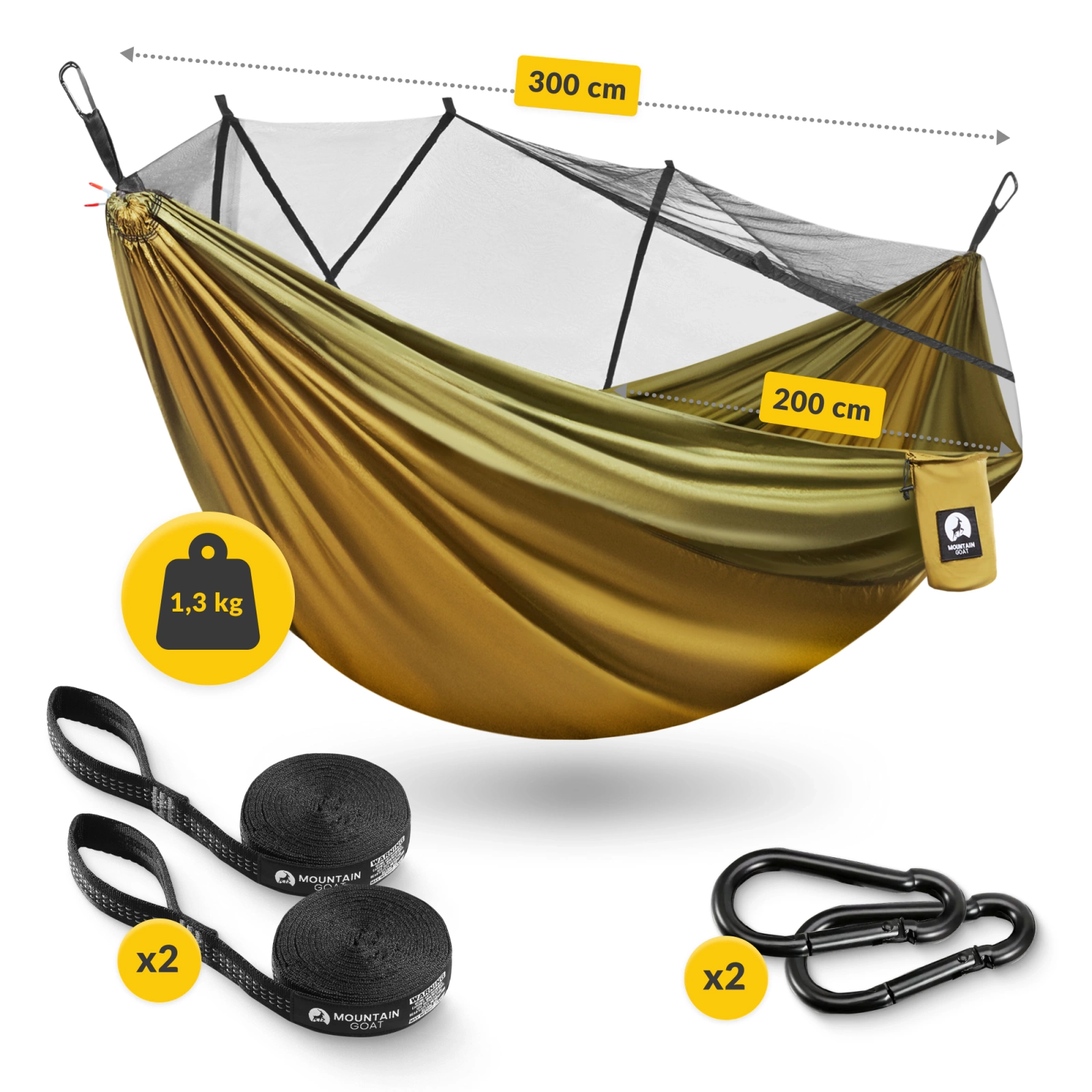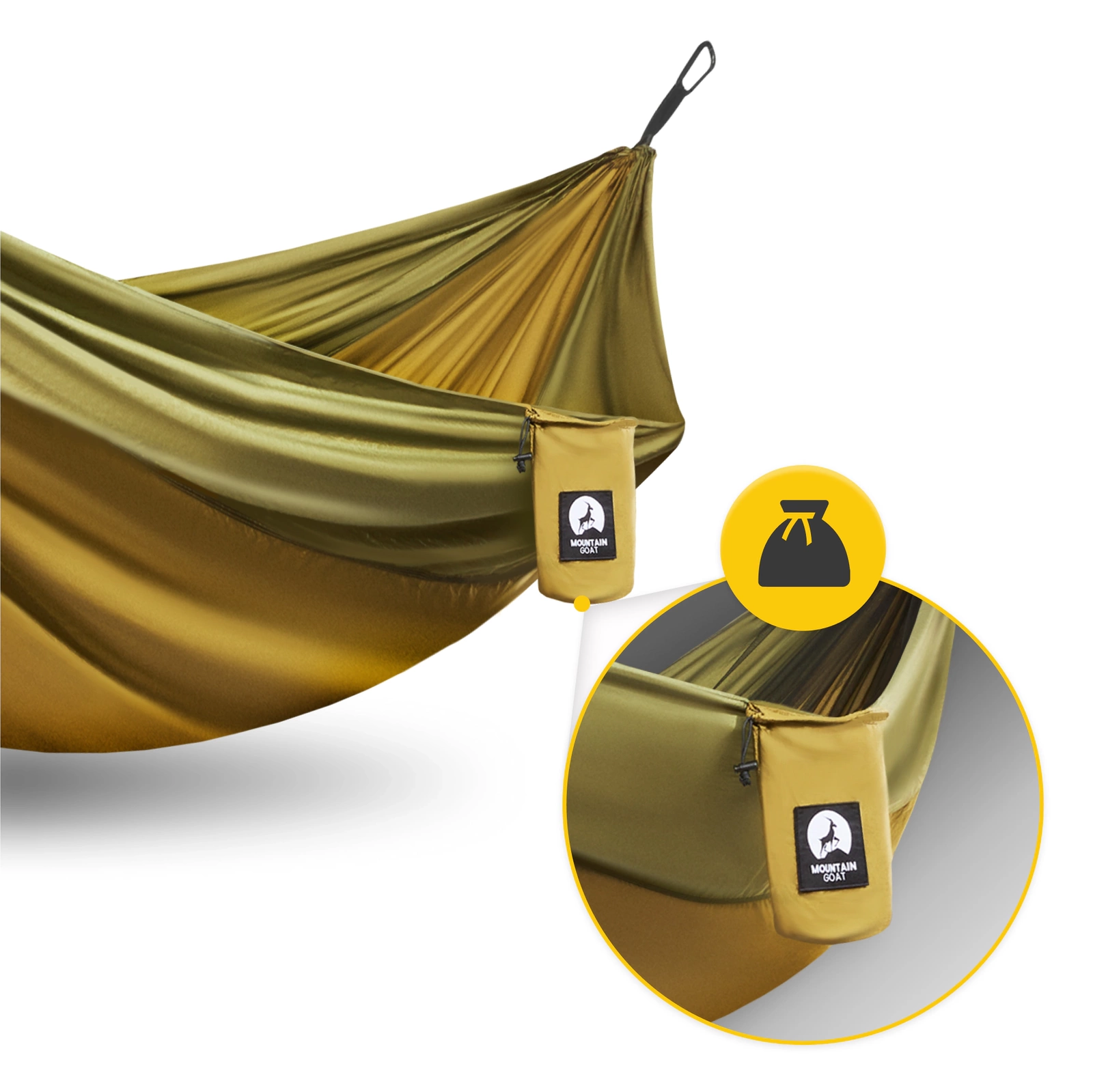 A MOUNTAIN GOAT szúnyoghálós függőágy könnyen kibogozható és felszerelhető a beépített 2 rögzítőzsinórnak és hevedereknek, valamint 2 karabinerhorognak köszönhetően. A szúnyogháló tartósan a függőágyba van szerelve.