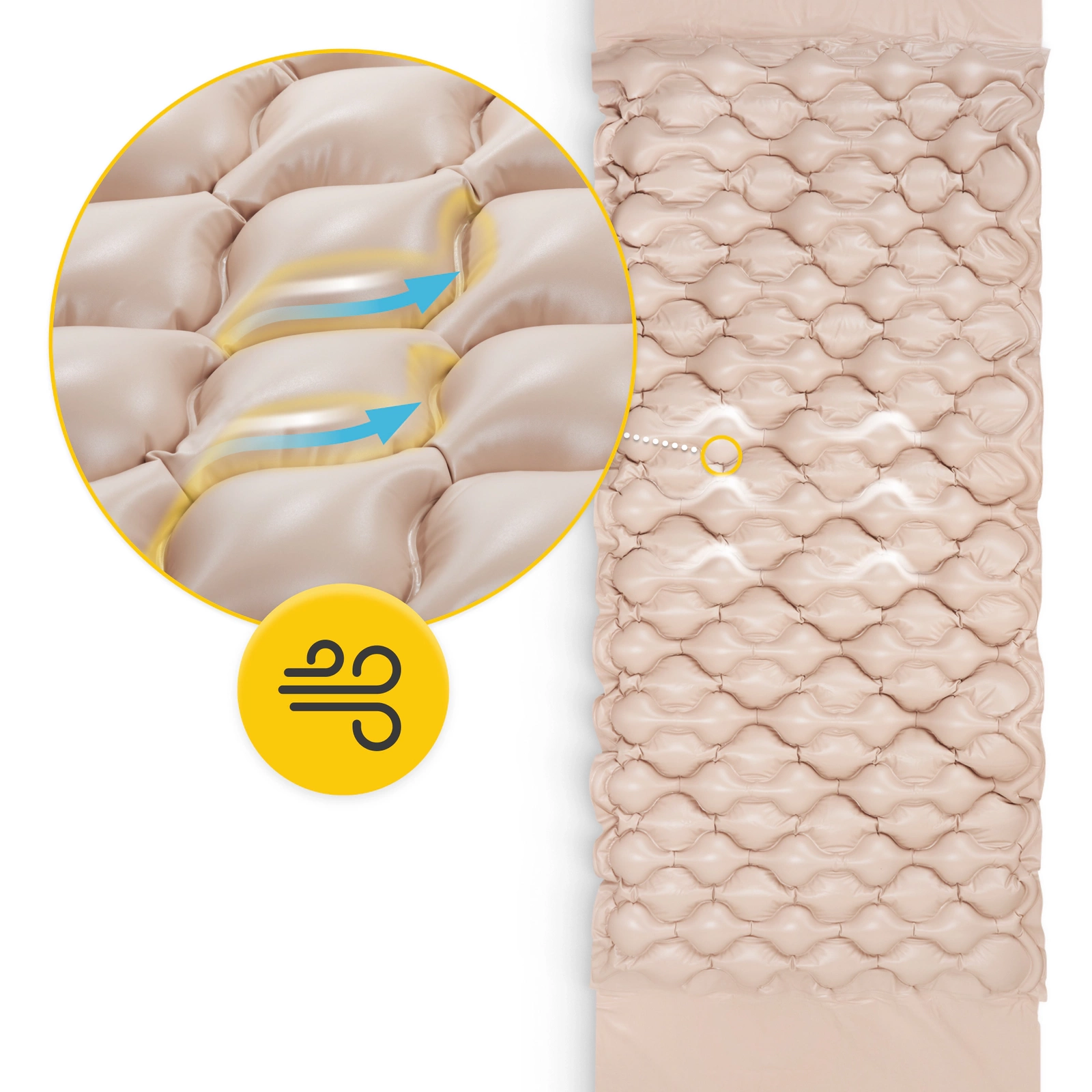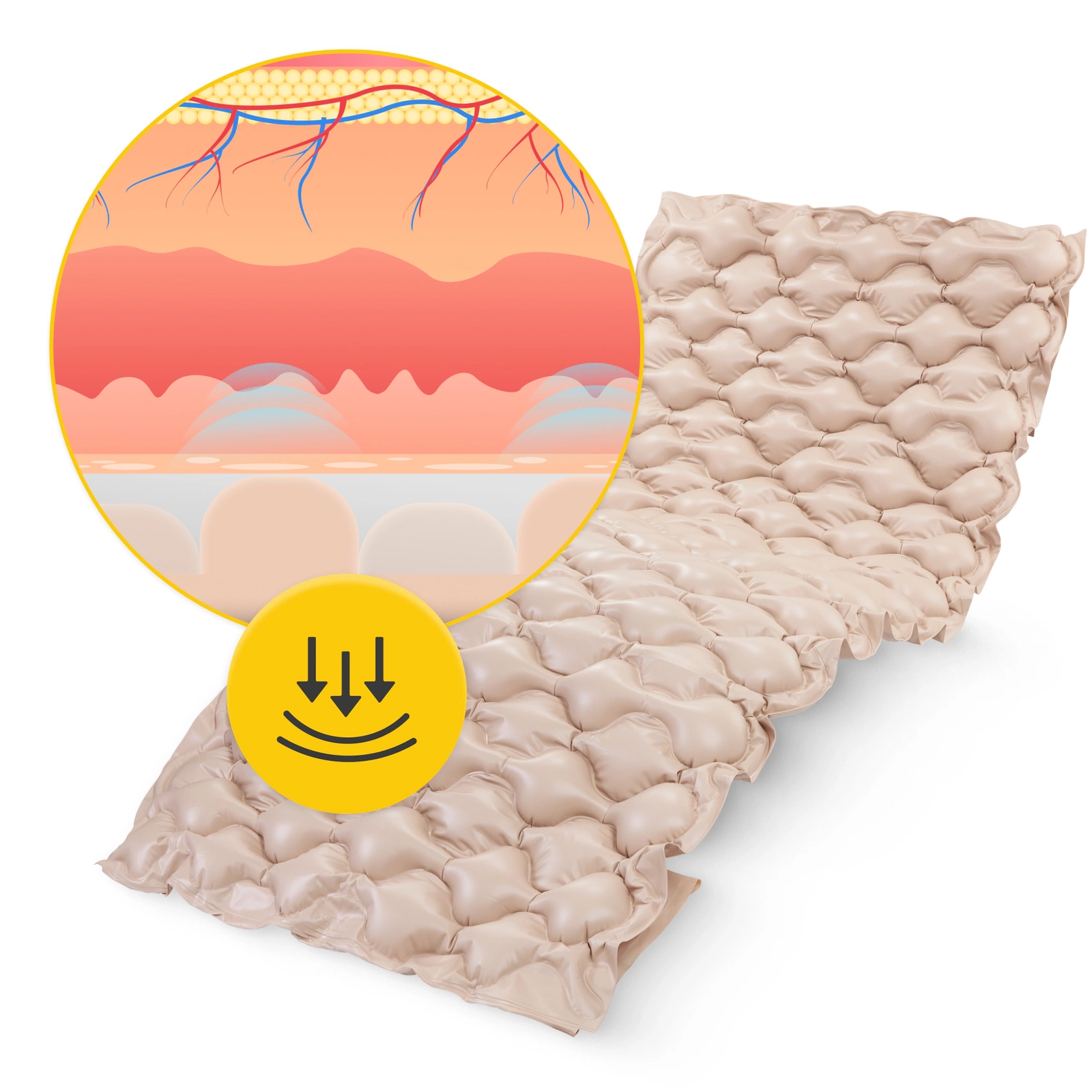 A matrac működési elve az az egyes kamrák felváltva történő fel- és leeresztésén alapul, amelyek felváltva emelkednek és süllyednek. Ez a technika a fekvő személy számára olyan mozgást biztosít, amely serkenti a szövetek működését. Ez megakadályozza a bőr állandó nyomásáta99>azokon a területeken. Ez a nyomás gátolhatja a vér és a nyirok normális áramlását, ezáltal fájdalmas nyomásfoltok kialakulásához vezethet. A kamrák folyamatos emelkedése és süllyedésea matrac és a fekvő személy teste közötti jobb légáramlást is biztosítja. Ez megakadályozza a test túlzott izzadását, és segít gondoskodni a higiéniáról.