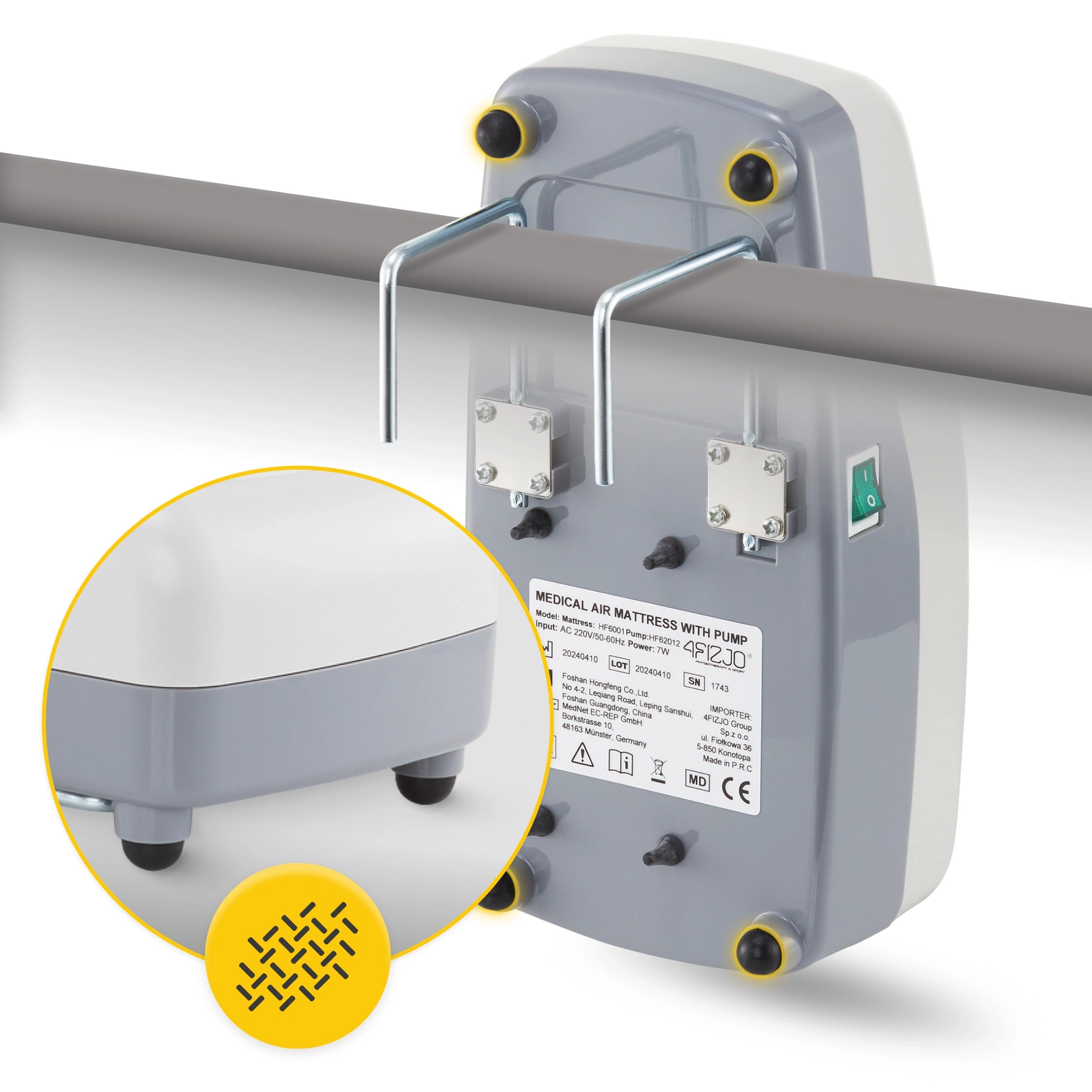 ✅ A pumpa fogantyúval van ellátva, amely lehetővé teszi, hogy az ágy szélére rögzíthető legyen, és lábakkal is rendelkezik, így a padlóra is elhelyezhető.