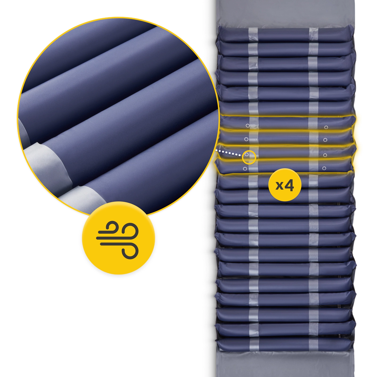 Ilyen helyzetben a 4 szellőzőkamrával ellátott PRO fekélyellenes matrac felbecsülhetetlen segítséget nyújt Önnek, lehetővé téve a szabad légáramlást és megakadályozva a túlzott izzadást. Ezenkívül egy hatékony és csendes pumpa biztosítja a kényelmet és a pihenést.