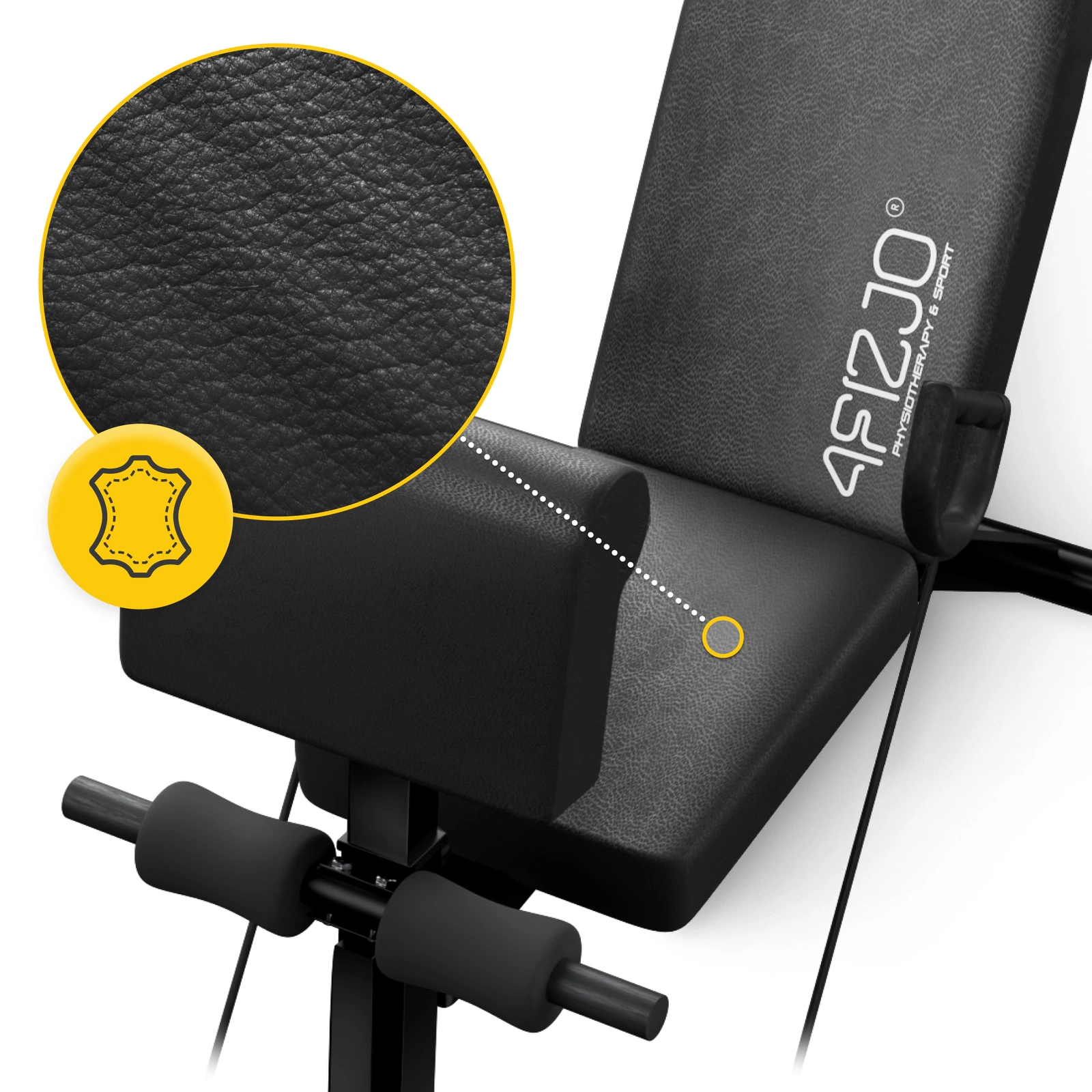 A PRO 4FIZJO edzőpad lehetővé teszi különböző erőgyakorlatok elvégzését súlyzókkal és súlyzókkal. A terméket tartós acélszerkezet jellemzi, amely az edzés típusához igazítható. Mi több, a háttámla az üléssel együtt kellemes tapintású és kiváló minőségű bőrből készült. A efodrmációnak ellenálló puha habbal töltött kárpitozás garantálja a kényelmet. Másrészt a nagyon jó stabilitás a csúszásmentes gumilábaknak köszönhető. Ezeknek köszönhetően a pad nem fog mozogni vagy imbolyogni. Ez biztosítja a maximális biztonságot a sorozatok elvégzésekor, még nehéz terhelés esetén is.