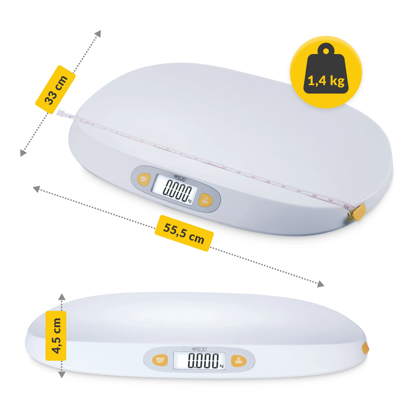 A beépített mérőszalaggal ellátott BABY újszülött mérleg lehetővé teszi a szülők számára, hogy megfigyeljék a baba súlyát, magasságát és testsúlyát. Ez rendkívül fontos a baba fejlődése szempontjából. Ezért a BABY 4FIZJO mérleg a következő funkciókkal van felszerelve:
