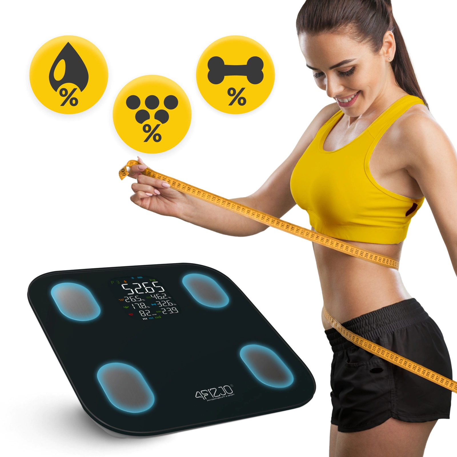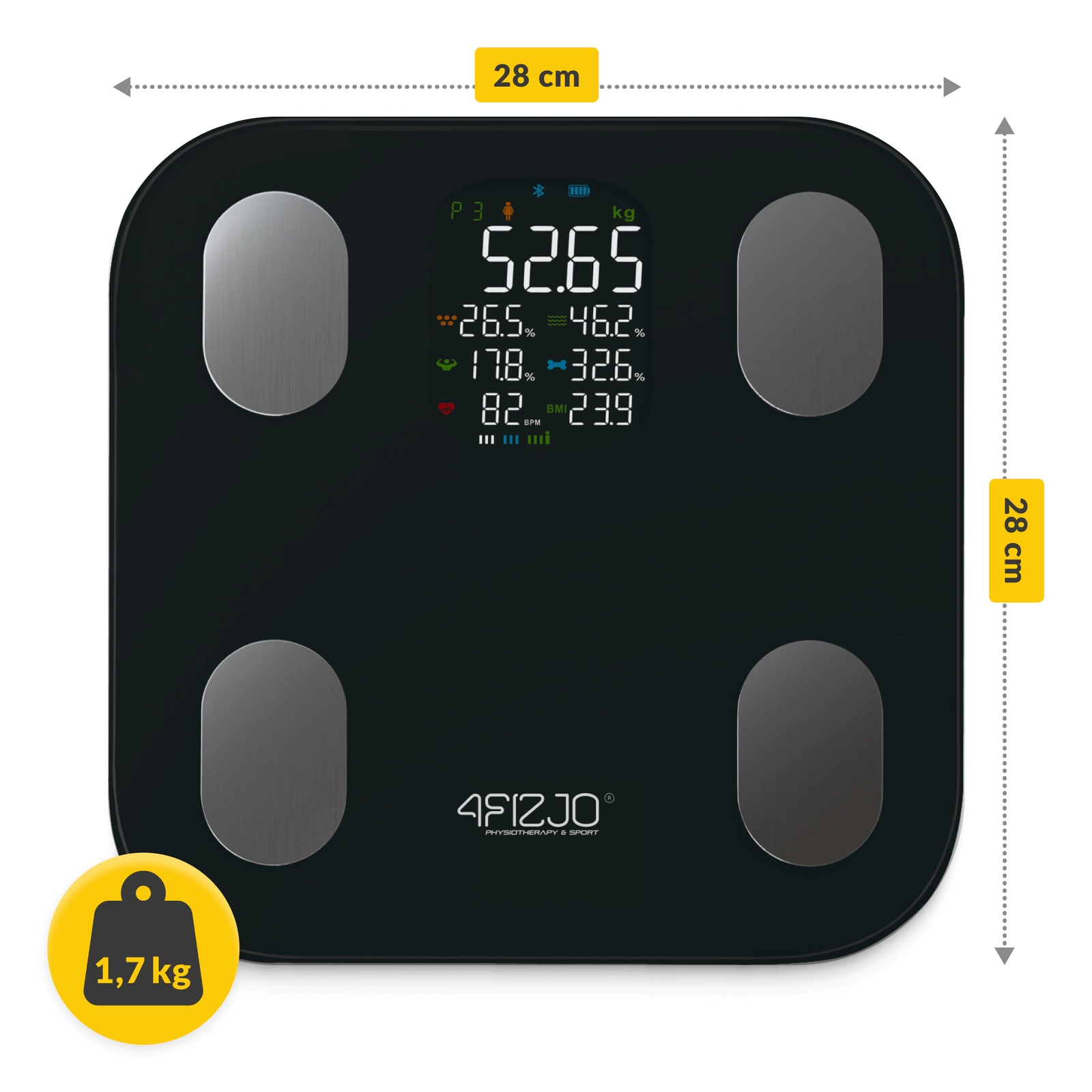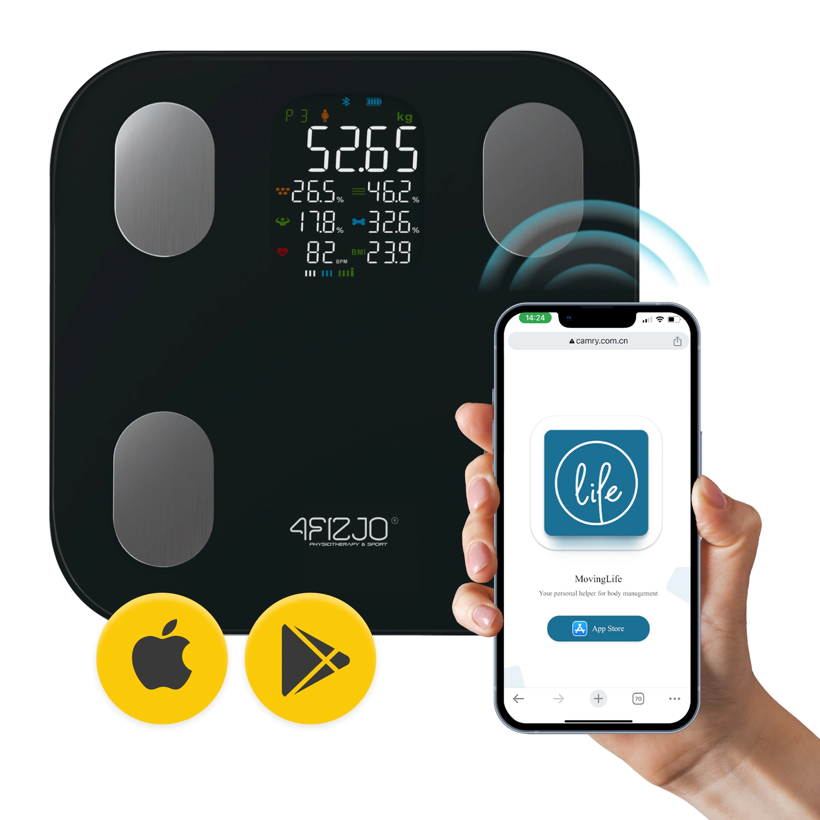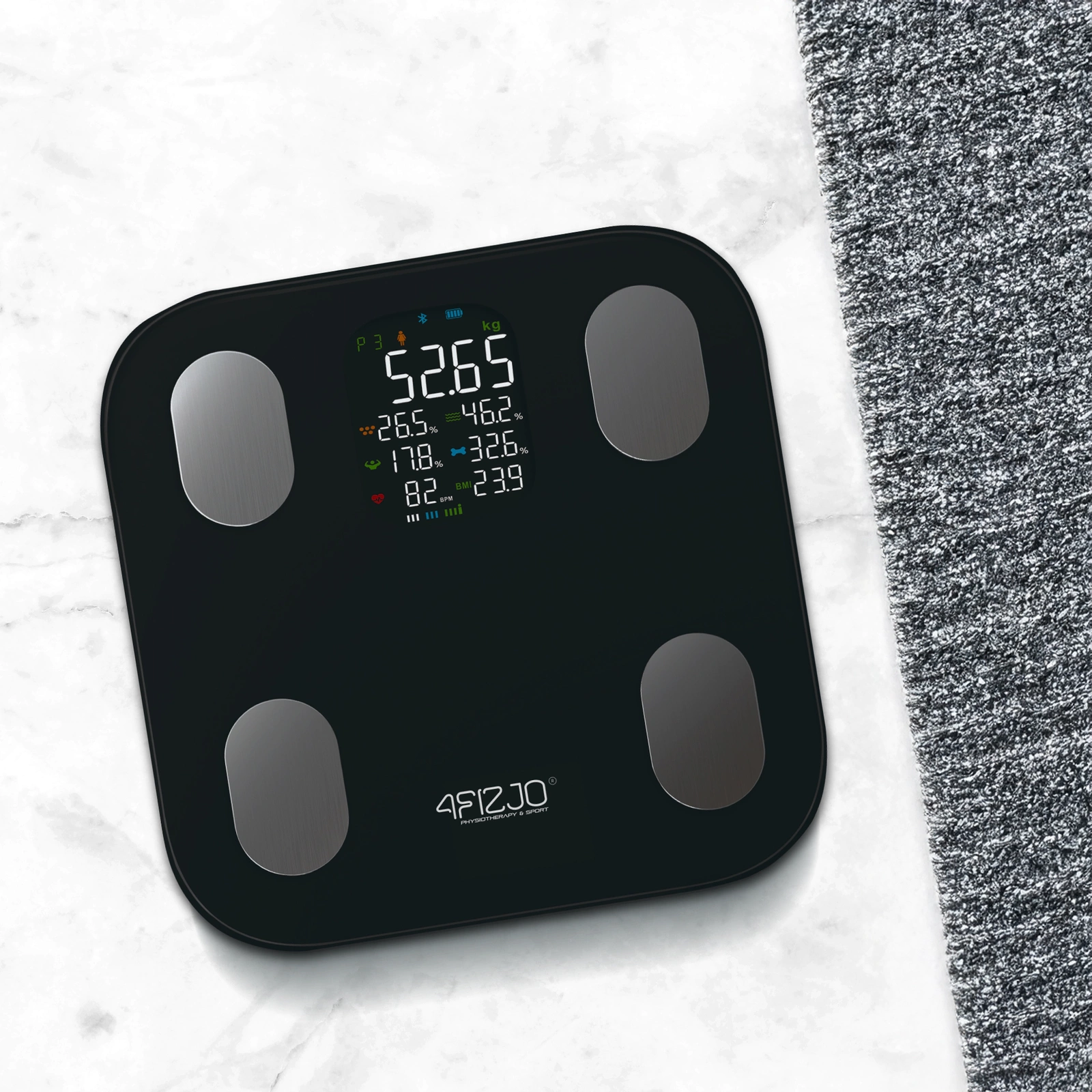 A 4FIZJO elektronikus fürdőszobai mérleget modern technológiája és a beépített 4 elektródának köszönhető precíz mérés jellemzi. Az érzékelőknek köszönhetően lehetőség van különböző információk meghatározására a testéről. Az intelligens mérleg kompatibilis a Moving Life alkalmazással. Ez elérhető iOS 8.0 vagy újabb és Android 4.3 vagy újabb rendszereken. Az alkalmazás és a készülék közötti kapcsolatot a Bluetooth 4.0 vagy újabb verzió és a Wi-Fi teszi lehetővé. Ezek a praktikus megoldások lehetővé teszik az adatok feldolgozását, pontos sziluett-leolvasást és testösszetétel-elemzést prezentálva.