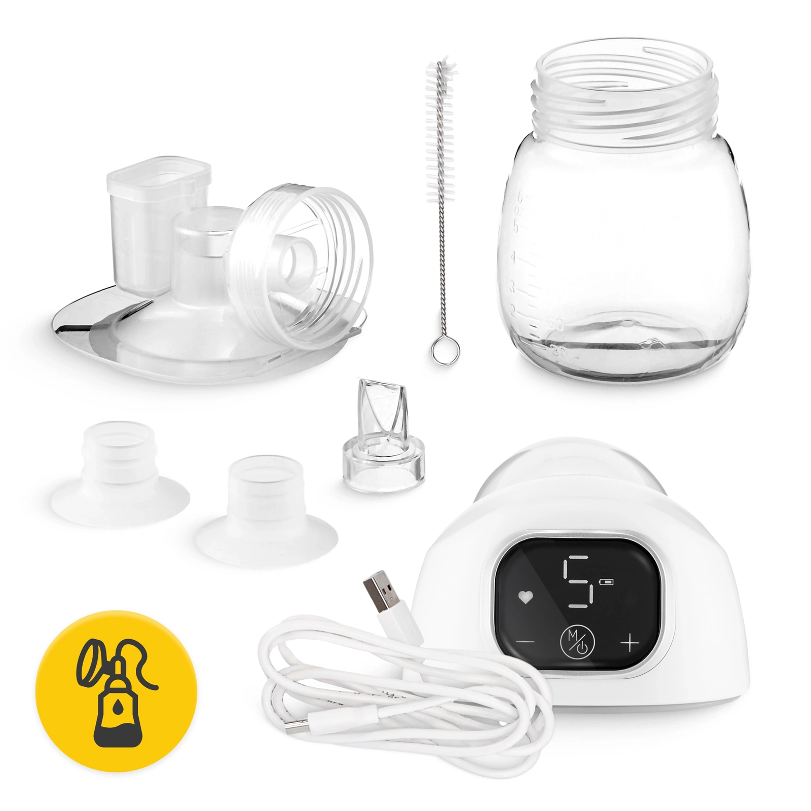 A készlet tartalmazza: szivattyú, palack kupakkal, tölcsér, 2 mellpajzs, 2 szilikon szelep, tisztítószer, USB kábel, tárolótáska.
