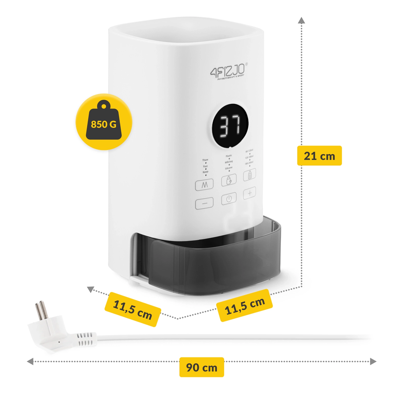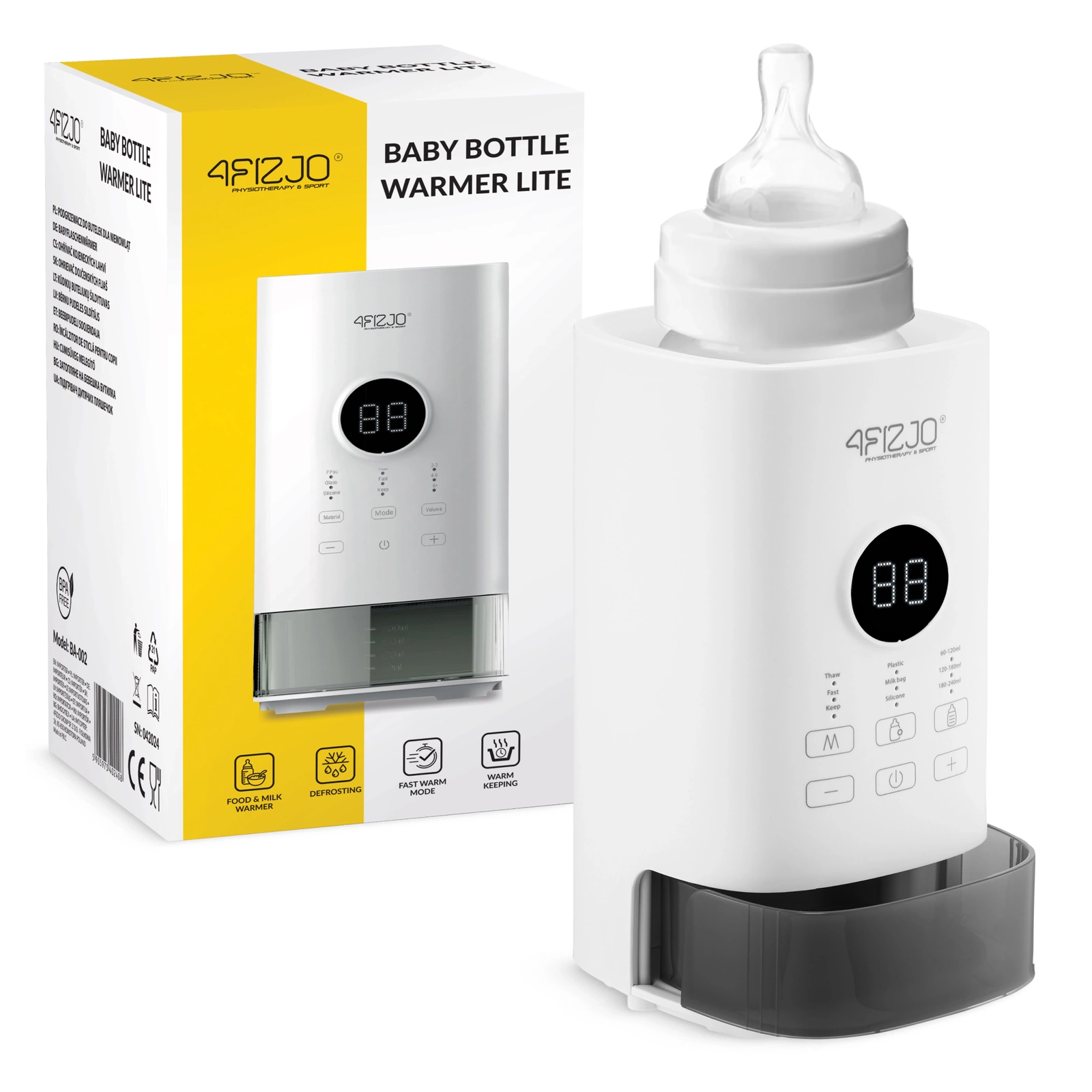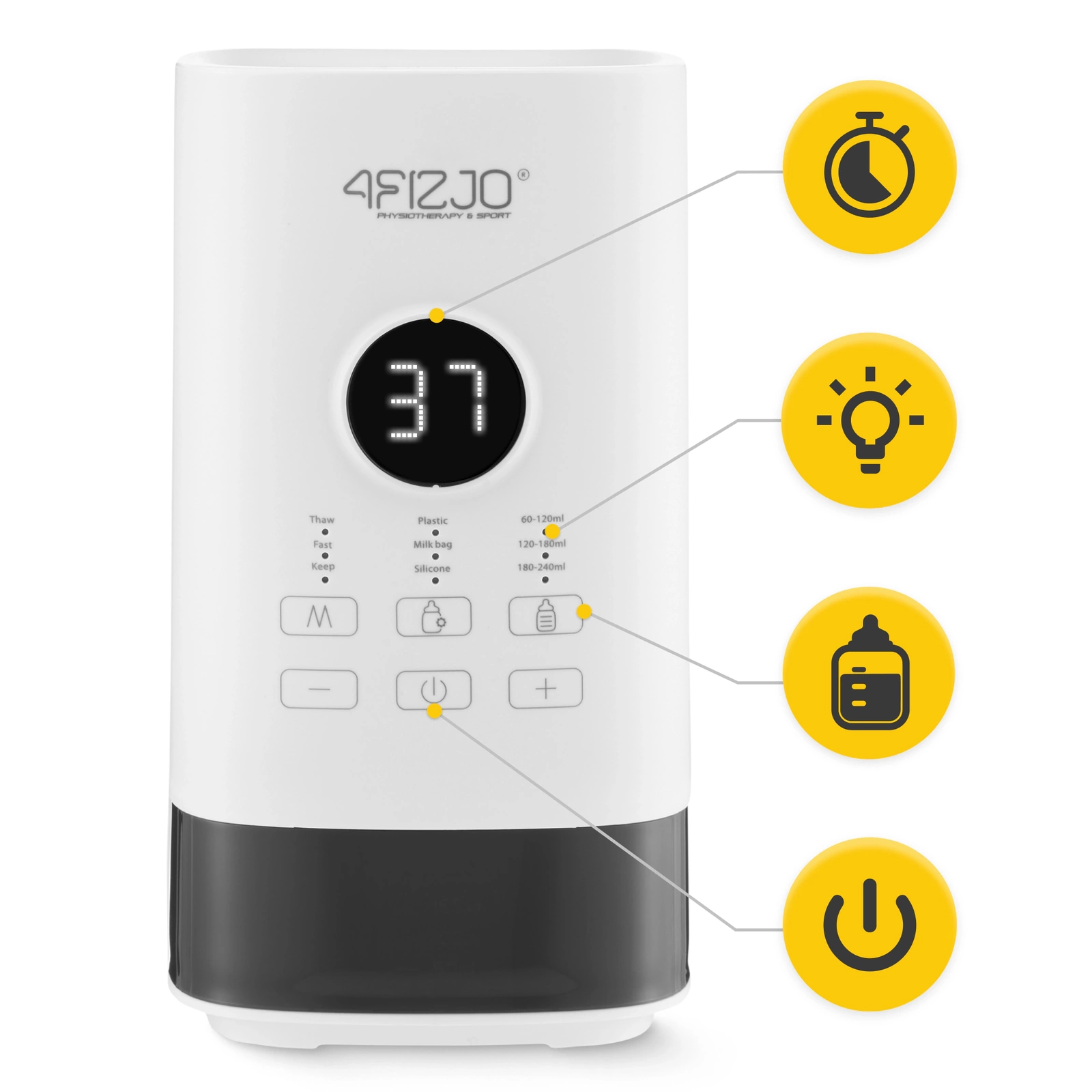 A 4FIZJO palackmelegítő egy intuitív és könnyen kezelhető modell 3 az 1-ben funkcióval. A modell lehetővé teszi, hogy könnyedén elkészítse a tejet a baba számára. Az első funkciója az állandó hőmérséklet fenntartása 30°C és 50°C között. A második funkció a leolvasztás, amely a tej fokozatos leolvasztását biztosítja a tápanyagok elvesztése nélkül. A második üzemmód viszont az étel gyors felmelegítése. Ez a széles körű funkcionalitás lehetővé teszi a beállítások igény szerinti személyre szabását.