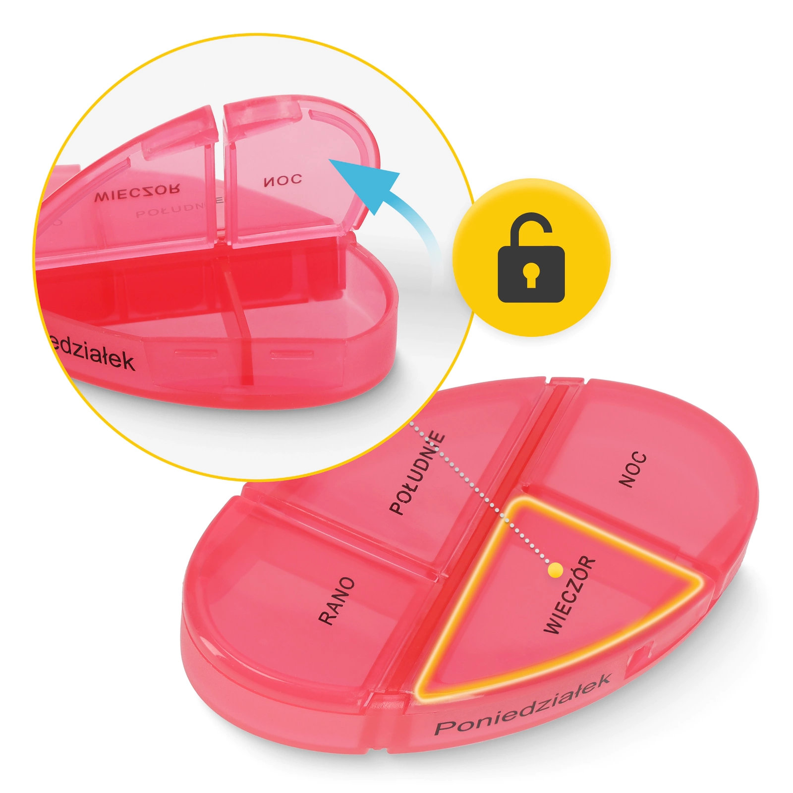 Fogadjon mAX 4FIZJO gyógyszer szervező kettős felosztással: a hét minden egyes napjára, valamint a nappal és az éjszaka 4 időszakára vonatkozóan. Ez megkönnyíti a gyógyszerek rendszerezését és bevételét, még akkor is, ha naponta többször is megteszi.