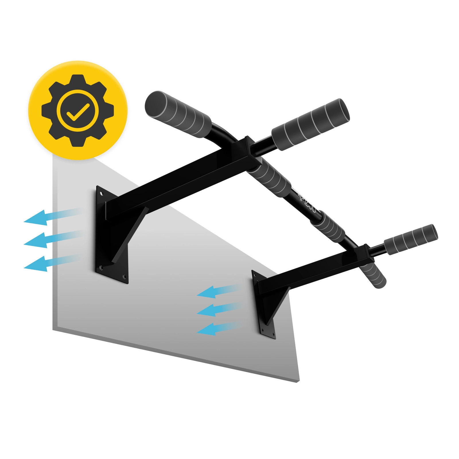 Multifunkciós húzódzkodó rúdunk összeszerelése nagyon egyszerű és gyors nem kell aggódnia a váratlan nehézségek miatt. Első lépésben rögzítse a mellékelt szerelőhorgokat a falhoz. Ezután rájuk akasztja a rudat. Ez az! A rúd készen áll az edzésre, elkezdheted. Fontos, hogy nem kell aggódnia a fal miatt - négy gumipárna megvédi azt a sérülésektől.