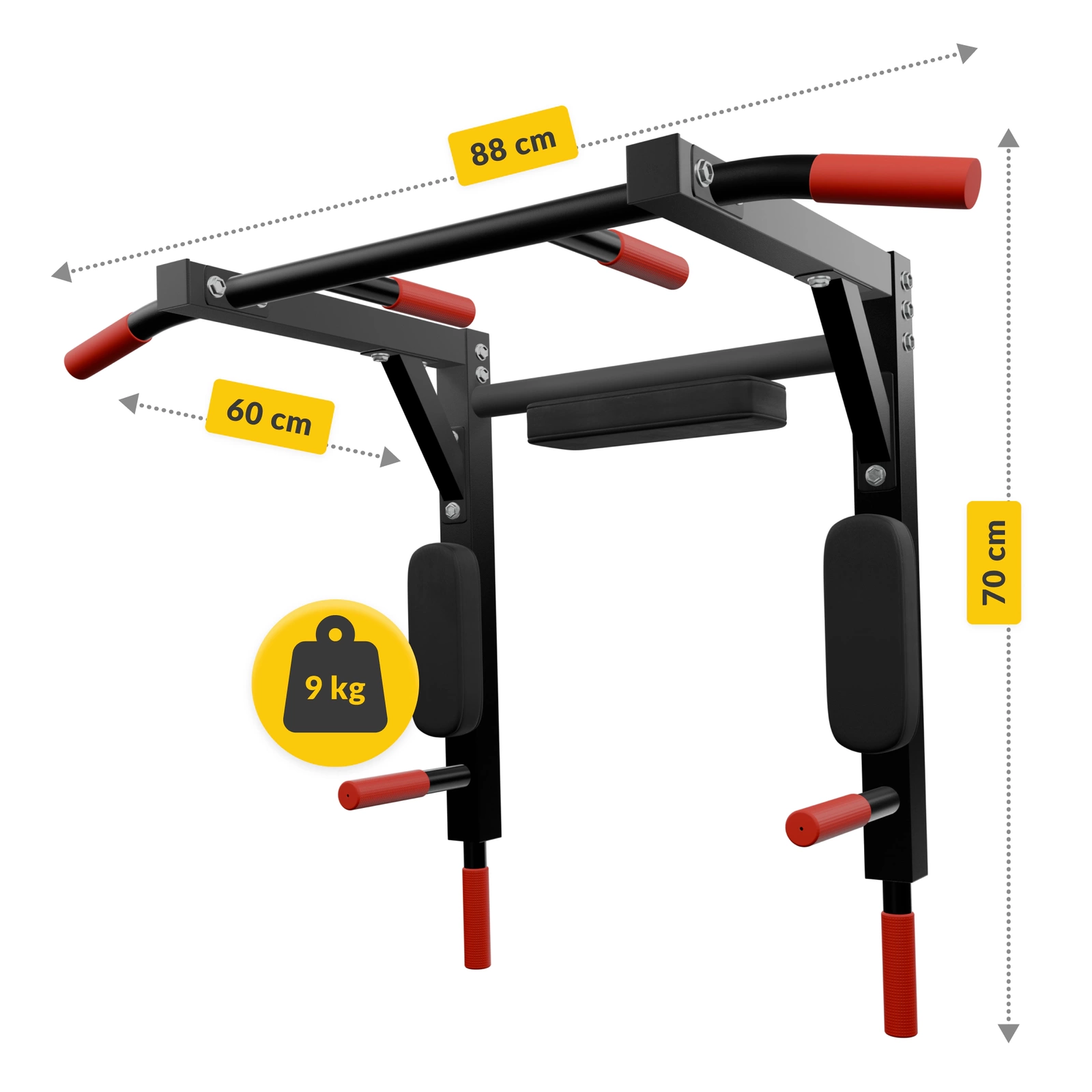 multifunkciós húzódzkodó rúdunk felszerelése nagyon egyszerű és gyors nem kell aggódnia a váratlan nehézségek miatt. Első lépésben rögzítse a mellékelt szerelőhorgokat a falhoz. Ezután rájuk akasztja a rudat. Az okos kialakításnak köszönhetően kétféleképpen teheted ezt meg, attól függően, hogy a rudat húzódzkodásra vagy dip állomásként kívánod-e használni. Ez az! Stick készen áll a képzésre, akkor indulhat.