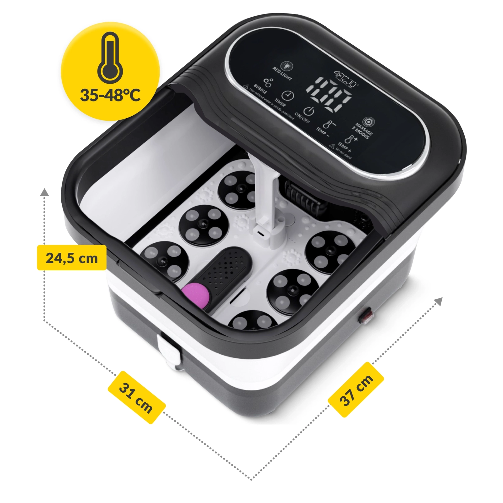 Mindenki szeretne egy pihentető masszázsra vágyik, mintha egy profi masszázsszalonba látogatna el. Most ez lehetséges, hála a Multifunkcionális EVO+ vizes lábmasszírozónak. Ez a készülék olyan emberek számára nyújt lehetőségeket, akik egy kis kikapcsolódásra és egy pillanatnyi magányra vágynak. A 6 automata masszázsgörgő mélyszöveti relaxációt biztosít. Ezenkívül infrared light bubble mód segít lazítani és regenerálni a fájó láb- és váll izmokat. Szeretne még jobban vigyázni a lábára? Használja ki a kivehető habkő funkciót!