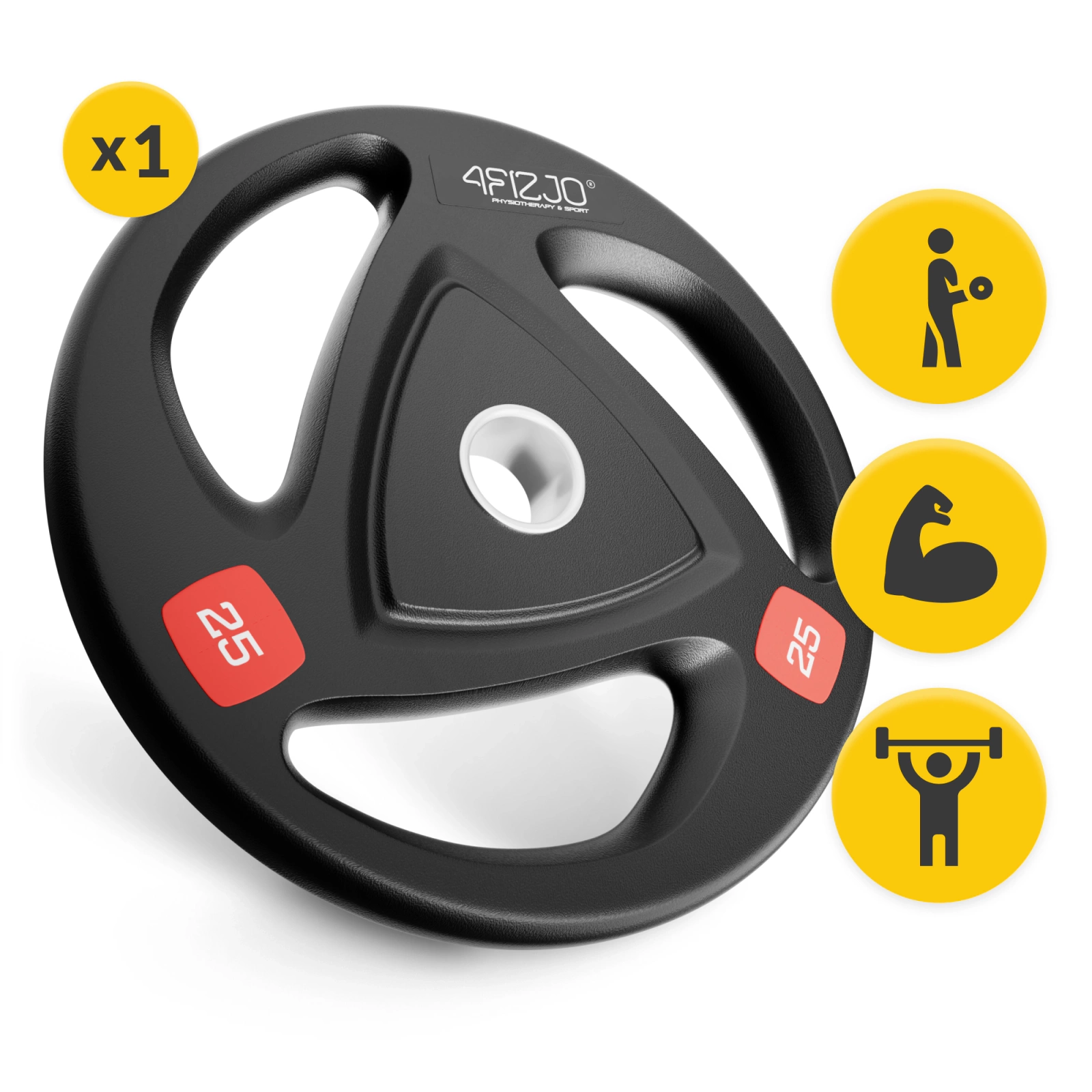 Bemutatjuk a 4FIZJO olimpiai tárcsát, amely kiváló minőségű öntöttvasból készült, vastag, tartós és ellenálló gumiréteggel bevonva. A precíz öntvény, a kiváló anyaghasználat és a profi kidolgozás biztonságot és kényelmet garantálnak számodra az edzés során – bárhol is végezd azt.