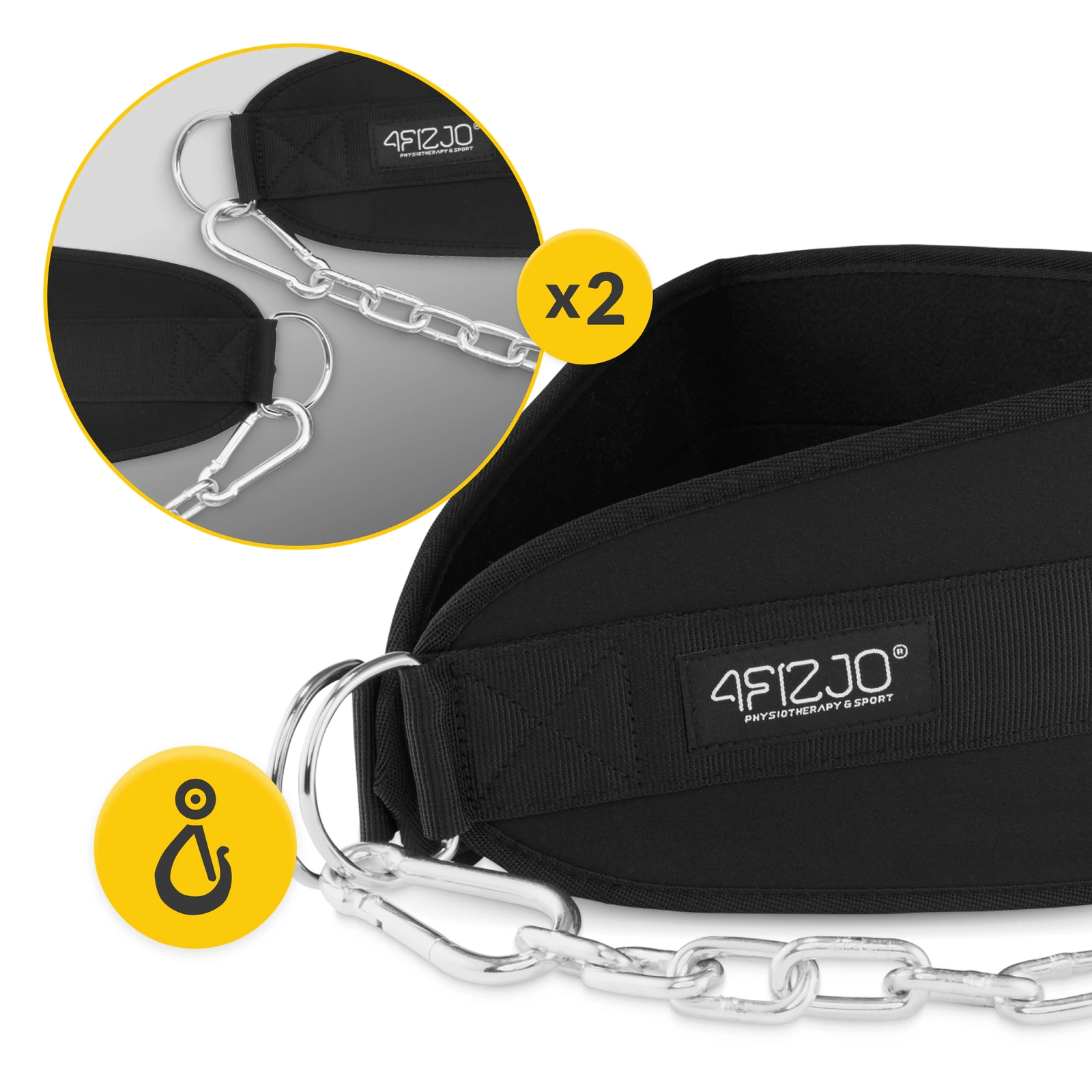 A 4FIZJO merülő súlyzóöv erős acéllánccal van felszerelve. Ez lehetővé teszi, hogy nagy, akár 80 kg súlyú súlyt akasszon fel anélkül, hogy elveszítené az irányítást. Ez biztosítja a biztonságot és a magas szintű edzéskomfortot.