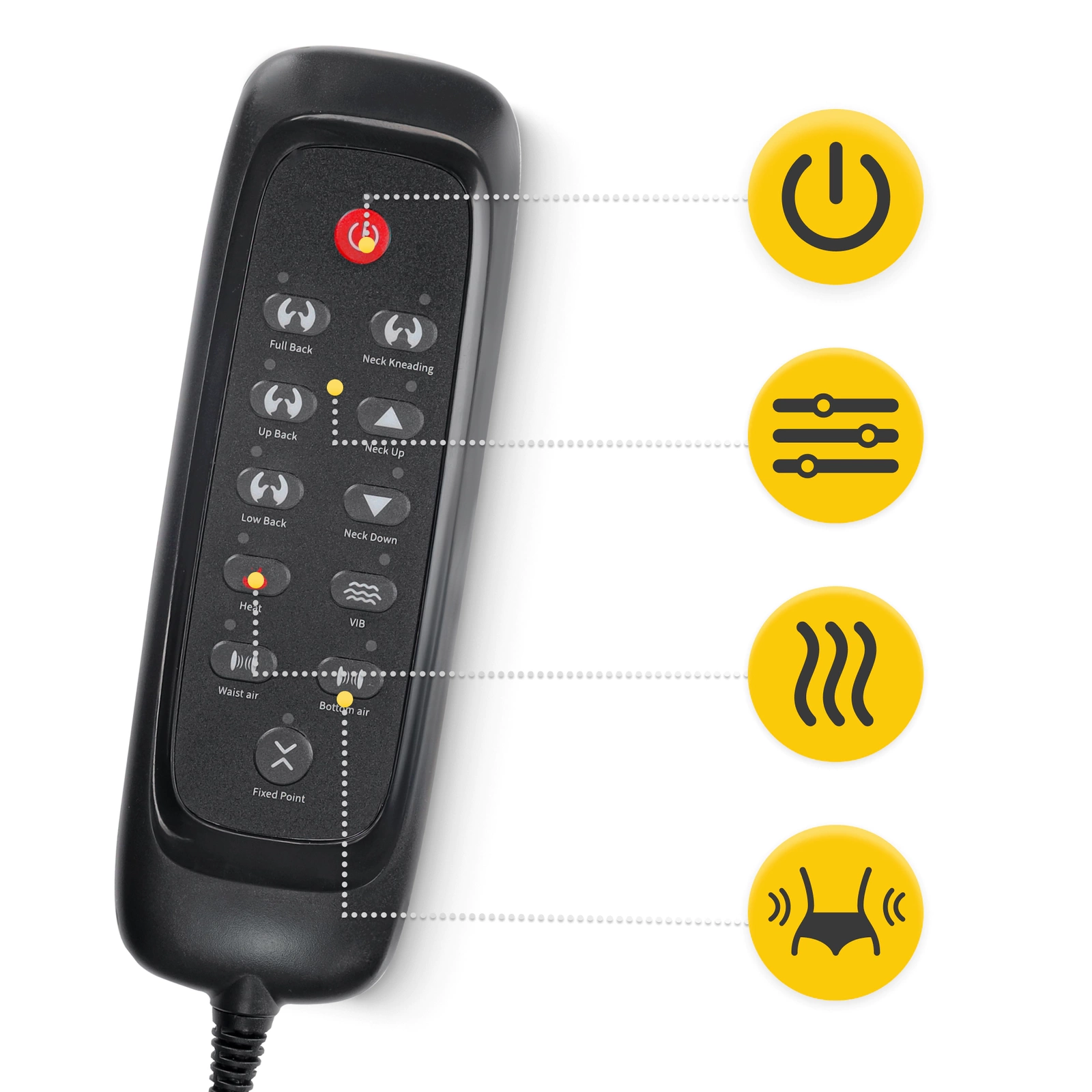 A shiatsu masszázsszőnyeggel 4FIZJO úgy fogja érezni magát, mintha egy professzionális masszázsszalonban lenne. A különböző funkcióknak köszönhetően kiválaszthatja a tökéletes masszázsfajtát. Így fogadjon a 12 masszázsfej vagy melegítő funkció által nyújtott felejthetetlen élményre. Az egyszerű kezelhetőséget viszont a távirányító biztosítja, amelyből masszázszónák közül választhat: