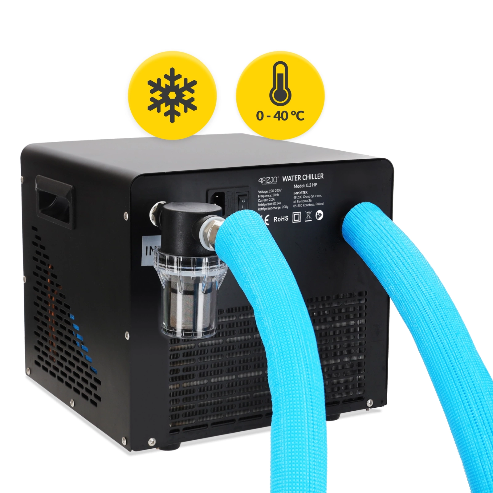 A 4FIZJO hűtő egy megbízható készülék a víz hűtésére a hidegfürdők során. Egyesíti a hűtési funkciókat a hőmérséklet fenntartásával. A vízhűtő ja PRO 4FIZJO rozmárkáddal kompatibilis. Magának a vízhűtőnek a működése egyszerű és intuitív.Mindössze annyit kell tennie, hogy bedugja a kádba, beállítja a célhőmérsékletet, és élvezheti a vágyott pihenést. Ráadásul kényelmet és könnyű kezelhetőséget egy könnyen kezelhető vezérlőpanel biztosít, LED kijelzővel és vezérlőgombokkal. Ezek lehetővé teszik a cél hőmérséklet beállítását a 0℃-40℃ tartományon belül.