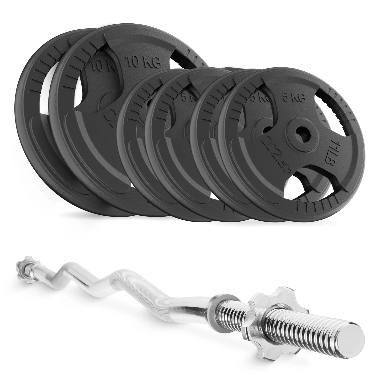 Öntöttvas testépítő szett enyhén hajlított 120 cm-es rúddal és súlytárcsákkal: 4 × 5 kg, 2 × 10 kg