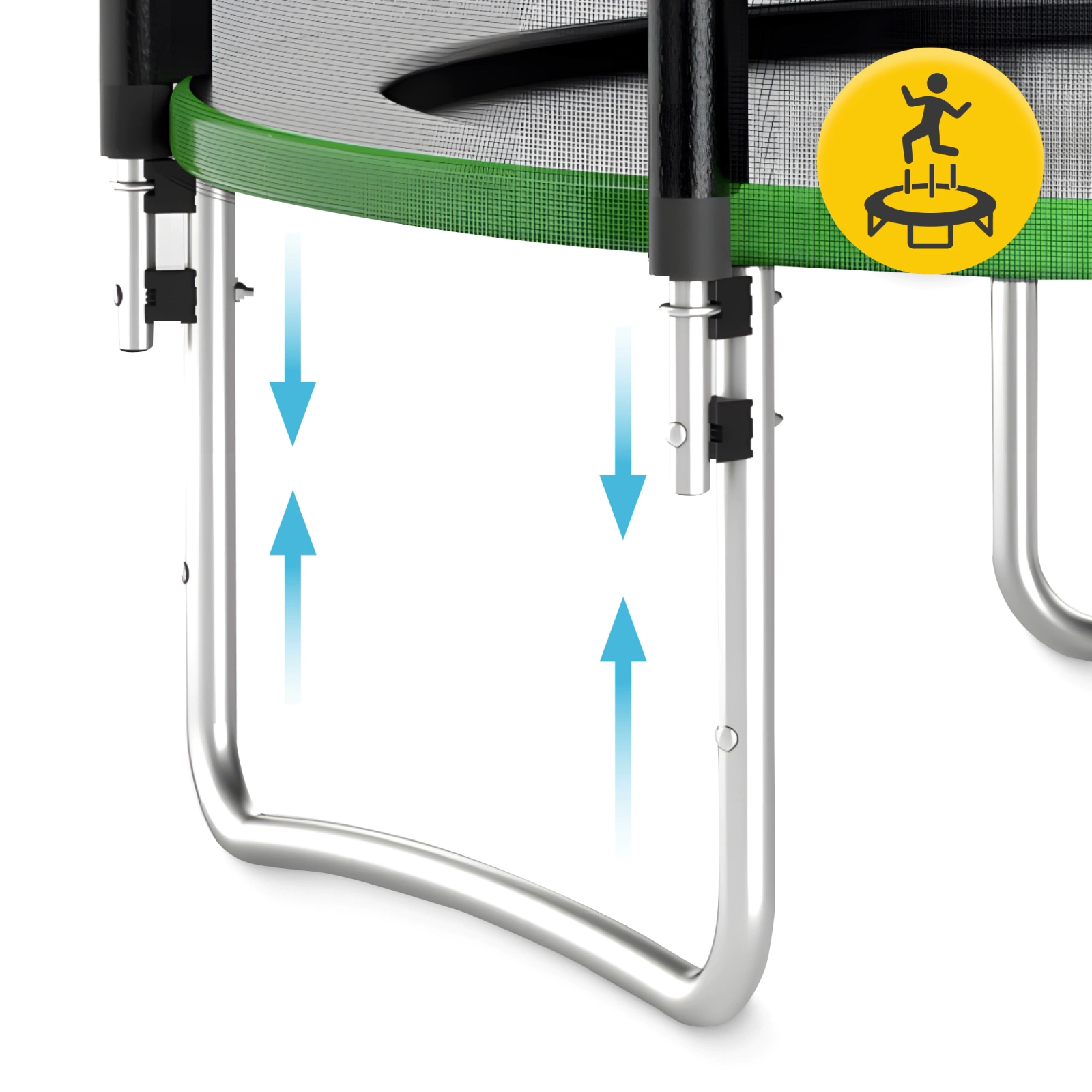 A nagy teherbírást a galvanizált acél váz biztosítja, melynek támasztóoszlopait vastag habszivacs borítja, rugóik pedig „in-out” módszerrel horganyzottak. A trambulin stabilitását és billenés elleni védelmét az „U” alakú lábak garantálják, amelyek egyenletesen osztják el a súlyt.