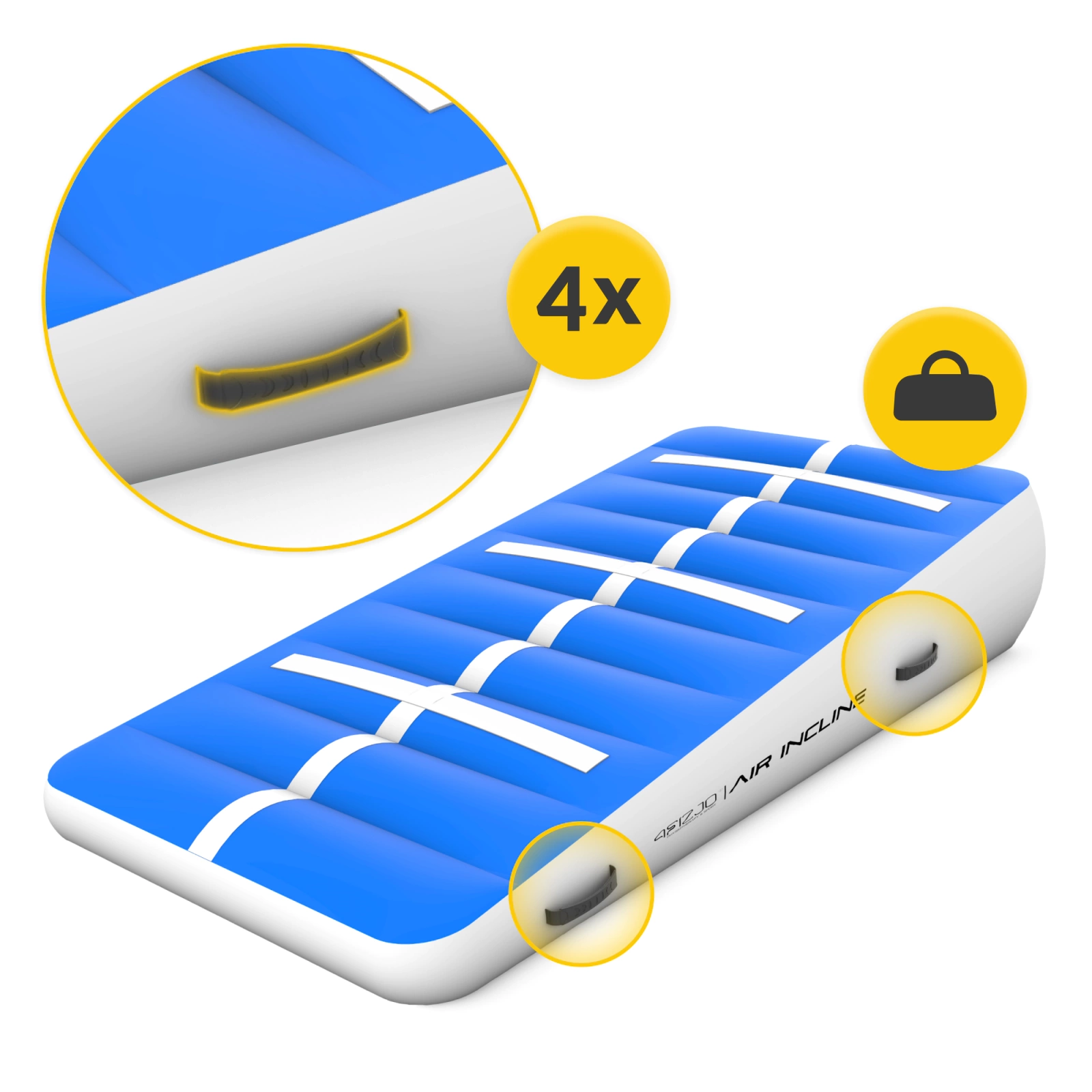 Az AIR INCLINE felfújható gimnasztikai ferde matrac ideális felszerelés mindazok számára, akik szeretnék fejleszteni akrobatikus képességeiket. A biztonság és a kényelem szem előtt tartásával tervezték, és tökéletes az ugráláshoz, a bukfencek tanulására vagy más alapvető tornagyakorlatokhoz.