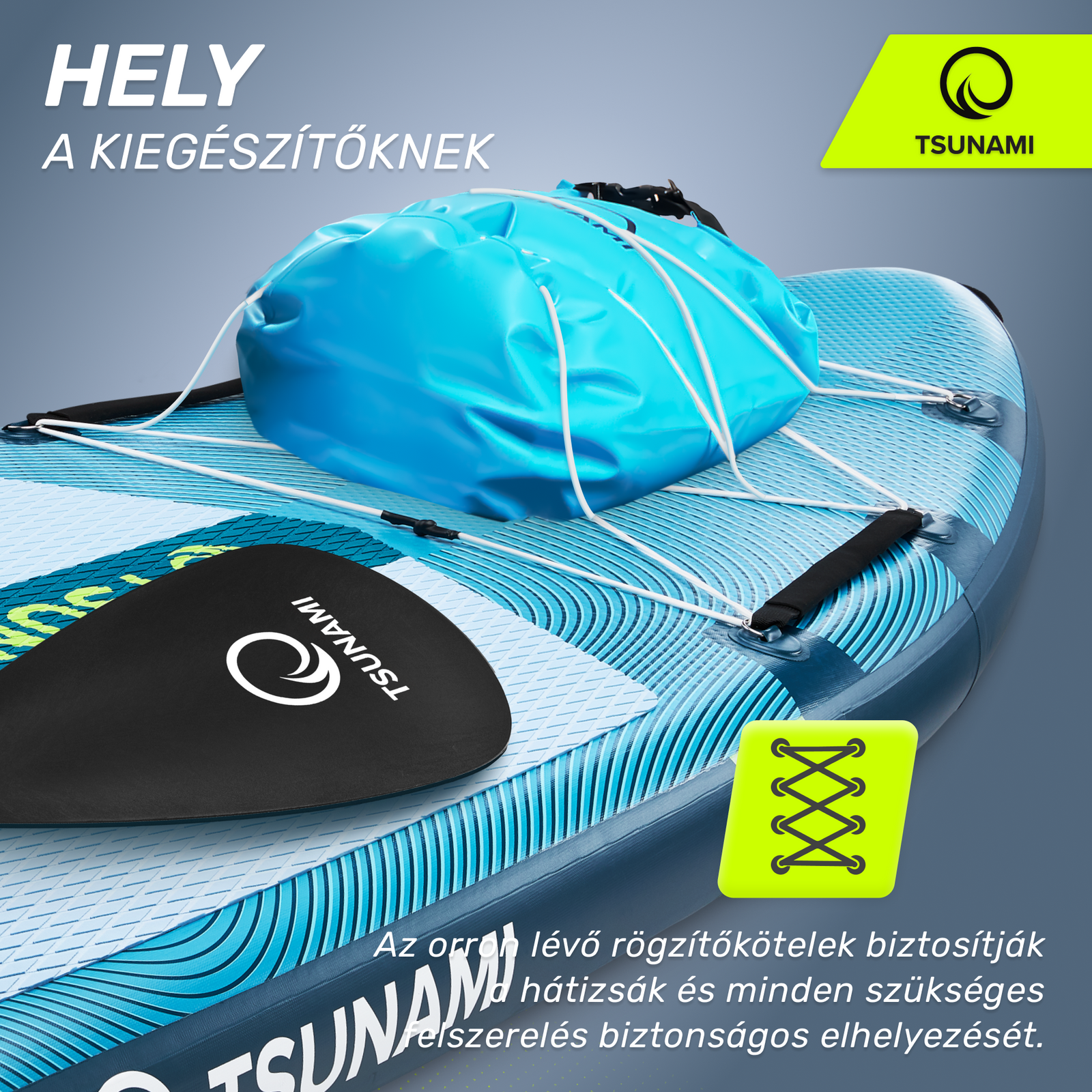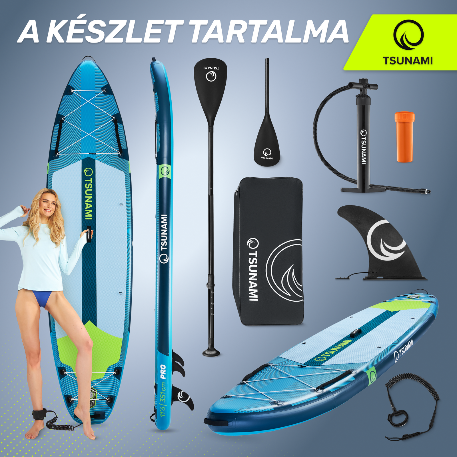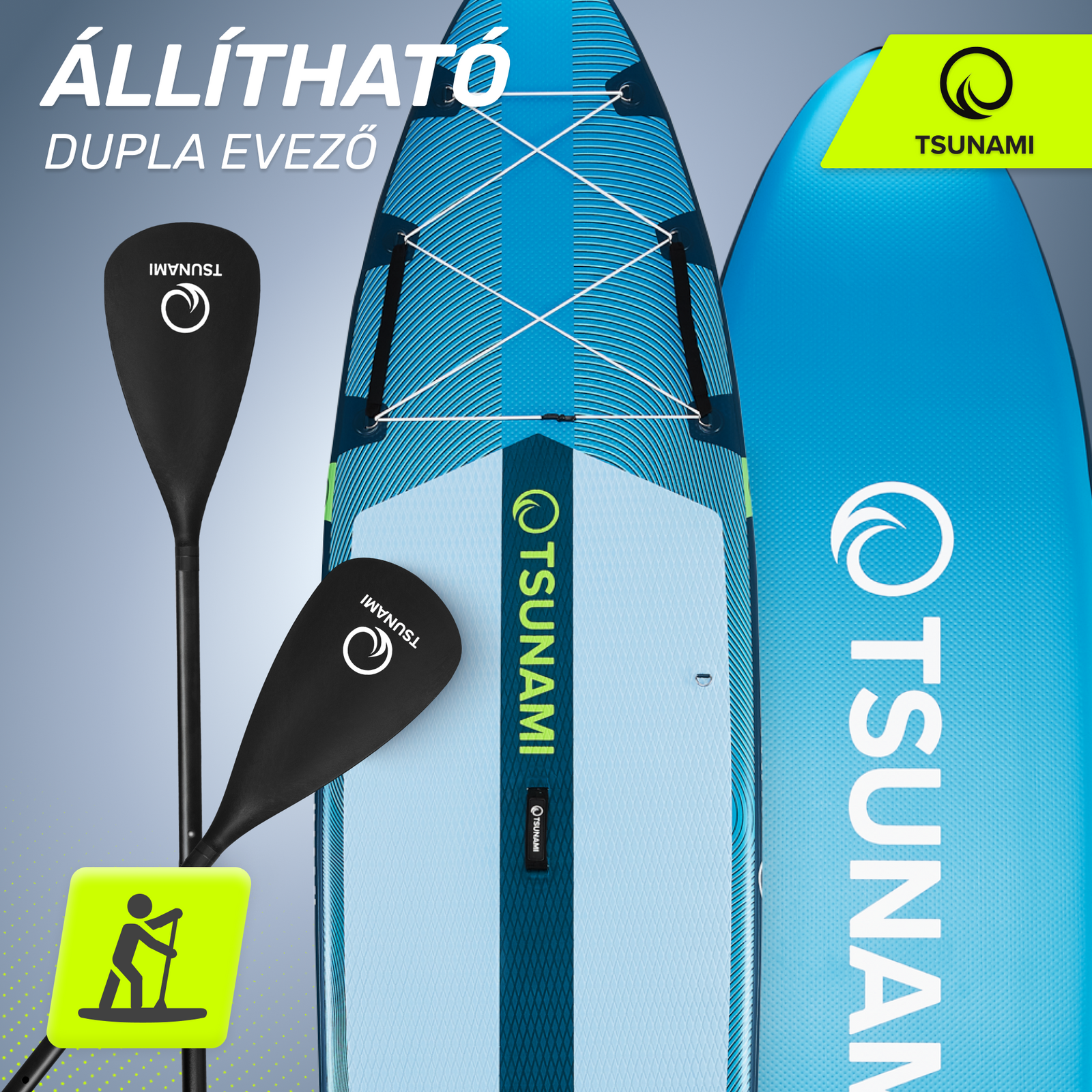 A TSUNAMI SUP PRO deszka szettje állítható, kétlapátos evezőt, biztonsági pórázt és minden szükséges tartozékot tartalmaz, így további költségek nélkül kezdhetsz bele ebbe a sportba.