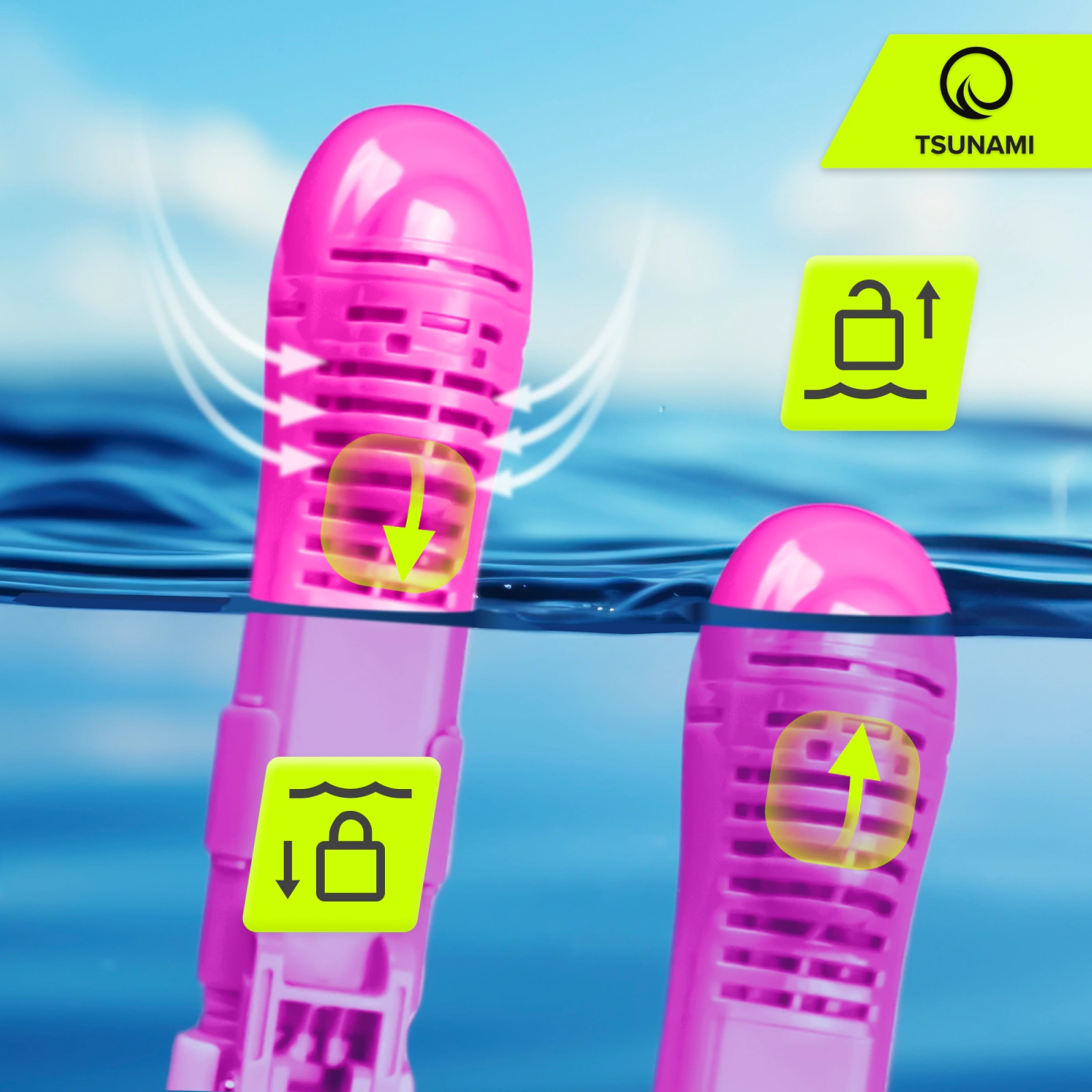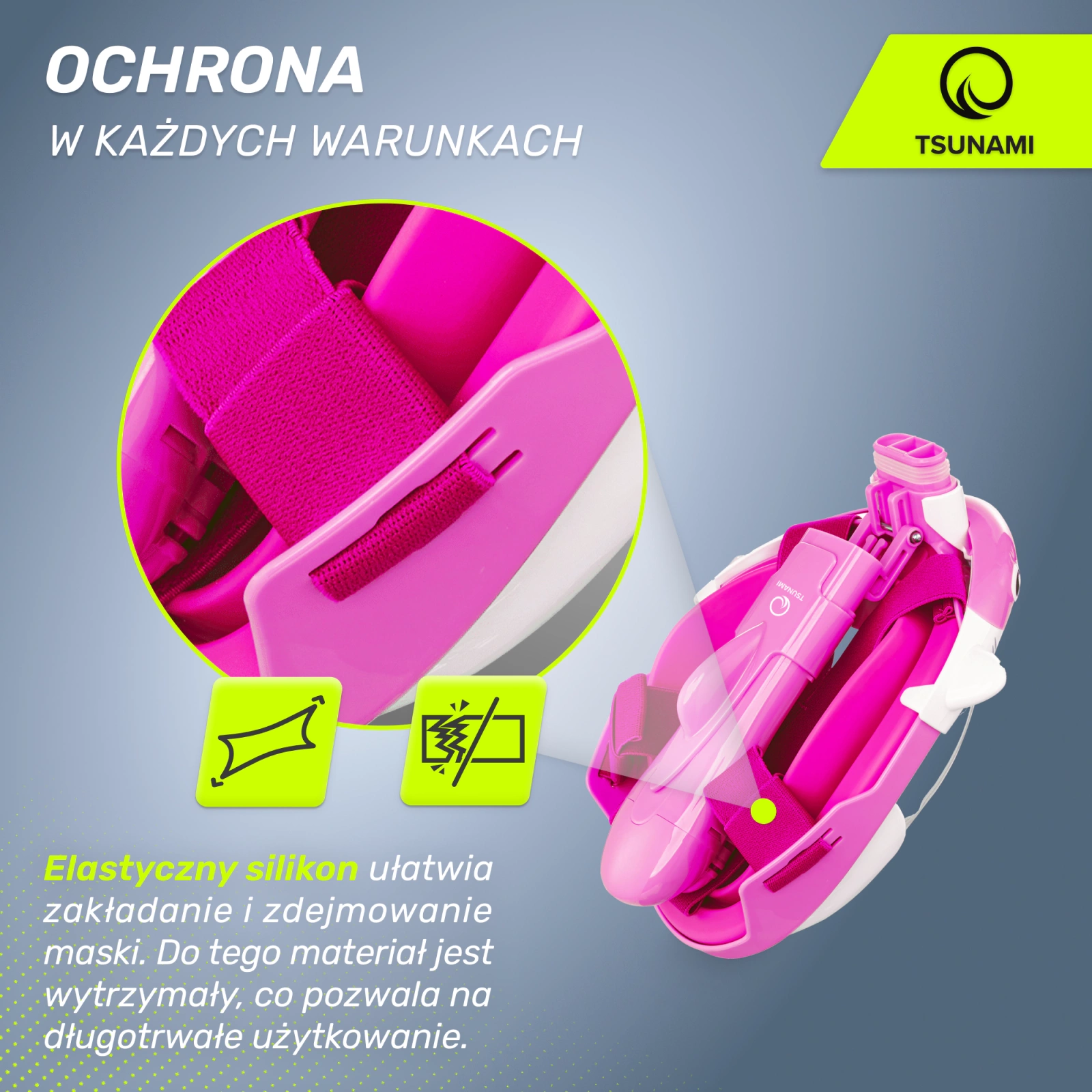 A TSUNAMI gyermek teljes arcú búvármaszk felejthetetlen élményt nyújt gyermekeinek a vízi tevékenységek során. Ez egy nélkülözhetetlen felszerelés minden tengerre vagy tóra tett kiránduláshoz. A maszk garantálja a biztonságot az úszás és a búvárkodás során, az érdekes bőrminta és a 3D elemek pedig változatossá teszik a vízben való szórakozást. A TSUNAMI maszk panorámás kilátással és kényelmes kialakításával maximális kényelmet garantál búvárkodás közben. Ez teljeskörű, ezért megengedi a szabad mozgást a felszínen és a víz alatt egyaránt, ami még izgalmasabbá tesz minden felfedezést.