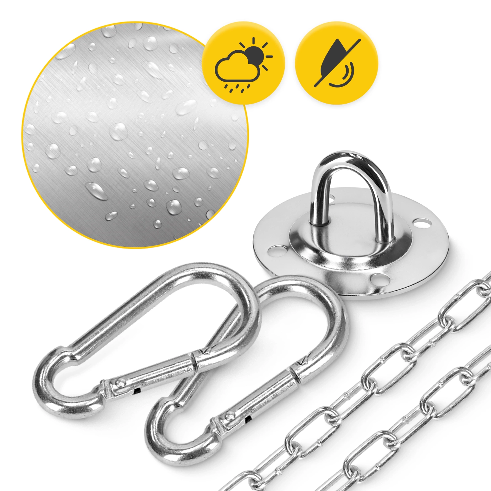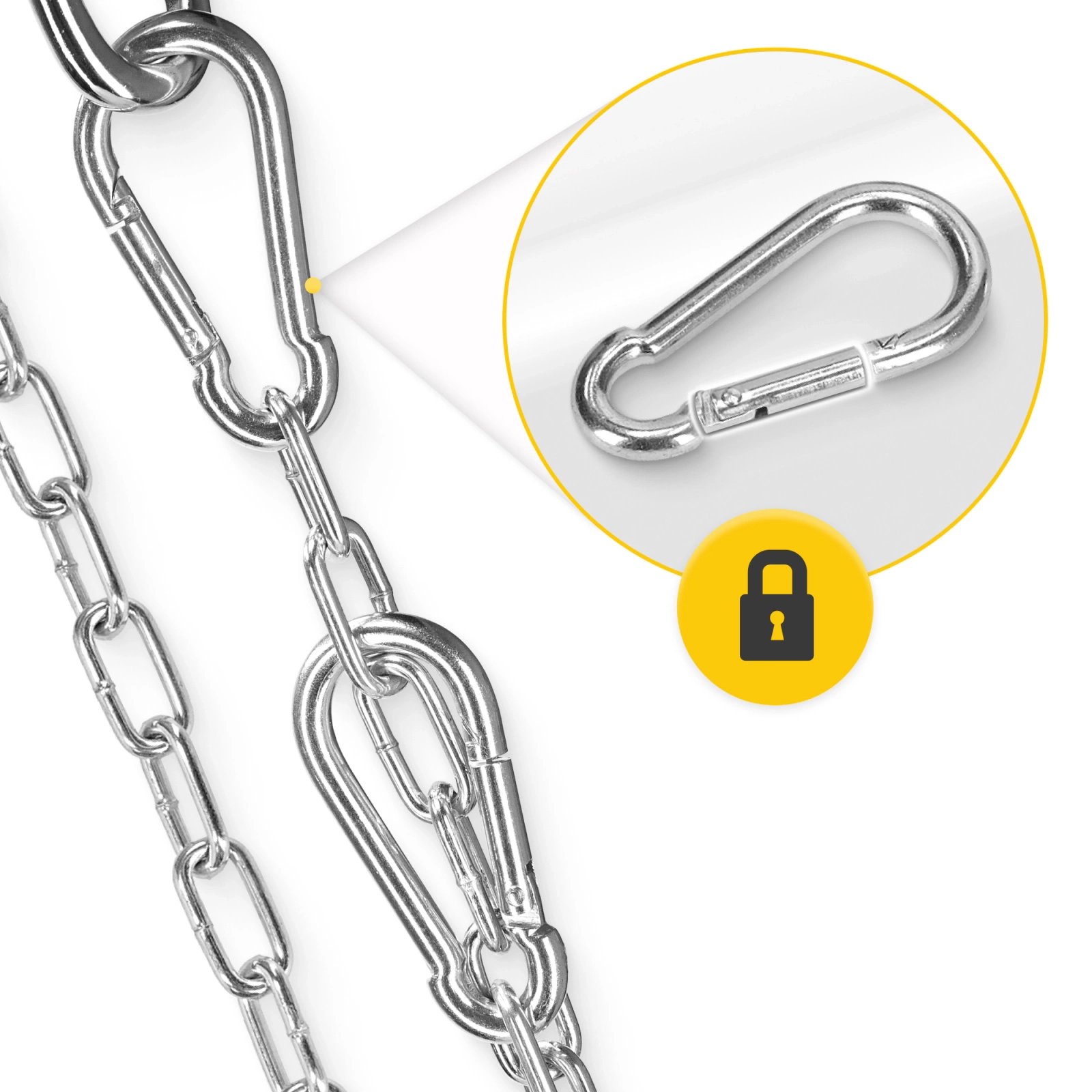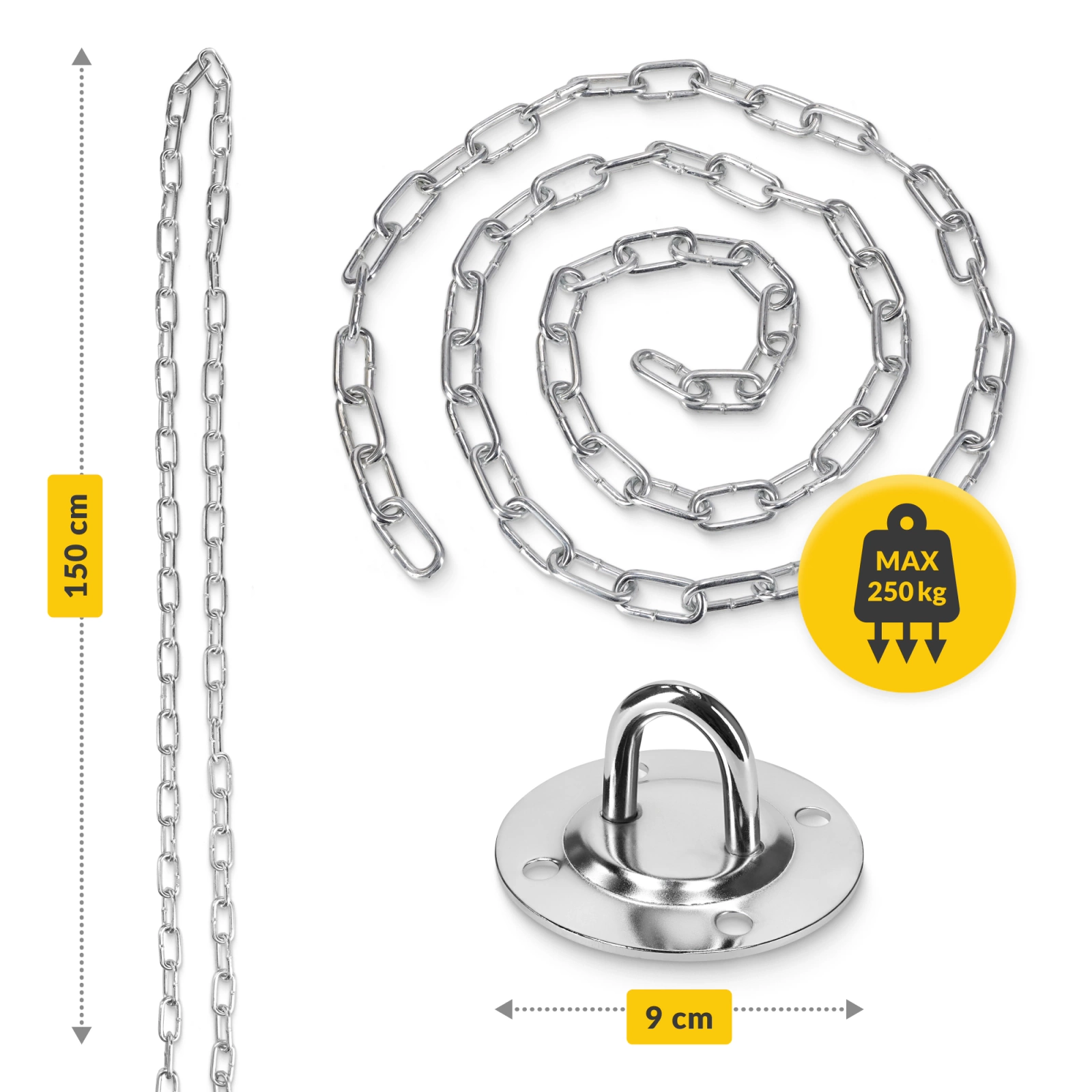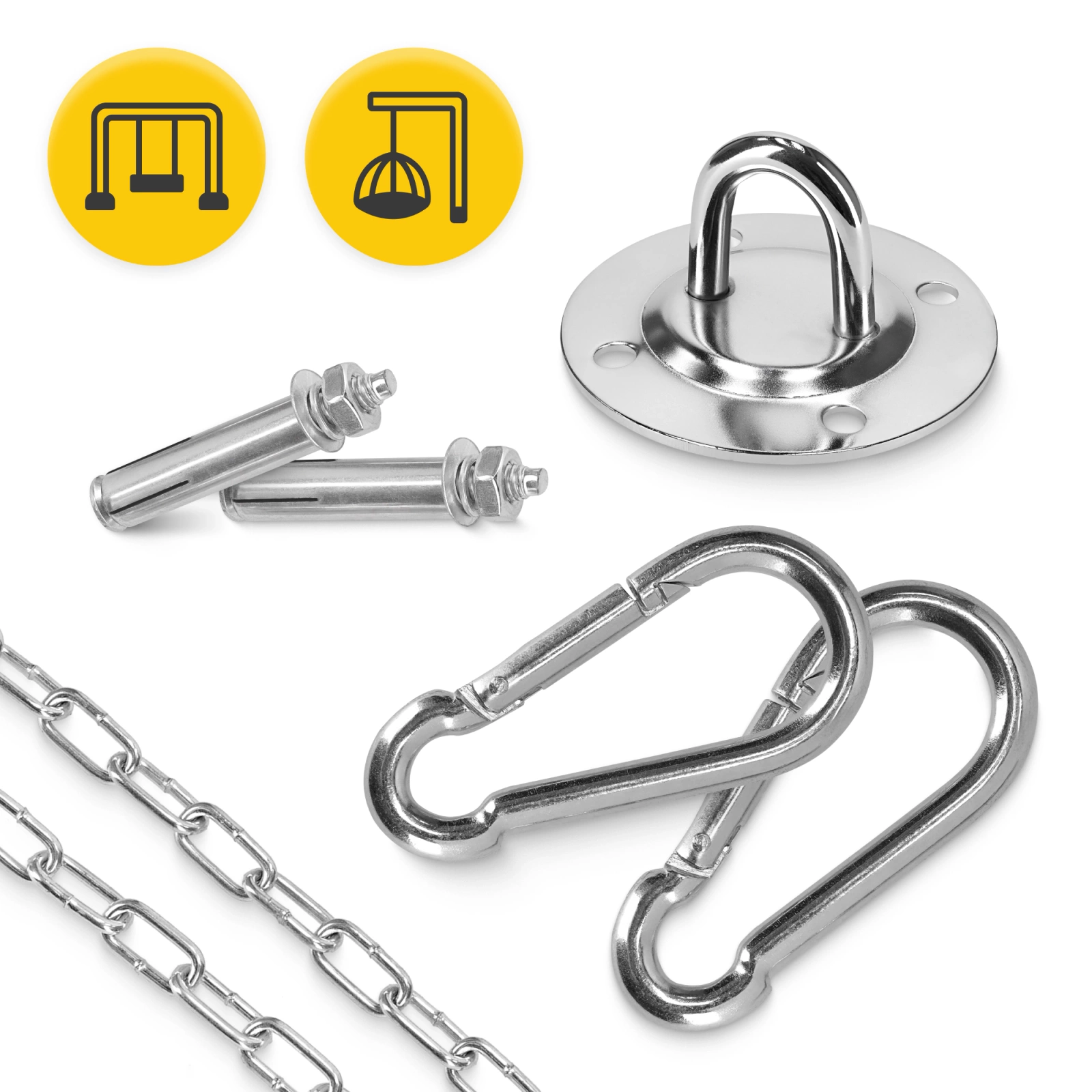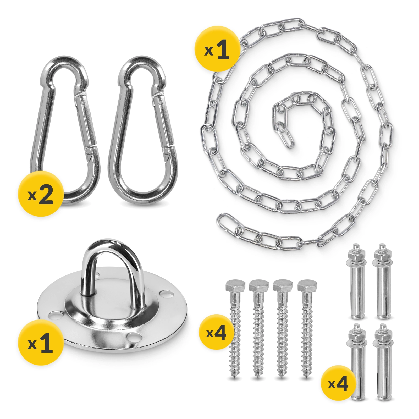 ✔️ A készlet tartalma: acél mennyezeti rögzítő, 2 karabiner, 4 csavar, 4 táguló dübel, erős 150 cm-es lánc.