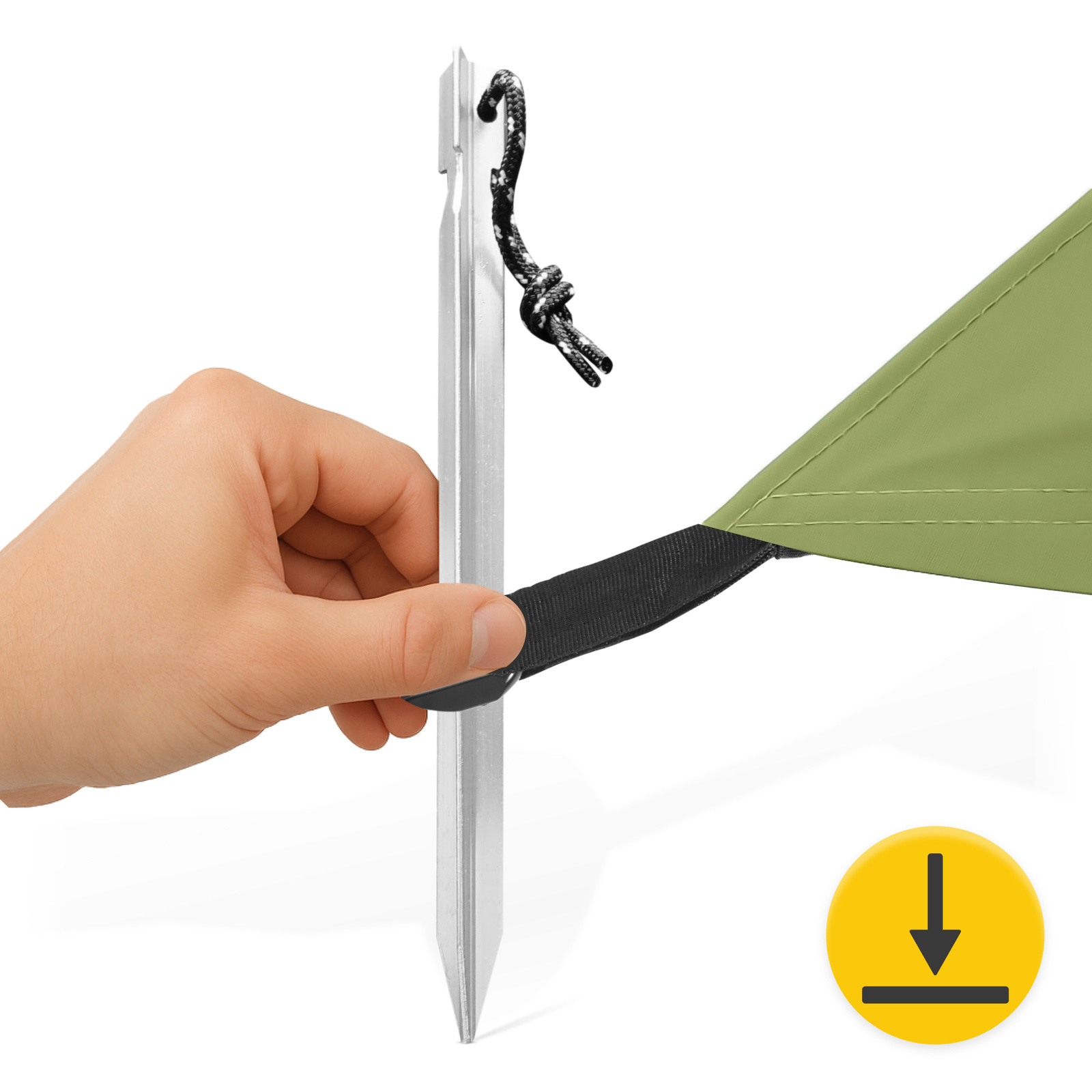 ▶️ Rögzítse a lepedőt a talajhoz csapok vagy kötelek segítségével. Minden sarkot egyenletesen feszítsen ki.