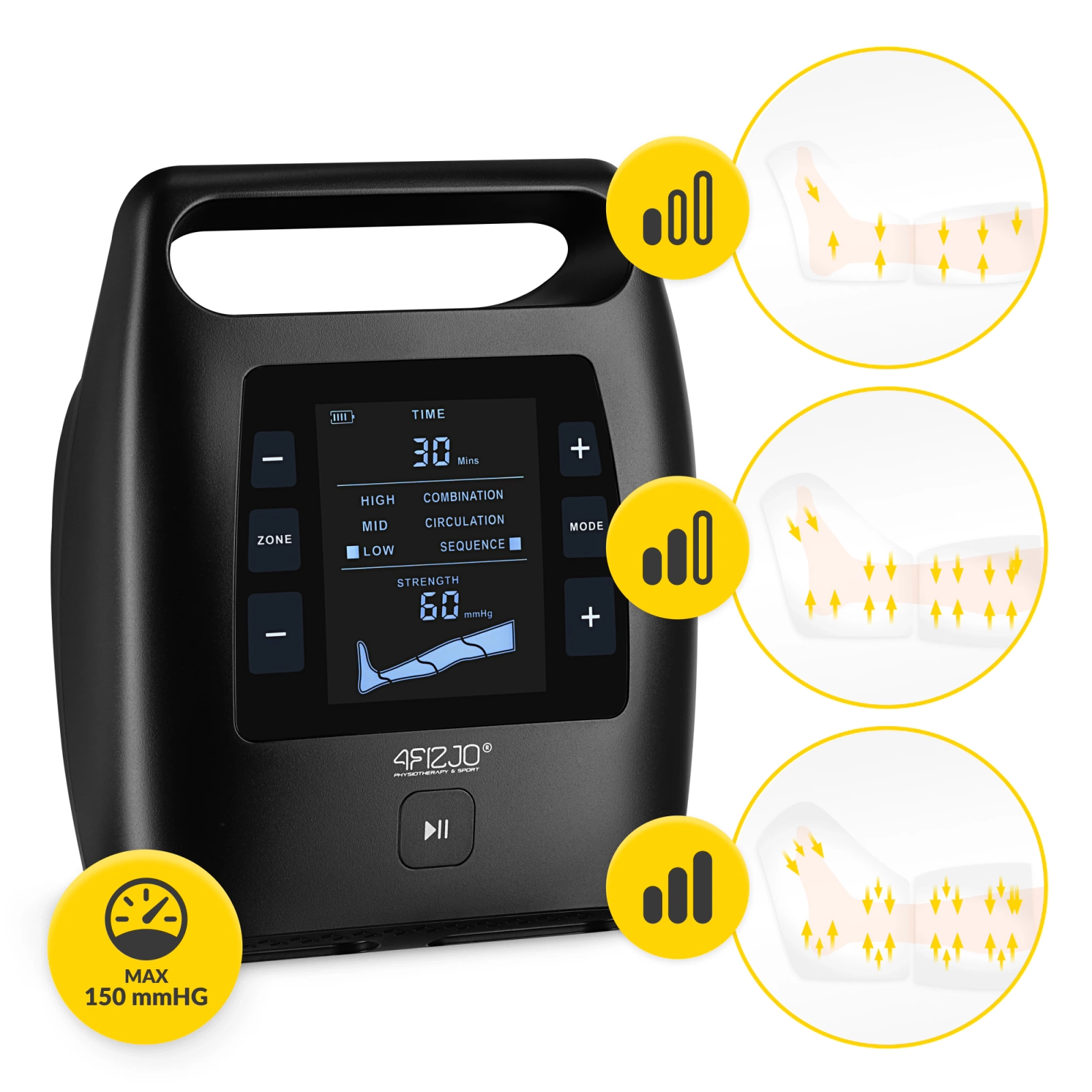 ▶️ 3. mód: Az 1. és 2. módot kombináló kompressziós masszázs - intenzív kompressziós masszázs, amely serkenti a keringést és eltávolítja a felesleges vizet a testből, visszaadva a lábak könnyedség érzetét.