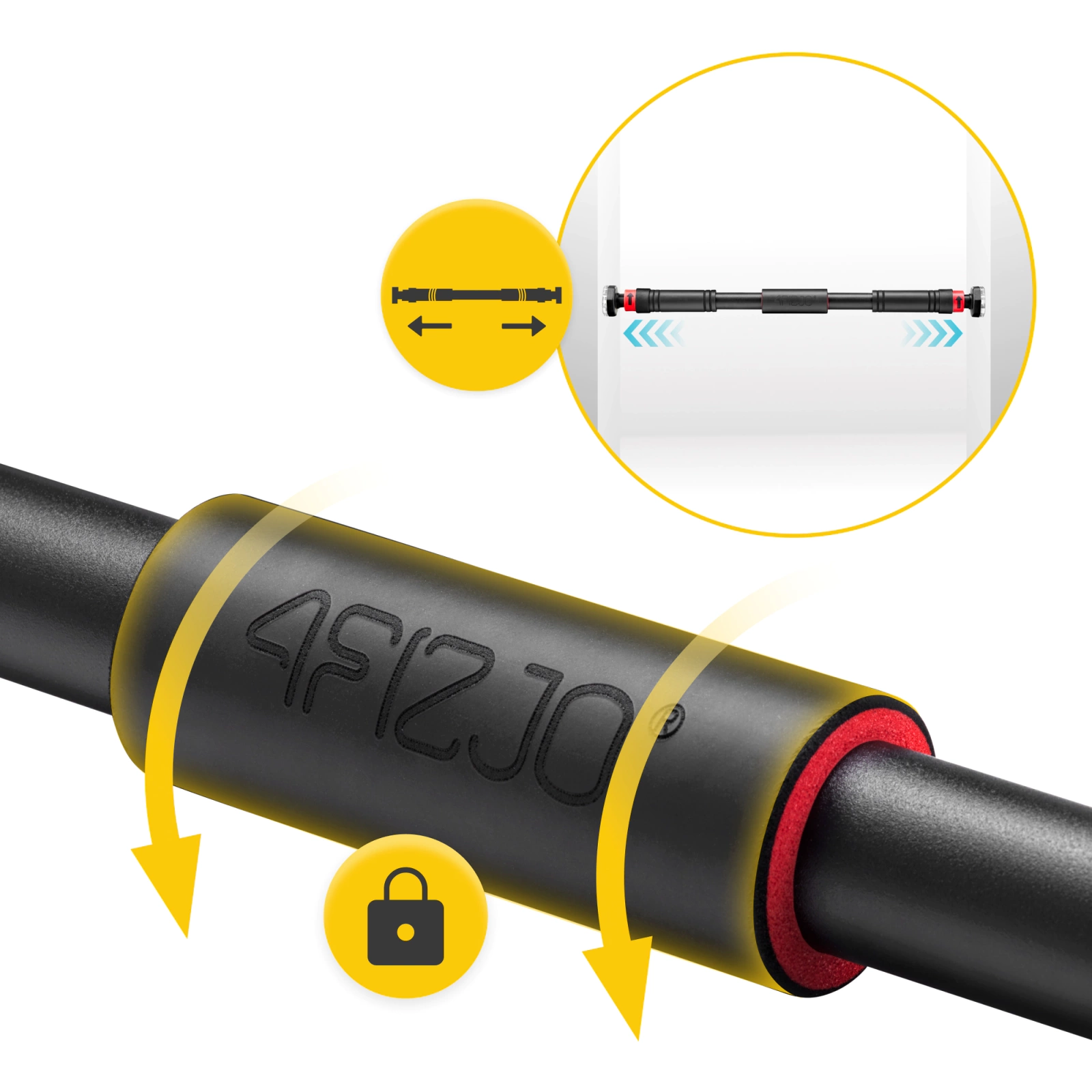 Egyszerű felszerelés – csak húzd vissza a rögzítőbilincseket, majd csavard ki a rúd karjait, hogy pontosan illeszkedjen az ajtó szélességéhez.