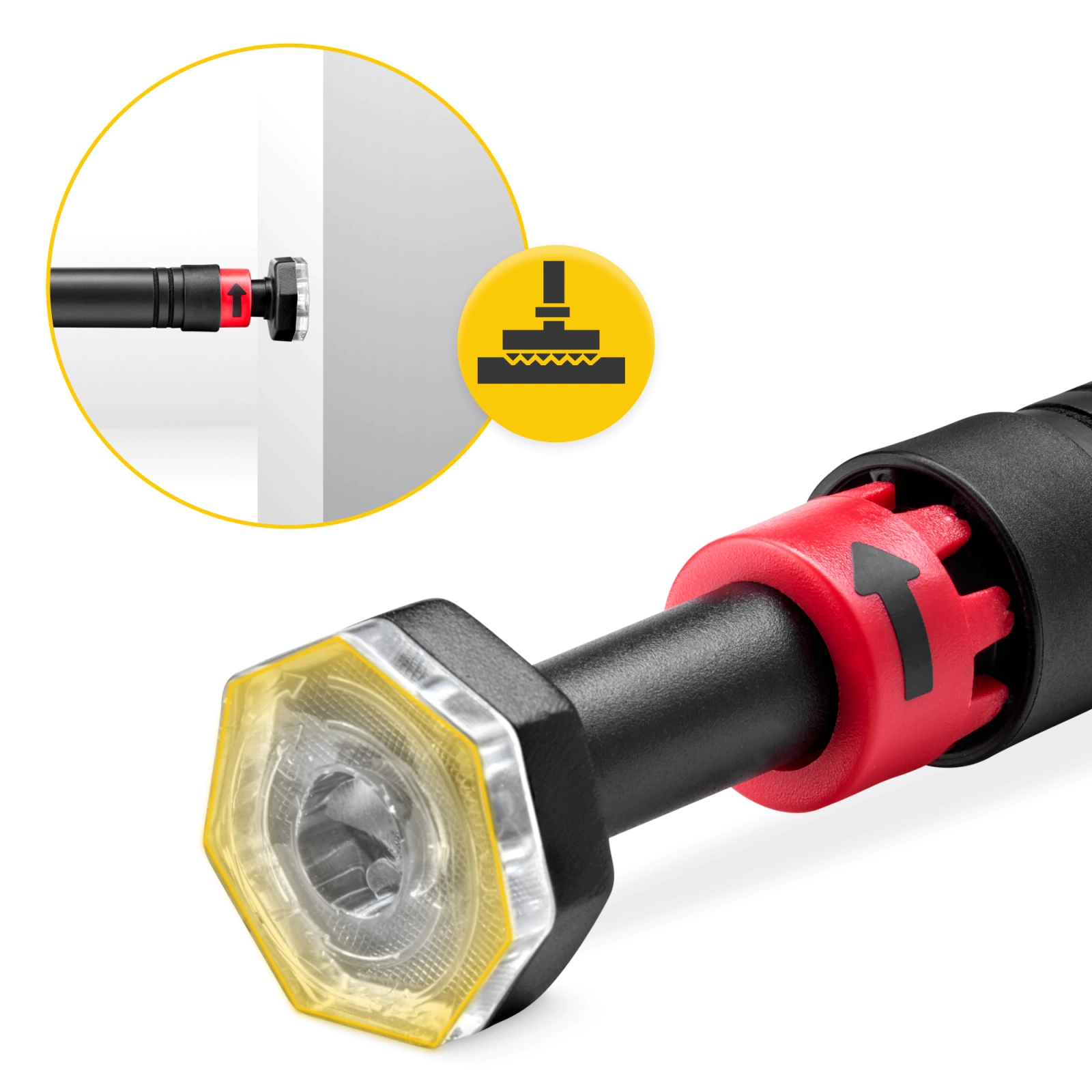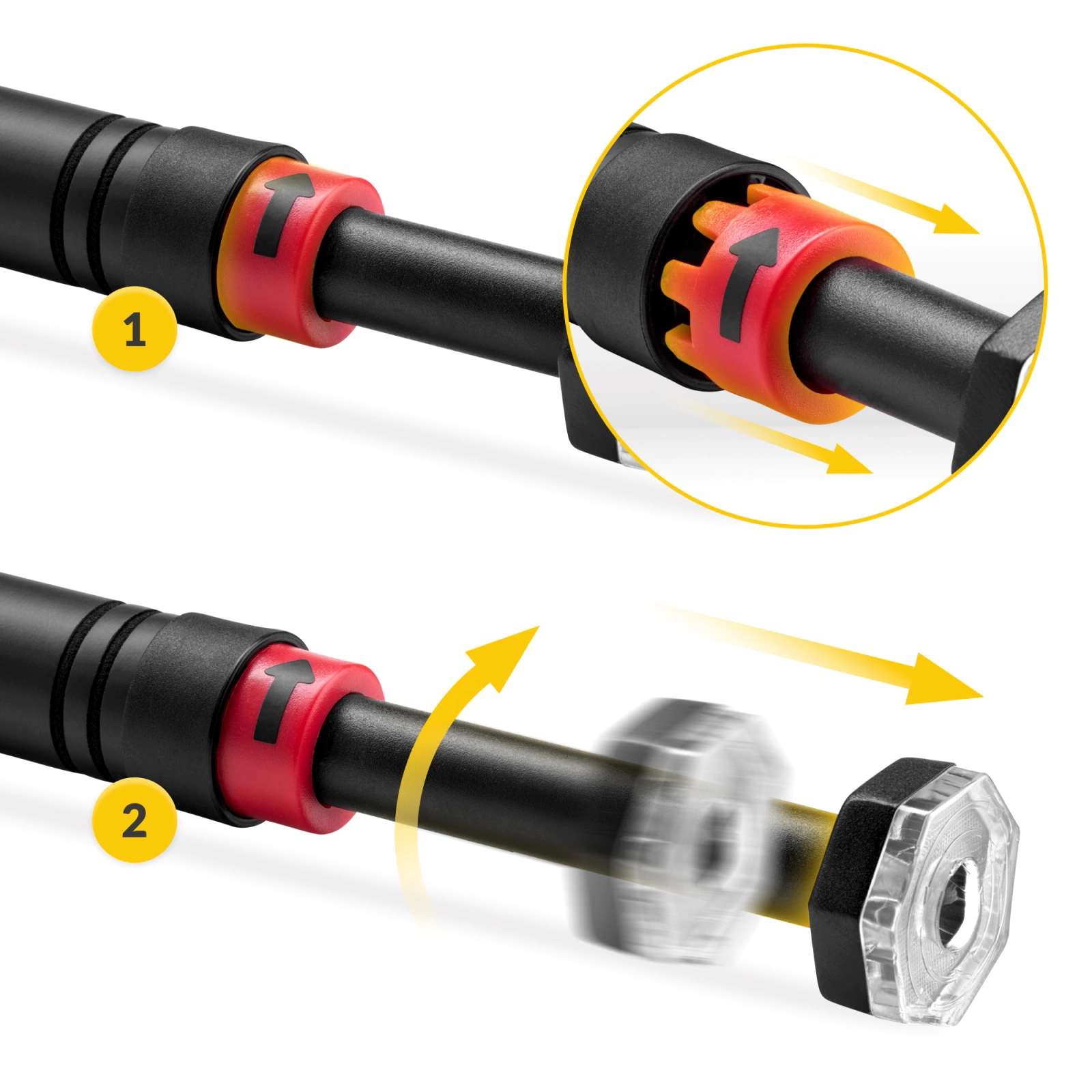 ▶️ Húzd vissza a piros biztonsági rögzítőket a rúd közepe felé, úgy, hogy a kis „fogak” beleilleszkedjenek a nyílásokba.