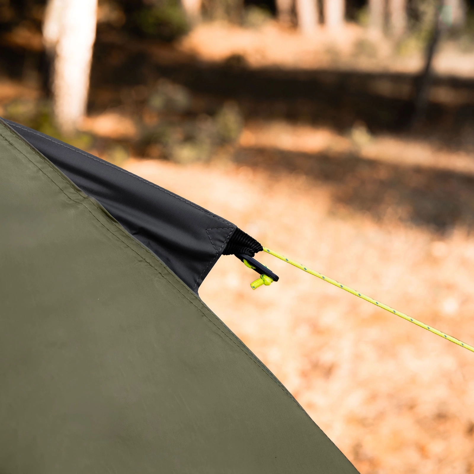 Nem kell aggódnia az eső vagy a reggeli harmat miatt. A sátor teteje vízálló poliészterből (4000 mm H₂O), a padló pedig szivárgásálló polietilénből (6000 mm H₂O) készült. Ezenkívül a varratokat gondosan leragasztották, hogy megakadályozzák a szivárgást a nedvességre leginkább hajlamos területeken.