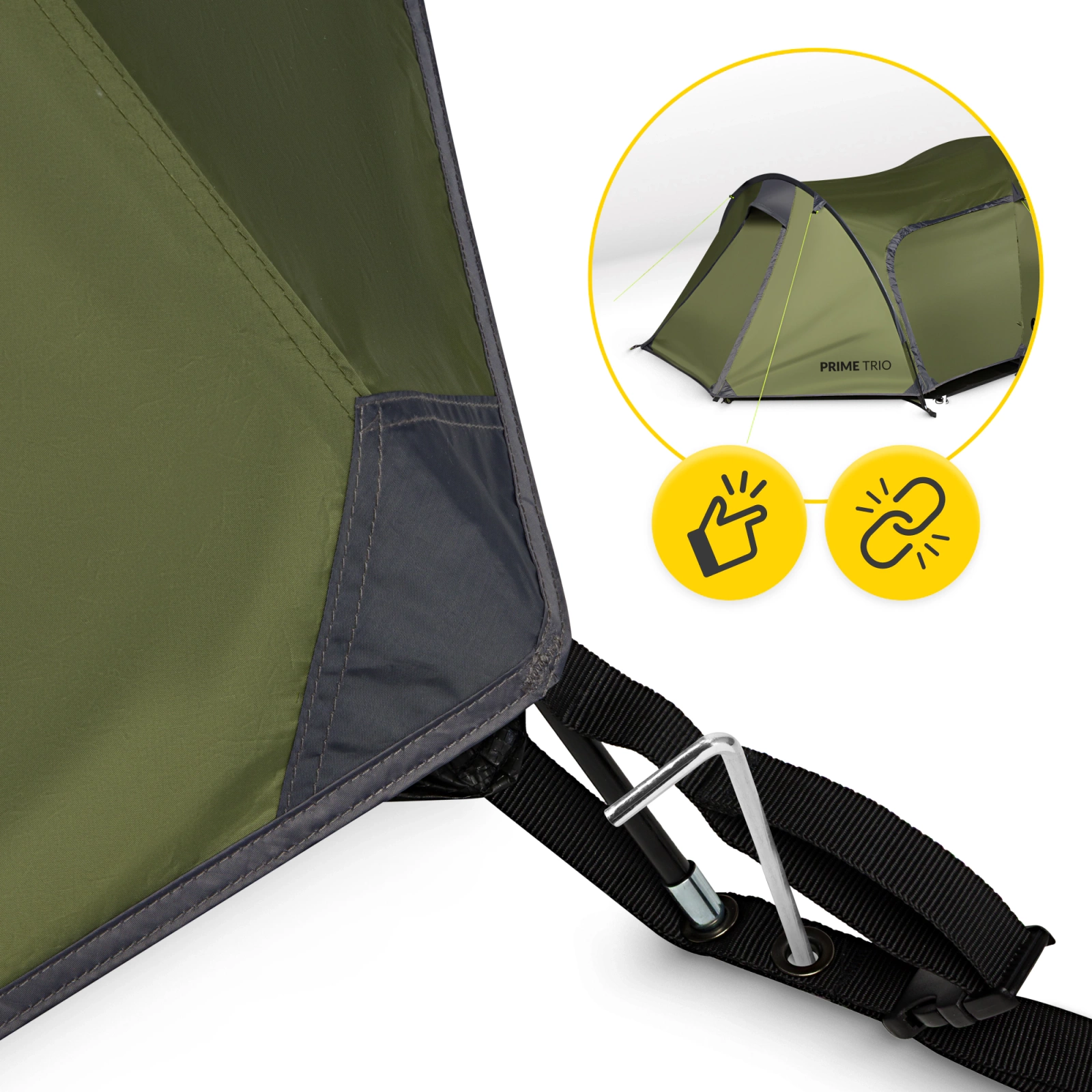 A PRIME TRIO MOUNTAIN GOAT túrasátor praktikus és sokoldalú megoldás bármilyen expedícióhoz. Kempingtúrákon éppúgy bizonyíthat, mint igényesebb terepviszonyok között.