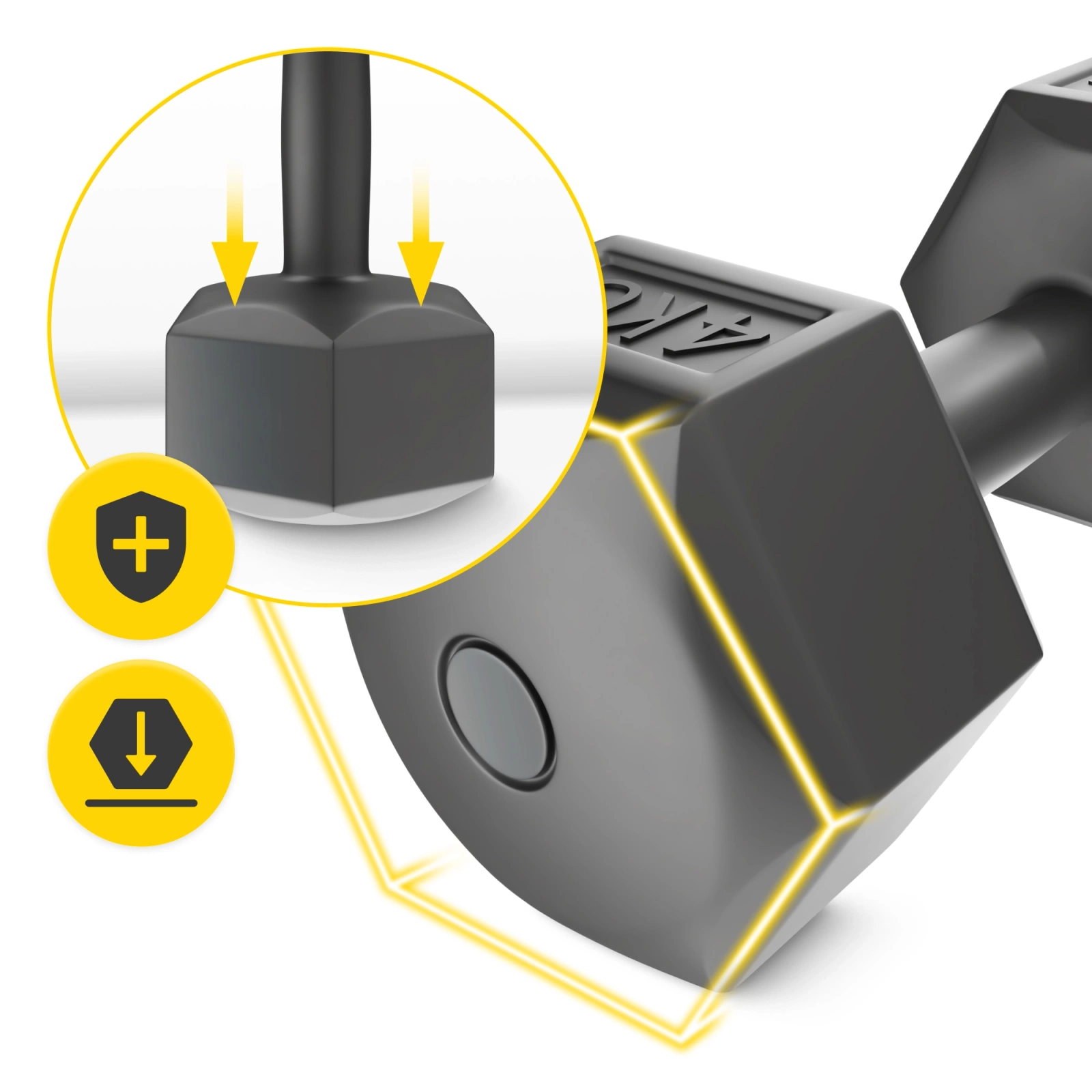 ▶️ A súlyzók bevonata megvédi a padlót a karcolásoktól, a hatszögletű forma pedig megakadályozza, hogy a felszerelés kontrollálatlanul guruljon a padlón, ami növeli a biztonságot edzés közben.