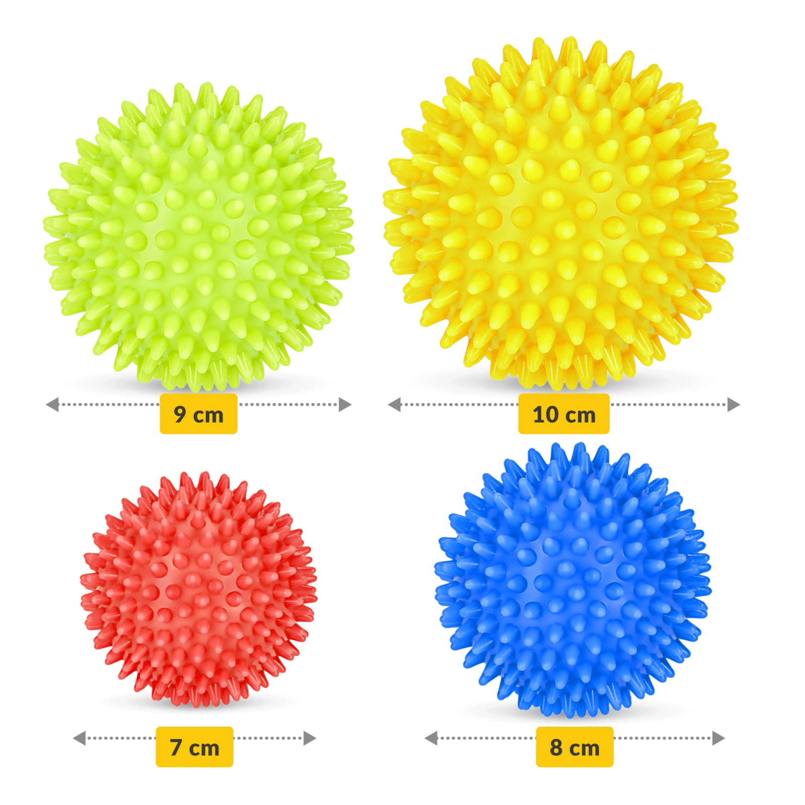 ✔️ A csomag tartalma: 1 db 10 cm-es tüskés masszázslabda, 1 db 9 cm-es tüskés masszázslabda, 1 db 8 cm-es tüskés masszázslabda, 1 db 7 cm-es tüskés masszázslabda