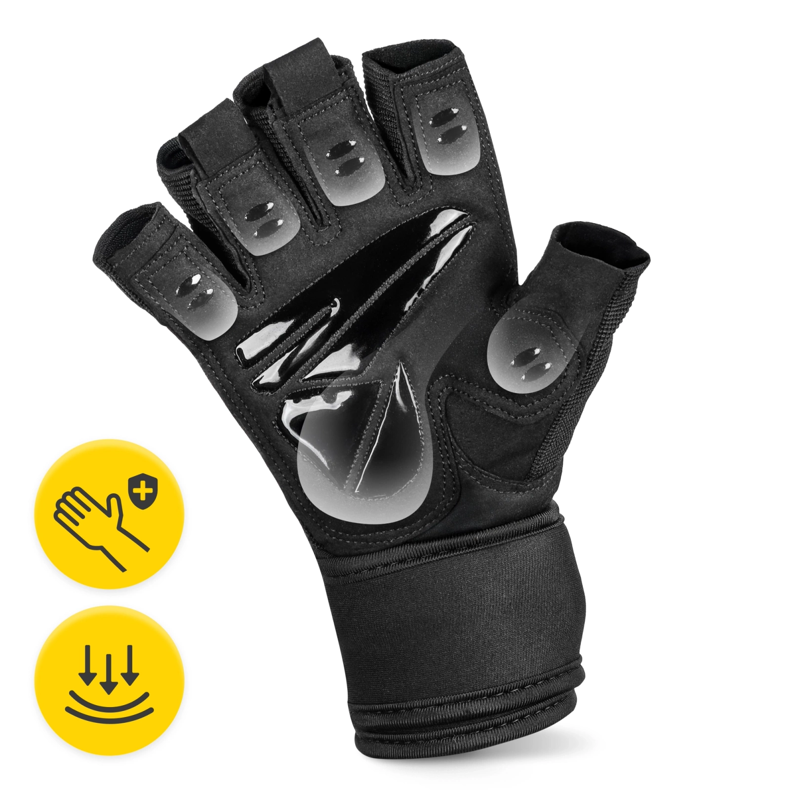 A PRO edzőkesztyű belső része keményített gumiból készült csúszásgátló pöttyökkel van bevonva, amelyek hatékonyan erősítik a fogást, és megakadályozzák, hogy a súlyok kicsússzanak a kezedből.