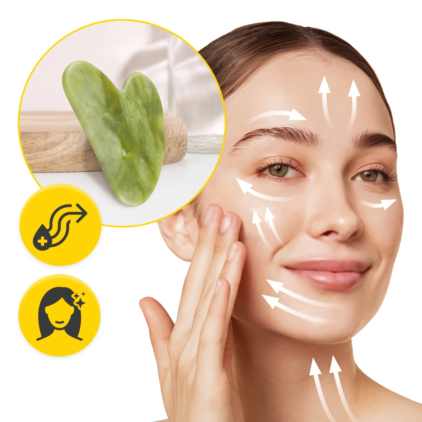 A Gua Sha masszázs egy népszerű szépségápolási kezelés, amely feszesíti a bőrt, csökkenti a ráncokat és enyhíti a duzzanatokat. A klasszikus Gua Sha kő természetes zöld jádéből készül, sima felülettel és lekerekített, szív alakú kialakítással rendelkezik. Ezért illeszkedik a lemez nagyon jól az arcvonásokhoz.