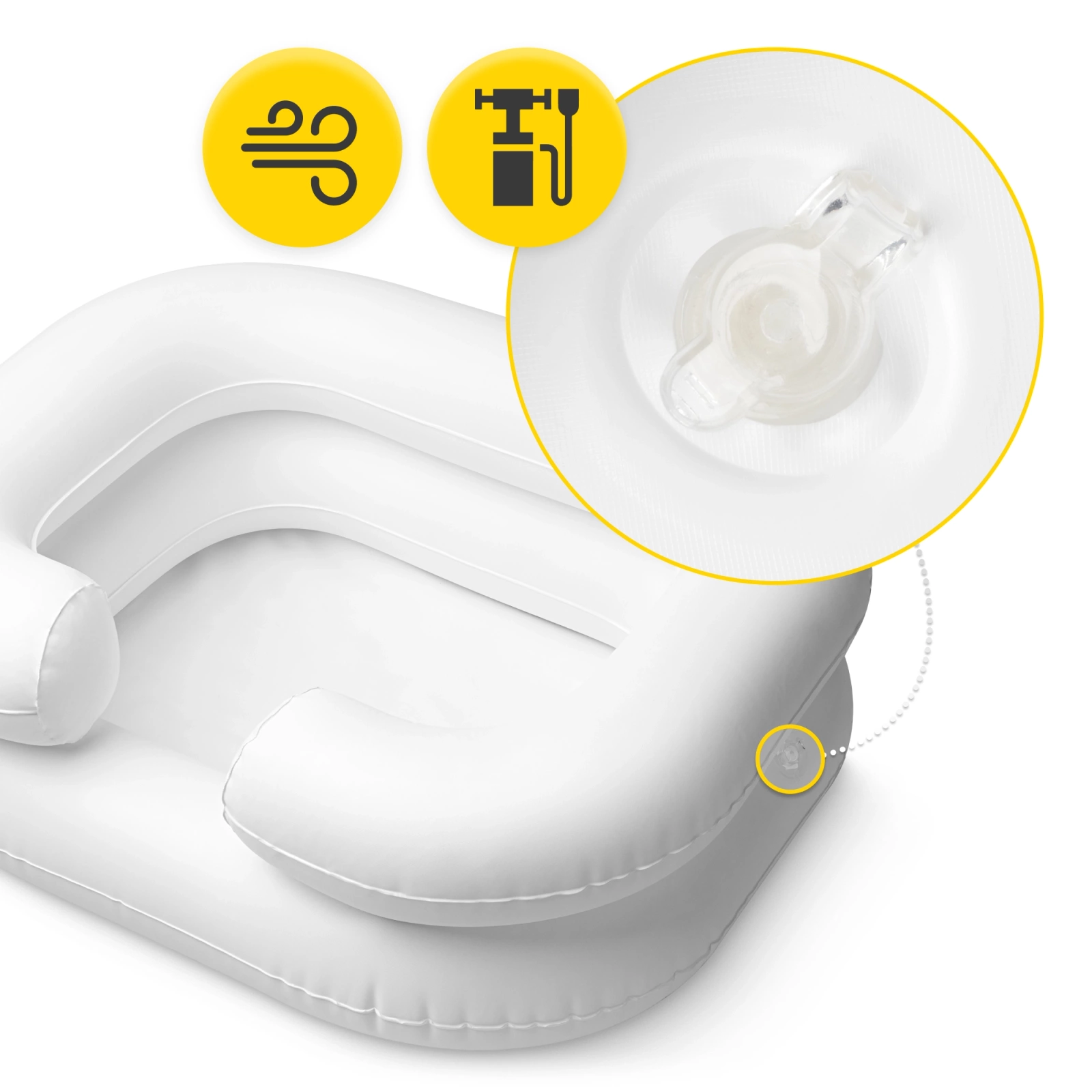 Első lépésként fújd fel a medencét, amit akár a pumpával is megtehetsz. Miután a medence fel lett fújva, helyezd a beteg személy feje alá, a nyak környékén lévő kijelölt helyre. Ha szeretnéd, a tál alá tehetsz műanyag fóliát vagy vízálló lepedőt, hogy megóvd az ágyneműt a víztől.