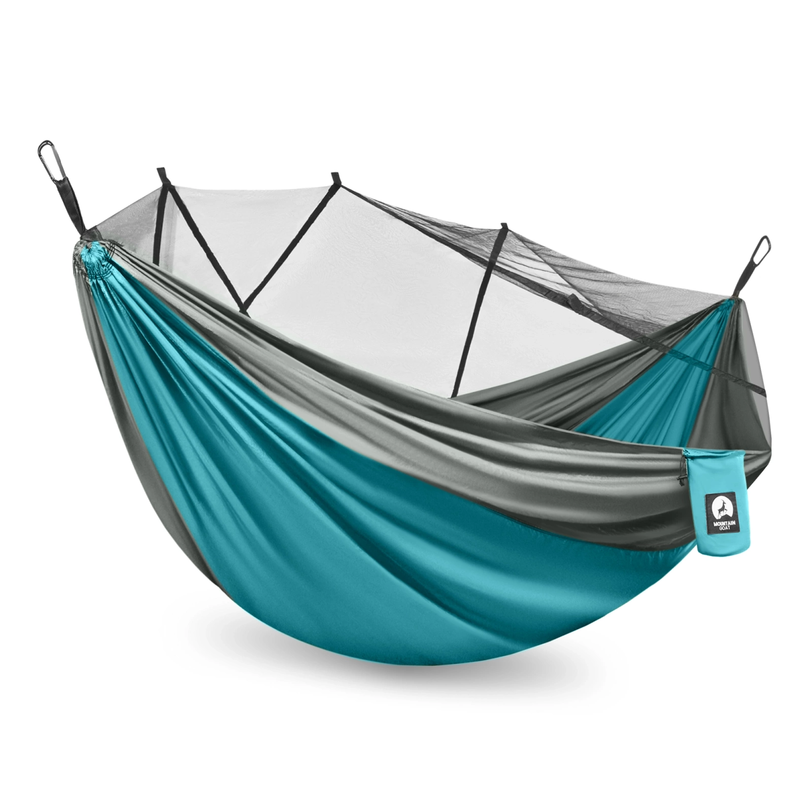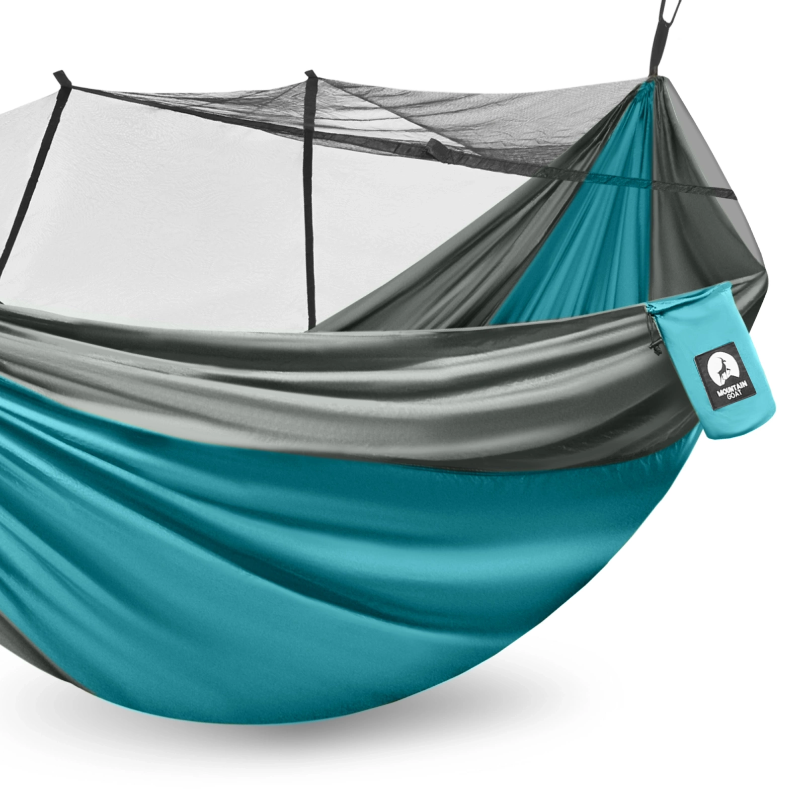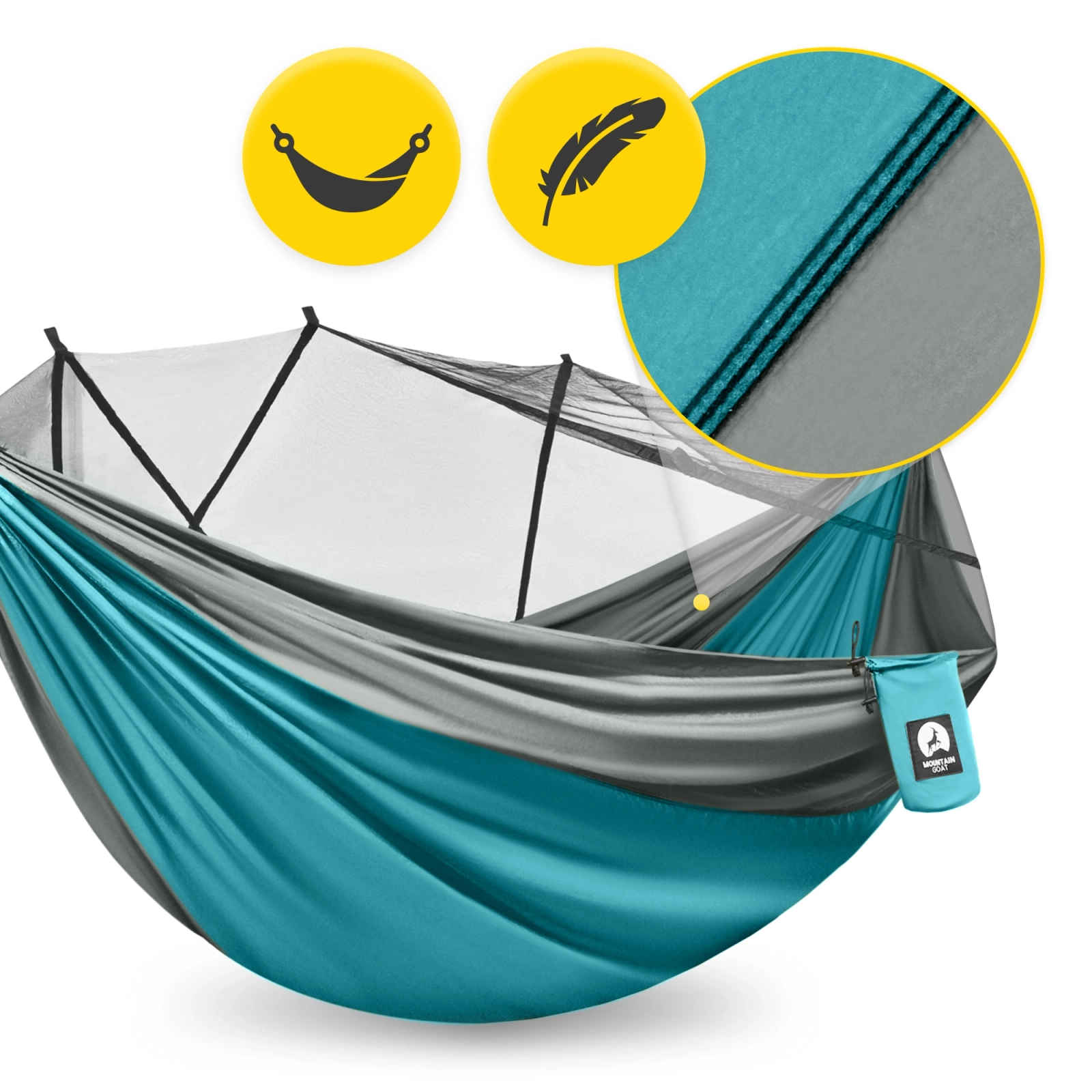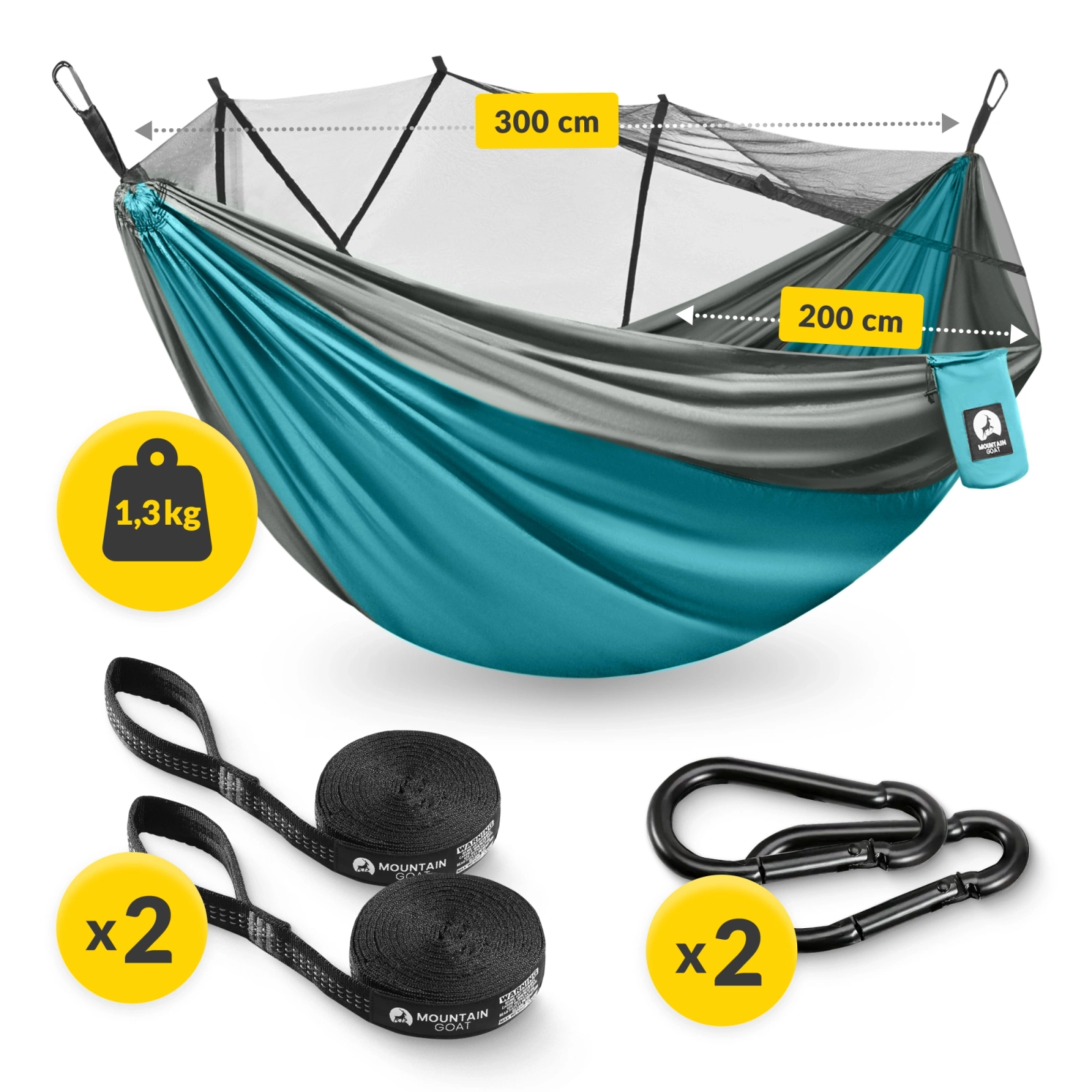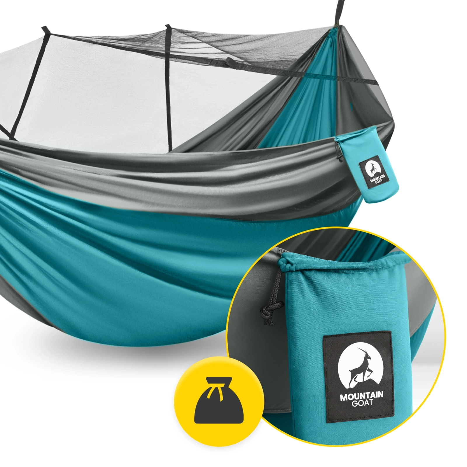 Cauți un hamac confortabil pentru două persoane, care să fie potrivit în orice condiții? Alege modelul MOUNTAIN GOAT cu plasă de țânțari încorporată, care te protejează eficient împotriva insectelor. Hamacul este ideal atât pentru călătorii, cât și pentru tabere sau drumeții montane. Îl poți folosi cu succes și în grădina ta sau în parc!