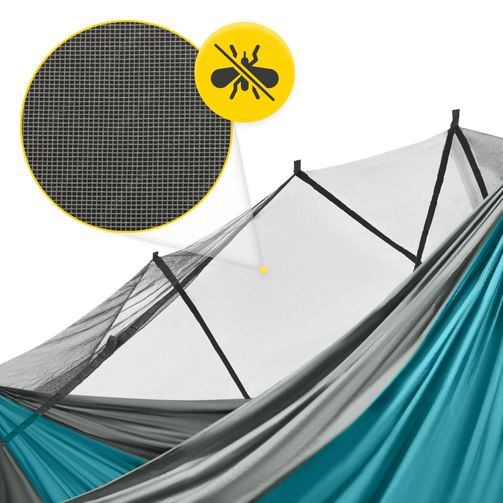 Plasa durabilă este fixată permanent pe hamac, astfel încât nu trebuie să o desfaci de fiecare dată.