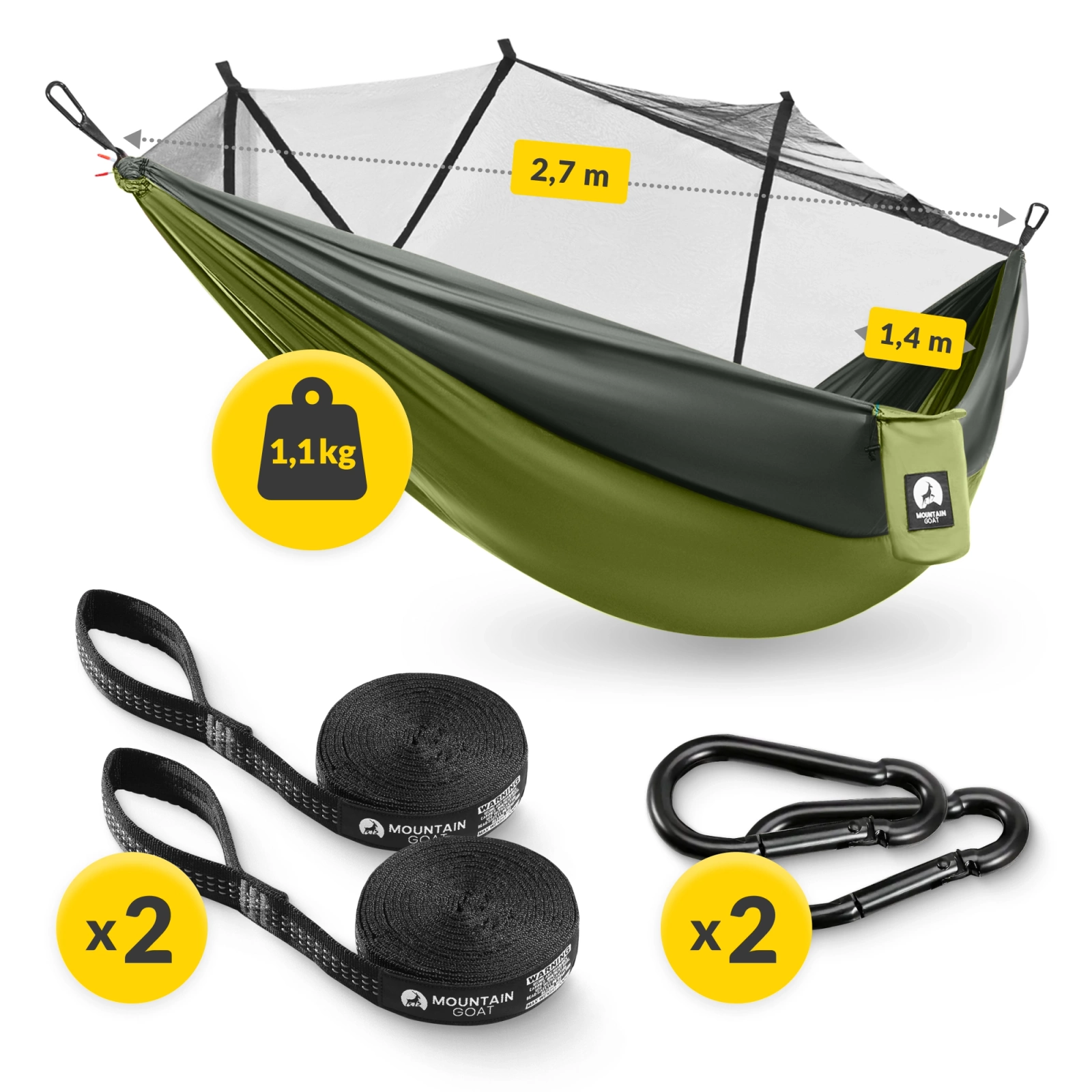 Ha a szúnyoghálóval ellátott MOUNTAIN GOAT egyszemélyes függőágyat választod, a szett tartalmazza a hevedereket és a karabinereket, így bárhova problémamentesen felakaszthatod a függőágyat.